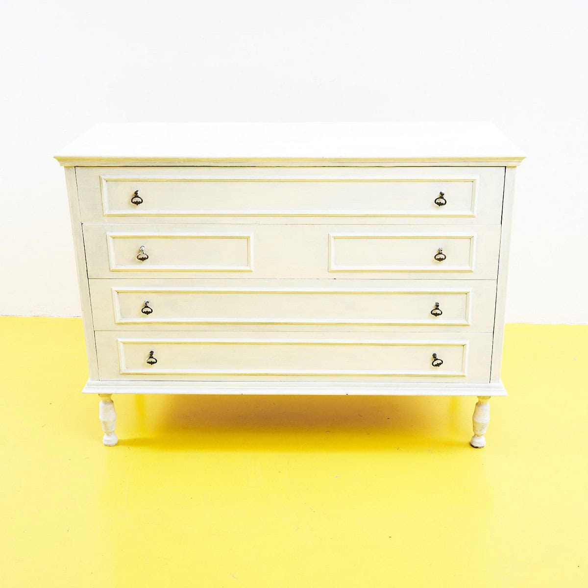 Questa raffinata cassettiera in stile vintage presenta un design semplice ma sofisticato, perfetta per arricchire qualsiasi ambiente domestico. Realizzata in legno di alta qualita', la sua finitu... Questa raffinata cassettiera in stile vintage presenta un design semplice ma sofisticato, perfetta per arricchire qualsiasi ambiente domestico. Realizzata in legno di alta qualita', la sua finitura bianca conferira' luminosita' a stanza da letto, corridoio o soggiorno. Caratterizzata da quattro cassetti spaziosi, ognuno dotato di eleganti maniglie in metallo, offre un ampio spazio per riporre vestiti, accessori o documenti. Le linee pulite e il particolare design dei piedini la rendono un oggetto di arredamento versatile, ideale sia per contesti moderni che per quelli piu' classici. In ottime condizioni, questa cassettiera rappresenta un'opportunita' unica per gli amanti del design e dell'arredamento d'epoca. Altro