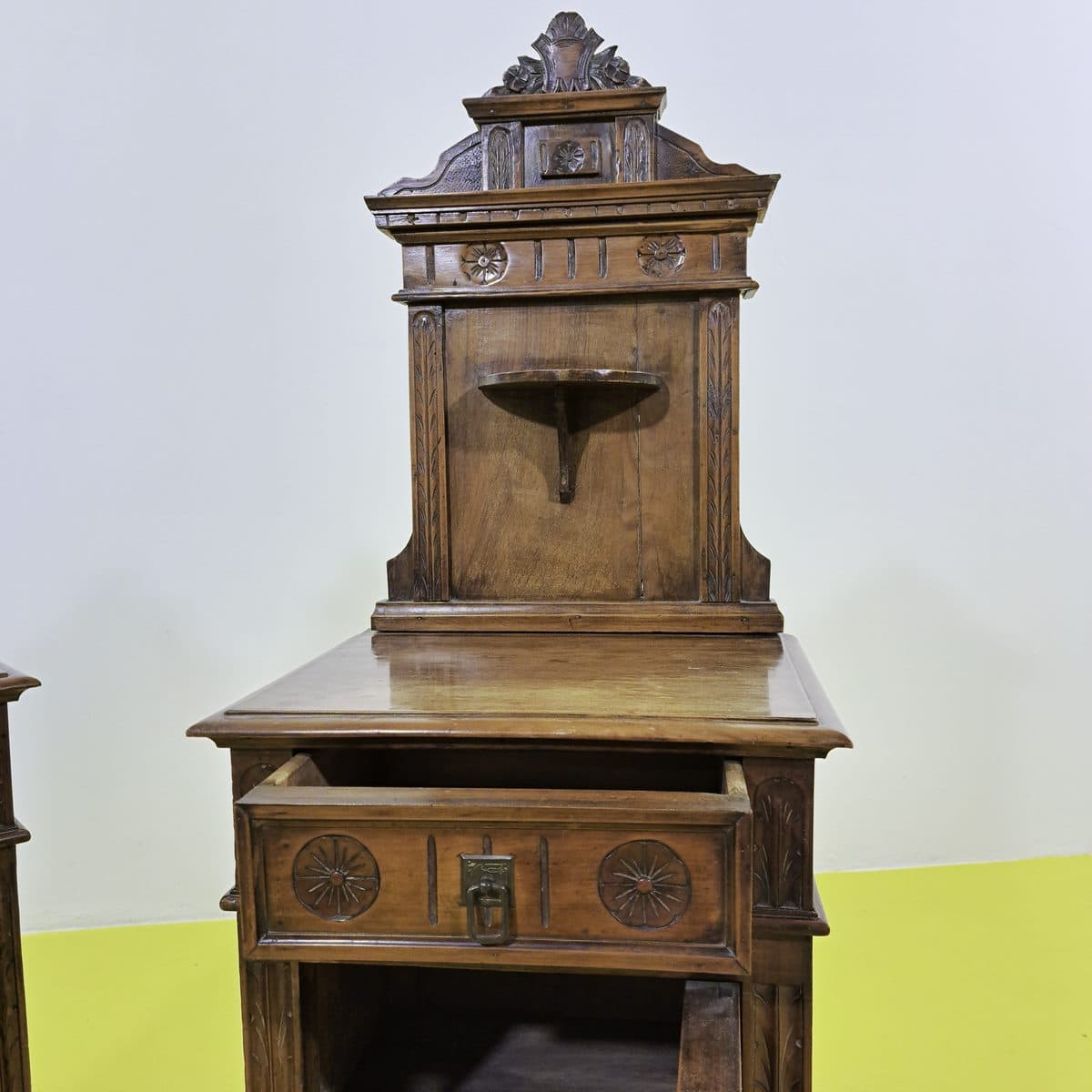 Questa coppia di comodini rappresenta un'affascinante espressione di artigianato antico, con dettagli raffinati che esaltano la struttura in legno. Le linee classiche dei mobili sono impreziosite... Questa coppia di comodini rappresenta un'affascinante espressione di artigianato antico, con dettagli raffinati che esaltano la struttura in legno. Le linee classiche dei mobili sono impreziosite da eleganti intagli e decorazioni floreali, il che li rende perfetti per aggiungere un tocco di sofisticata eleganza a qualsiasi camera da letto. Con funzionali cassetti e spazi di stoccaggio, questi comodini combinano estetica e praticita' . Pur mostrando lievi segni del tempo, il legno mantiene la sua bellezza naturale e il fascino dell'epoca. Altro