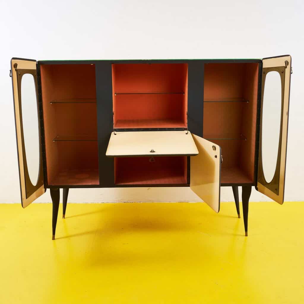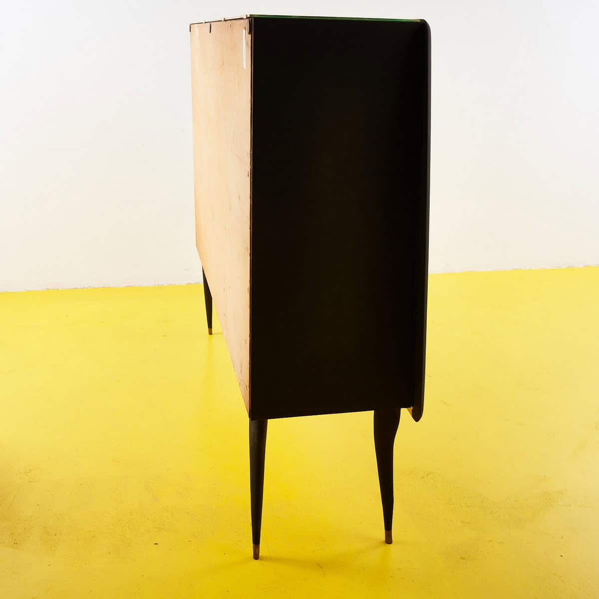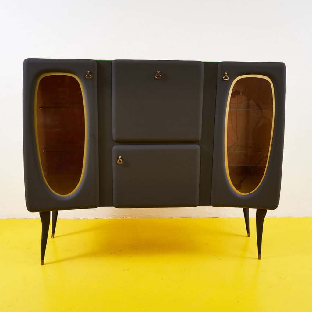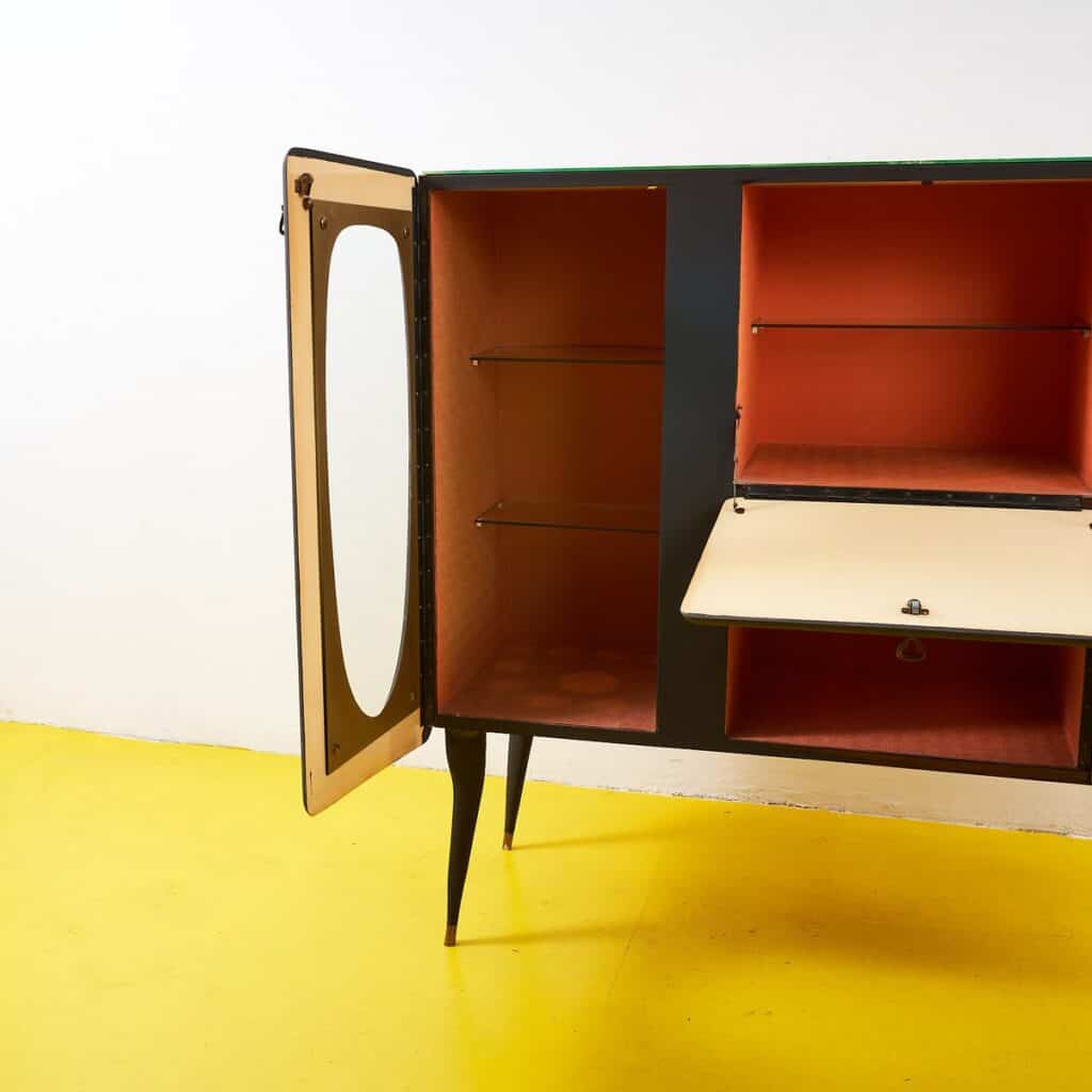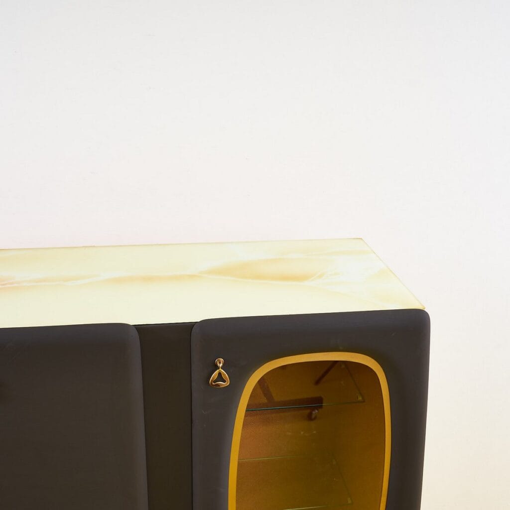 Scoprite l'eleganza senza tempo di questa credenza dal design mid-century. Con un'abbinamento di tonalita' scure e dettagli dorati, il suo aspetto unico si distingue per delle curve aff... Scoprite l'eleganza senza tempo di questa credenza dal design mid-century. Con un'abbinamento di tonalita' scure e dettagli dorati, il suo aspetto unico si distingue per delle curve affascinanti e una funzionalita' pratica. All'interno, ampi spazi di stoccaggio offrono soluzioni per organizzare i vostri oggetti con stile. Perfetta per arredare un soggiorno o una sala da pranzo, questa credenza e' piu' di un semplice mobile: e' un pezzo di design che racconta una storia. Ogni apertura rivela un interno ben curato, pronto ad accogliere i vostri tesori in modo ordinato e chic. Altro