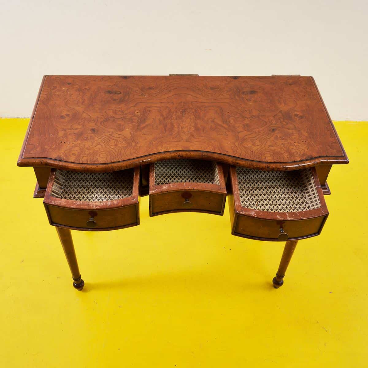 Scopri questa raffinata consolle in legno curvato, un pezzo unico che esprime eleganza e funzionalita'. Caratterizzata da linee sinuose e tre cassetti dal design ricercato, questa consolle si ada... Scopri questa raffinata consolle in legno curvato, un pezzo unico che esprime eleganza e funzionalita'. Caratterizzata da linee sinuose e tre cassetti dal design ricercato, questa consolle si adatta perfettamente a diversi ambienti, dal soggiorno all'ingresso. Realizzata con una maestria artigianale, il suo materiale pregiato offre una durabilita' senza pari, rendendola un investimento nel tempo. Perfetta per aggiungere un tocco di classe e stile vintage alla tua casa, questo oggetto di design incarna la bellezza senza tempo dell'arredamento classico. Altro