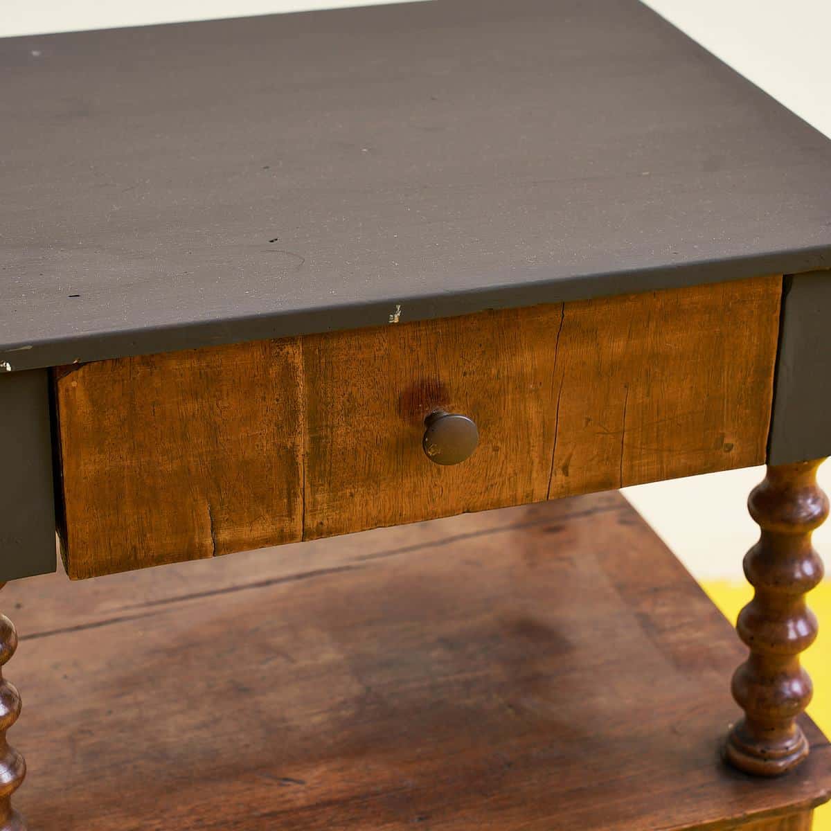 Scopri un pezzo unico di design vintage con questo tavolino antico, perfetto per ogni ambiente. Realizzato in legno pregiato, questo tavolino presenta un piano superiore scuro e un corpo in legno natu... Scopri un pezzo unico di design vintage con questo tavolino antico, perfetto per ogni ambiente. Realizzato in legno pregiato, questo tavolino presenta un piano superiore scuro e un corpo in legno naturale che ne esalta il carattere autentico. Il design e' arricchito da gambe a colonna torcigliata e da un pratico cassetto, ideale per riporre piccoli oggetti. Con un aspetto che parla di storia e tradizione, questo tavolino e' la scelta perfetta per chi cerca un tocco di classe e originalita' nei propri spazi. Perfetto anche come complemento d'arredo in un salotto o in un ingresso. Altro