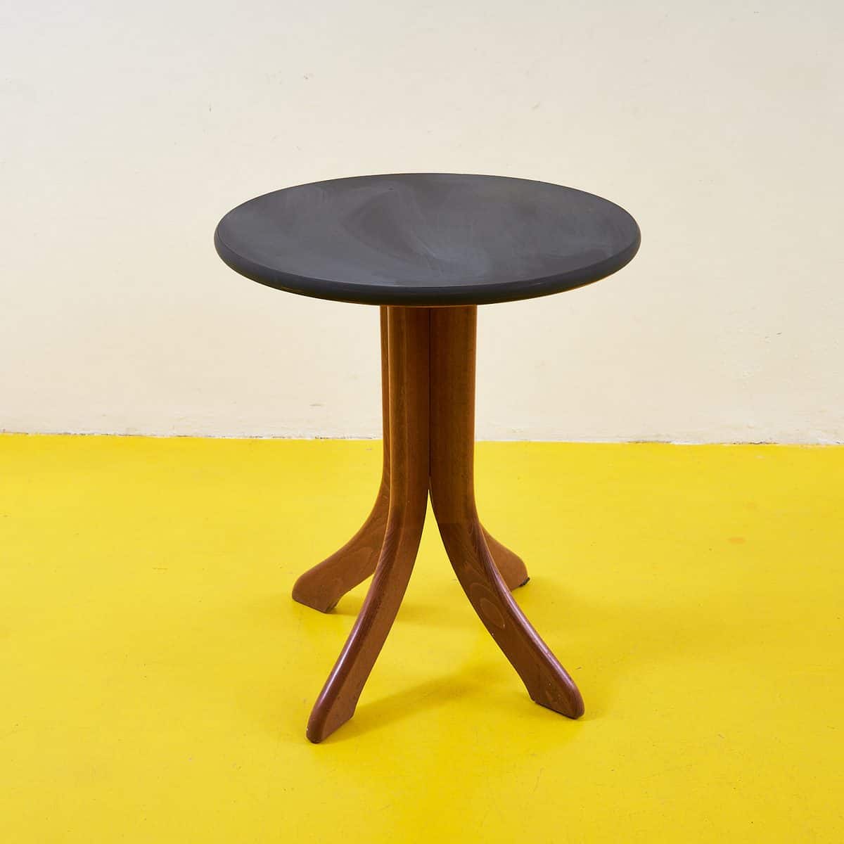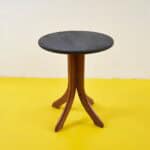 Scopri il fascino di questo tavolino rotondo, un perfetto connubio di design e funzionalita'. La sua base in legno, dalle curve sinuose, sostiene un piano liscio di un elegante colore scuro, crea... Scopri il fascino di questo tavolino rotondo, un perfetto connubio di design e funzionalita'. La sua base in legno, dalle curve sinuose, sostiene un piano liscio di un elegante colore scuro, creando un contrasto accattivante. Ideale per arredare il tuo soggiorno con stile, questo pezzo e' versatile e si adatta a vari contesti d'arredo, dal moderno al classico. E' un oggetto dallo spirito vintage che porta con se' un tocco di storia, pronto a diventare il fulcro della tua atmosfera domestica. Altro