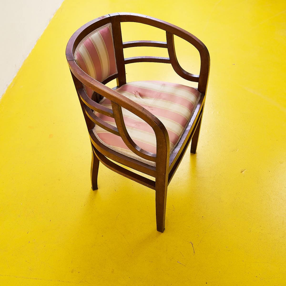 Questa sedia vintage, con un design unico ed elegante, e' perfetta per chi cerca un tocco di classe nel proprio arredamento. Realizzata in legno pregiato, presenta un'armonica combinazione d... Questa sedia vintage, con un design unico ed elegante, e' perfetta per chi cerca un tocco di classe nel proprio arredamento. Realizzata in legno pregiato, presenta un'armonica combinazione di linee curve e angolari che la rendono affascinante. Il sedile e lo schienale imbottiti sono rivestiti in un tessuto a righe, con una palette di colori caldi che si adatta a vari stili. Un pezzo che non solo rappresenta la funzionalita', ma diventa anche un'opera d'arte nel tuo soggiorno. Perfetta per stanze moderne o classiche, portera' sempre un sorriso a chi vi si siedera'. Altro
