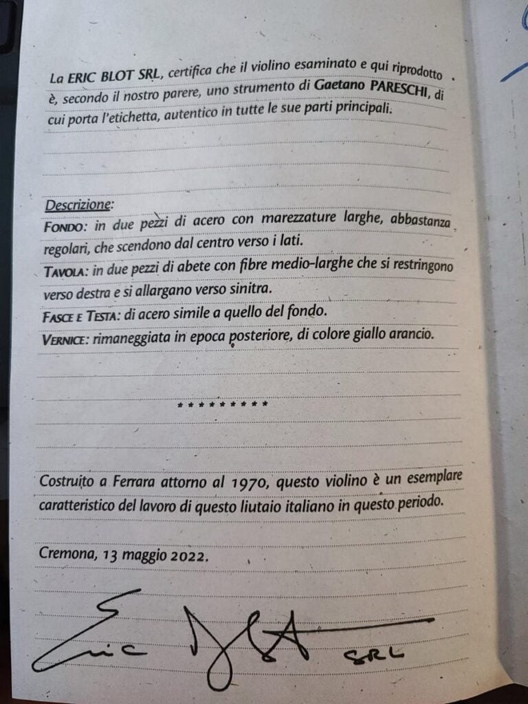 - Gaetano Pareschi è stato un rinomato liutaio italiano, nato nel XIX secolo. Celebre per la sua maestria nell'arte della liuteria, ha creato strumenti musicali eccezionali che hanno affascinato generazioni di musicisti. La sua passione e dedizione alla creazione di violini, violoncelli e viole straordinarie hanno lasciato un'impronta indelebile nella storia della musica. Le sue opere sono conosciute per la loro impeccabile precisione artigianale e la bellezza estetica, oltre che per il loro suono ricco e caldo che ha ispirato numerosi virtuosi e musicisti di fama mondiale. Gaetano Pareschi rimane un'icona nell'universo della liuteria italiana.-