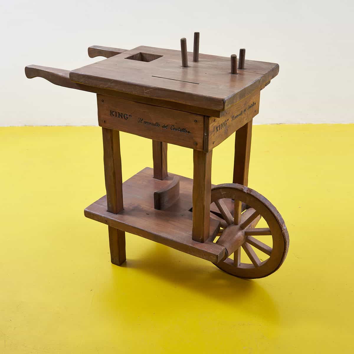 Questo affascinante carrello in legno, del periodo 1960-1969, e' un perfetto esempio di design rustico italiano. Realizzato con cura e attenzione ai dettagli, il carrello presenta una robusta str... Questo affascinante carrello in legno, del periodo 1960-1969, e' un perfetto esempio di design rustico italiano. Realizzato con cura e attenzione ai dettagli, il carrello presenta una robusta struttura in legno che si erge su due ruote decorative, donando un tocco di autenticita' e storia. Le scritte incise aggiungono personalita', rendendolo un vero pezzo da collezione. Ideale per essere esibito come elemento decorativo in soggiorno o cucina, questo carrello e' perfetto per chi ama il fascino del passato e desidera aggiungere un carattere unico al proprio spazio abitativo. Altro