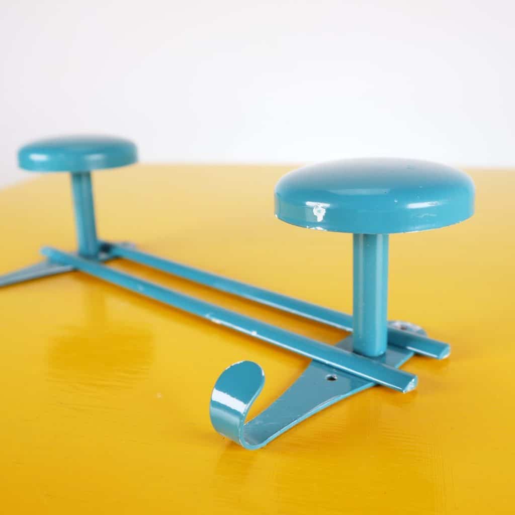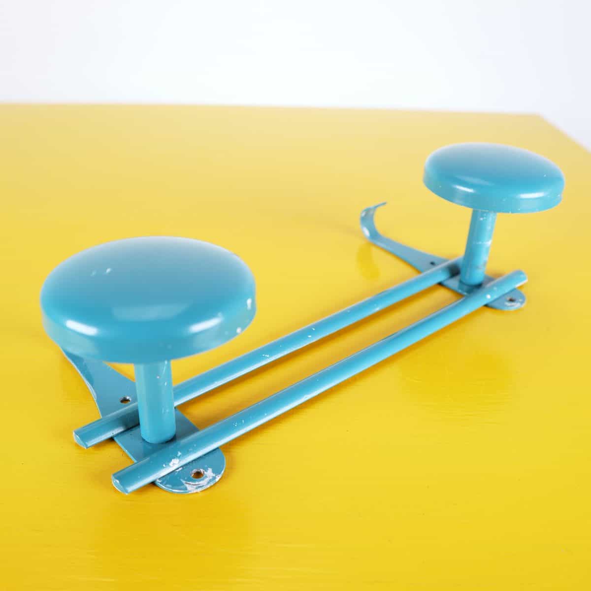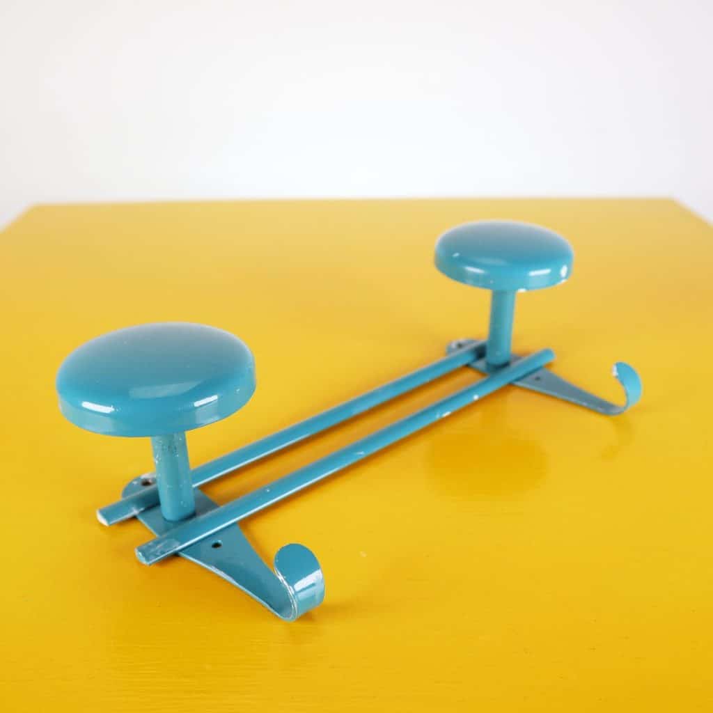 Questo affascinante attaccapanni in metallo presenta un design vintage distintivo, caratterizzato da una struttura solida e una finitura lucida che cattura la luce. Dotato di due pomoli rotondi e appe... Questo affascinante attaccapanni in metallo presenta un design vintage distintivo, caratterizzato da una struttura solida e una finitura lucida che cattura la luce. Dotato di due pomoli rotondi e appendini, è perfetto per aggiungere un tocco di stile alla tua entryway o al tuo spazio di lavoro. La sua tonalità azzurra vivace lo rende non solo funzionale, ma anche un pezzo decorativo che può valorizzare l"ambiente circostante. Realizzato con una particolare attenzione ai dettagli e all"estetica, questo attaccapanni è ideale per l"uso quotidiano, ma può anche diventare un elegante oggetto da collezione. àˆ in buone condizioni generali, con lievi segni del tempo che ne evidenziano la bellezza vissuta. Altro