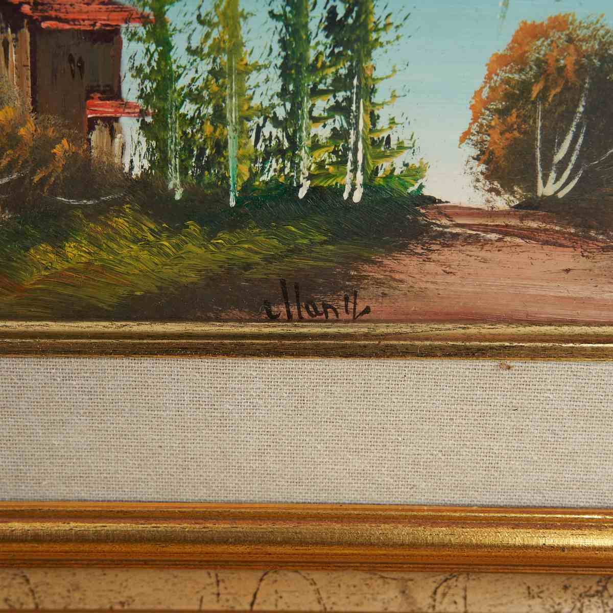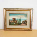 Questo incantevole dipinto cattura un suggestivo paesaggio mediterraneo, con un'invitante vista sul mare e una casa dall'architettura classica che si erge tra rigogliosi cipressi. La cornice... Questo incantevole dipinto cattura un suggestivo paesaggio mediterraneo, con un'invitante vista sul mare e una casa dall'architettura classica che si erge tra rigogliosi cipressi. La cornice dorata, elegantemente lavorata, racchiude l'opera donandole un tocco di squisita raffinatezza. L'abilita' dell'autore e' evidente nella vivida rappresentazione dei colori e dei dettagli, creando un'atmosfera armoniosa e rilassante. Questa opera e' l'ideale per arricchire qualsiasi ambiente con un tocco di stile e nostalgia. Altro