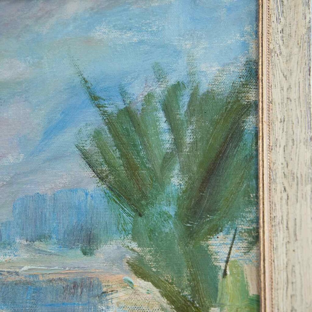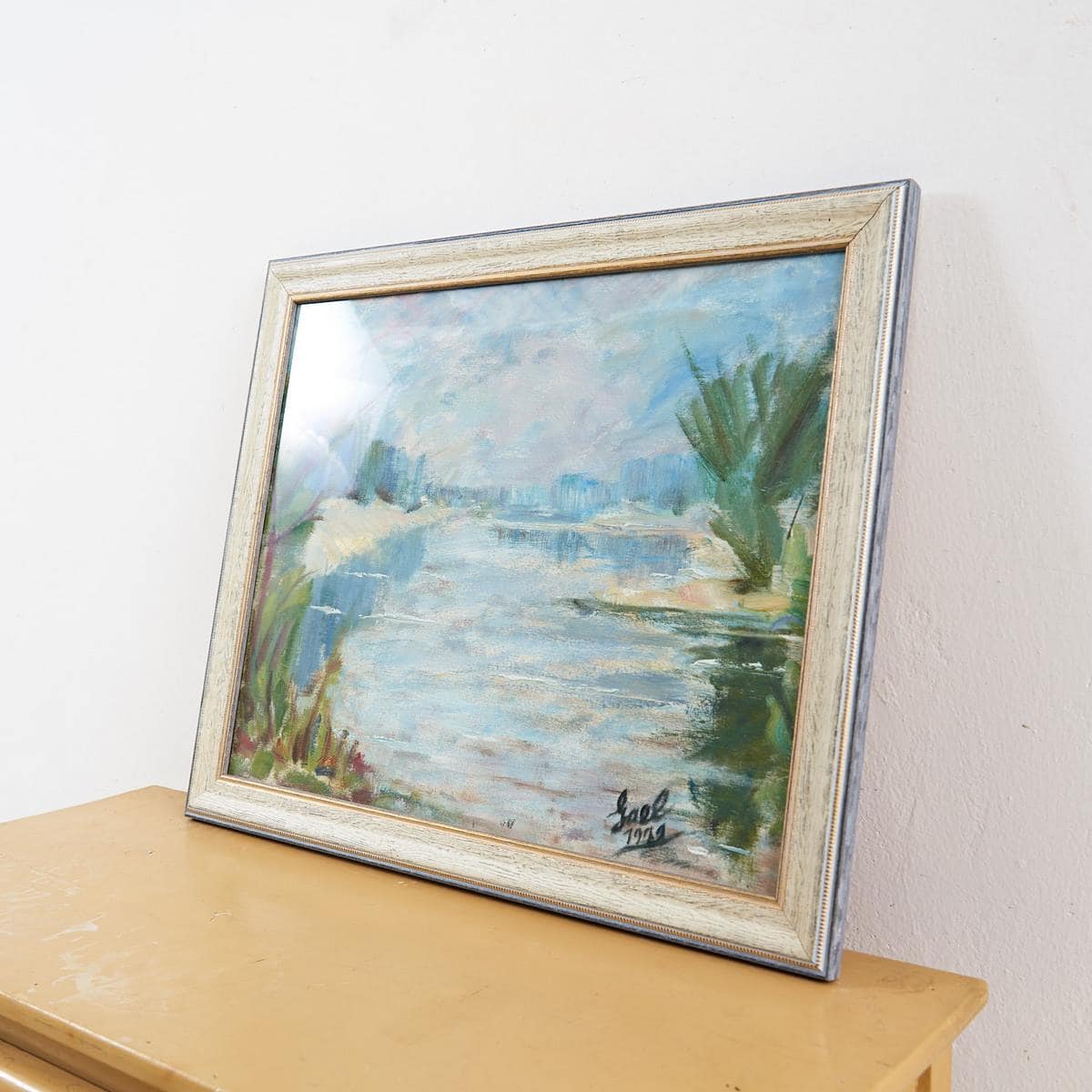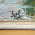 Questa affascinante opera d'arte rappresenta un paesaggio sereno, dipinto con una tecnica impressionista che cattura la bellezza della natura. Realizzata nel 1979, presenta tonalita' di blu ... Questa affascinante opera d'arte rappresenta un paesaggio sereno, dipinto con una tecnica impressionista che cattura la bellezza della natura. Realizzata nel 1979, presenta tonalita' di blu e verde che evocano tranquillita', con dettagli costruttivi ben definiti. Il dipinto e' incorniciato in una cornice elegante che ne esalta il valore estetico. Le condizioni sono ottime, con lievi segni del tempo sul retro, testimoniando la sua autentica storia. Questa opera e' perfetta per arredare spazi moderni o classici, ideale sia in salotti che in uffici. Aggiungi un tocco di originalita' e cultura alla tua collezione con questo pezzo unico. Altro