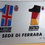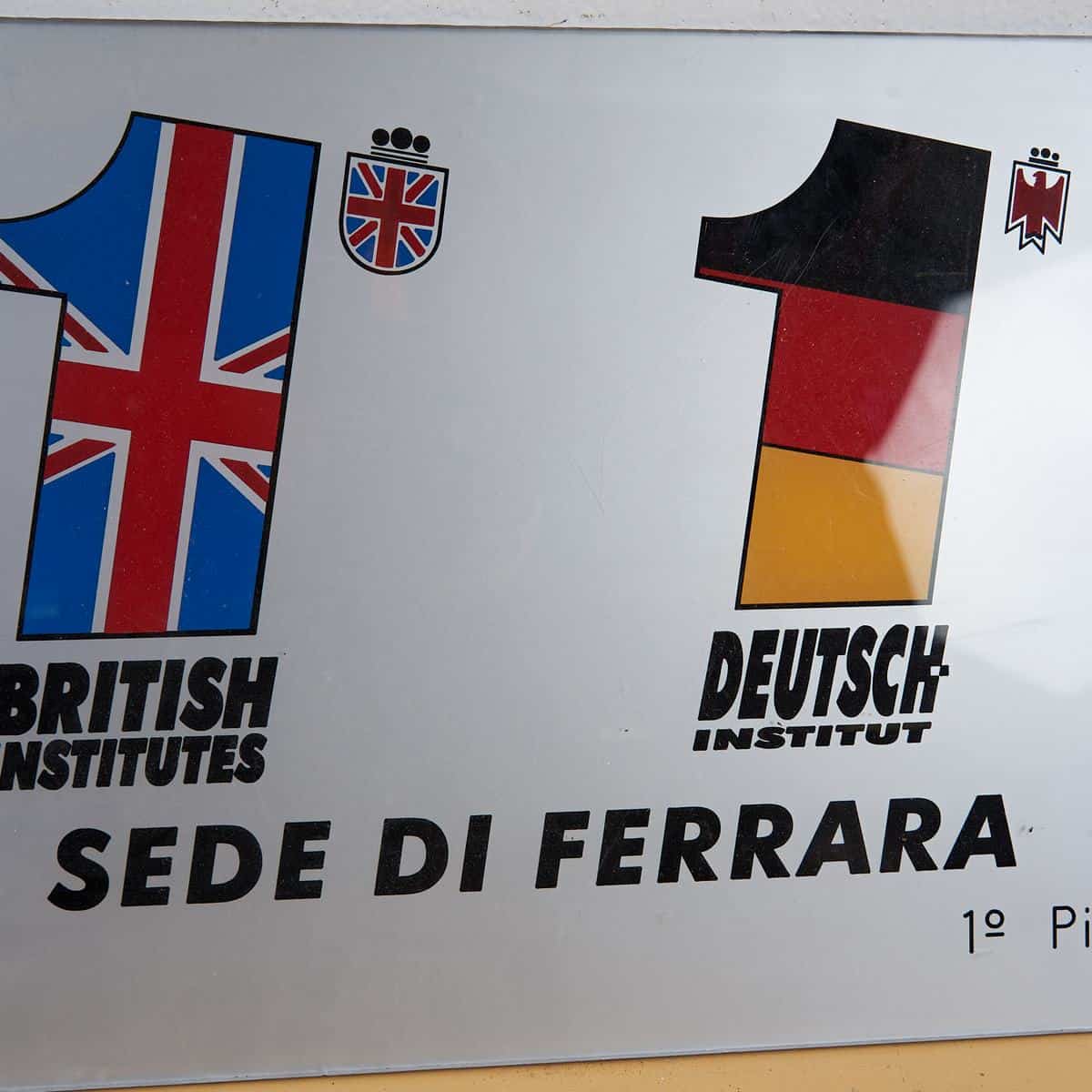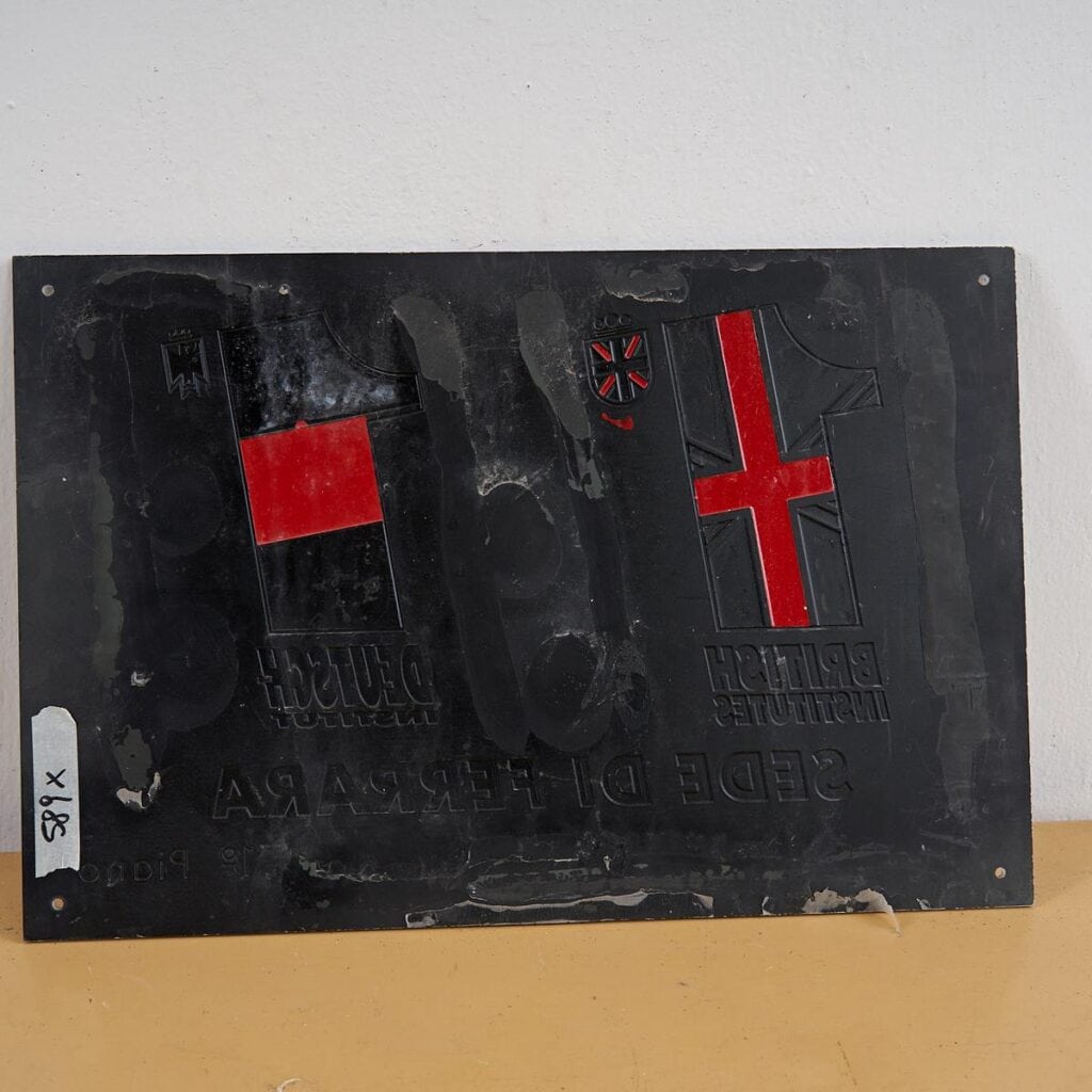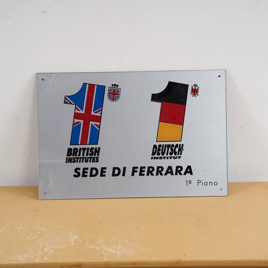 Questa affascinante insegna vintage e' un pezzo unico che testimonia l'era delle scuole di lingue. Realizzata in metallo, presenta un design grafico accattivante con i colori della bandiera ... Questa affascinante insegna vintage e' un pezzo unico che testimonia l'era delle scuole di lingue. Realizzata in metallo, presenta un design grafico accattivante con i colori della bandiera britannica e tedesca. La scritta 'Sede di Ferrara' e '1° Piano' aggiungono un tocco di autenticita' e storia. Adatta per ambienti di design vintage, puo' essere utilizzata come elemento decorativo in un ufficio, uno studio creativo o una casa dallo stile retro. Le condizioni generali sono buone, con lievi segni di usura che ne accentuano il carattere. Un oggetto versatile e ricco di storie, perfetto per chi ama il design e la cultura linguistica. Altro