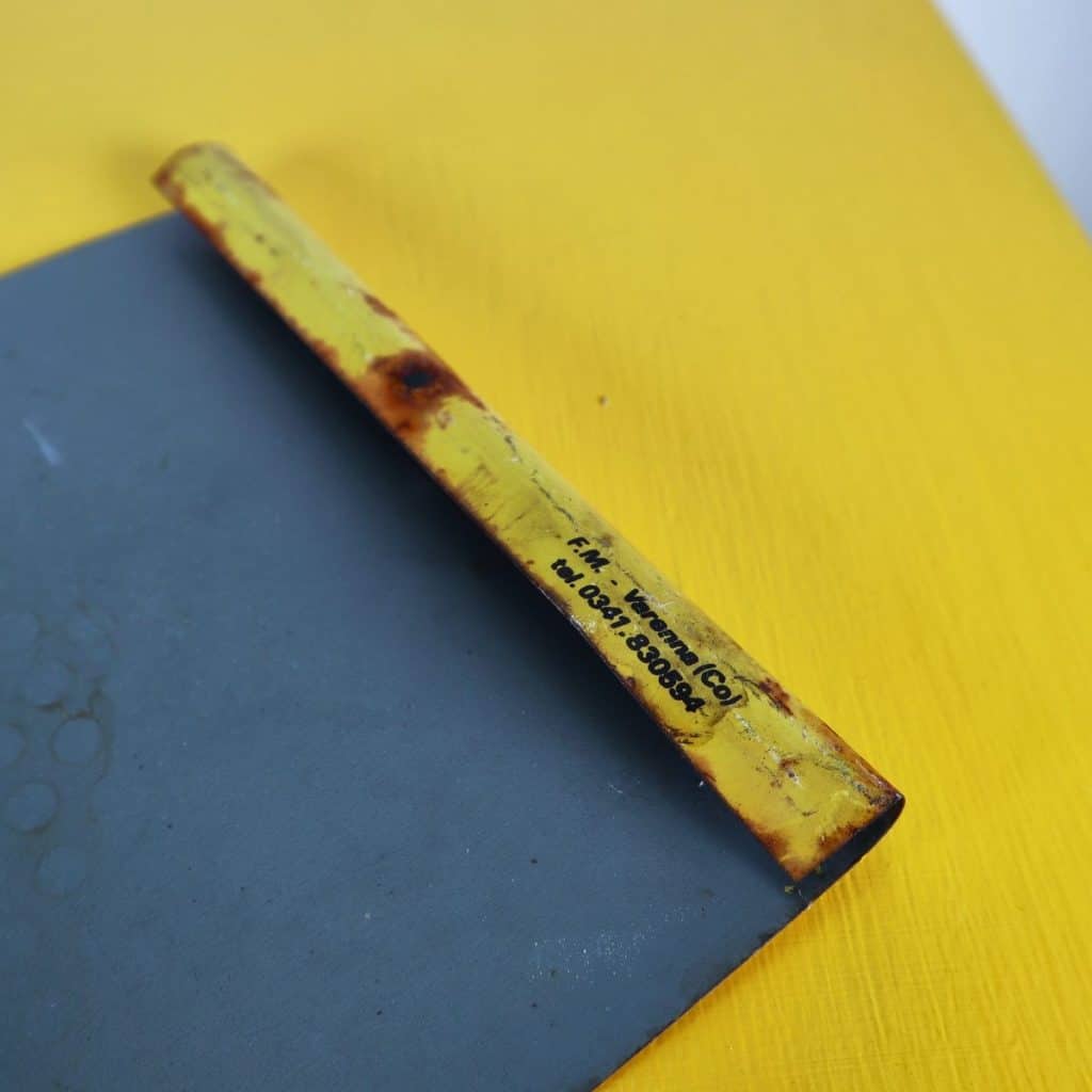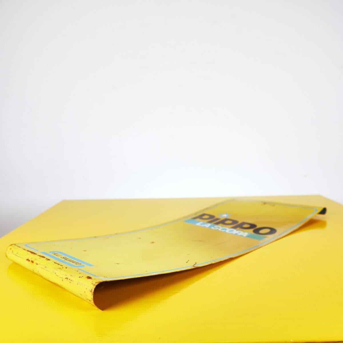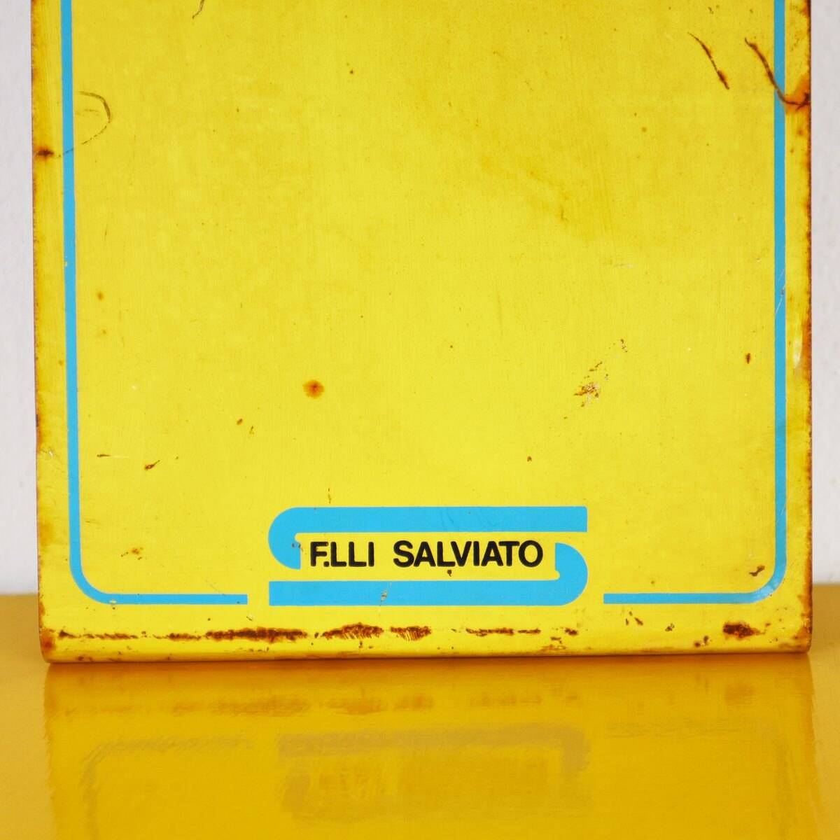 Questa splendida insegna vintage 'Pippo La Scopa' e' un pezzo unico nel suo genere, perfetto per gli amanti del design e dell'antiquariato. Realizzata in metallo, presenta uno sfon... Questa splendida insegna vintage 'Pippo La Scopa' e' un pezzo unico nel suo genere, perfetto per gli amanti del design e dell'antiquariato. Realizzata in metallo, presenta uno sfondo giallo brillante con dettagli in blu e nero. L'insegna mostra segni di usura, sottolineando il suo fascino vintage. Originariamente era utilizzata come pubblicita' per il marchio 'F.lli Salviato'. La sua forma leggermente curva la rende un elemento decorativo ideale per bar, ristoranti o spazi domestici. Regalate un tocco di nostalgia al vostro arredamento con questo pezzo distintivo dell'epoca passata. Altro