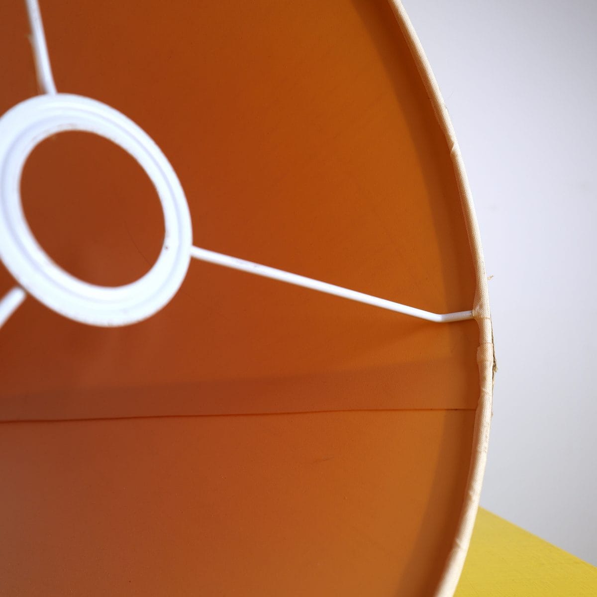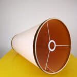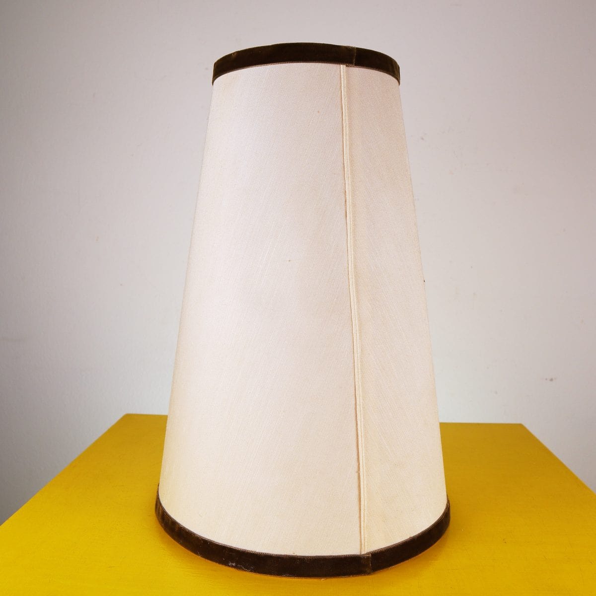 Questo paralume vintage rappresenta un elegante ritorno al design tradizionale. Realizzato in un pregiato tessuto beige, è caratterizzato da una forma conica che si adatta perfettamente ad ambienti cl... Questo paralume vintage rappresenta un elegante ritorno al design tradizionale. Realizzato in un pregiato tessuto beige, è caratterizzato da una forma conica che si adatta perfettamente ad ambienti classici e moderni. I bordi sono impreziositi da una fascia in velluto marrone scuro, che aggiunge un tocco sofisticato e anticato. La costruzione interna in metallo bianco assicura robustezza e durata. Questo pezzo non solo illumina, ma arricchisce lo spazio con la sua presenza raffinata, rendendolo ideale per lampade da terra o da tavolo. Ben conservato, il paralume offre stile e funzionalità a qualsiasi ambiente casalingo o professionale. Altro