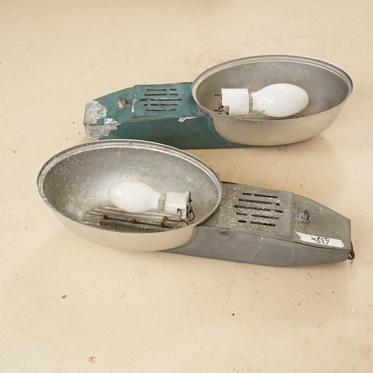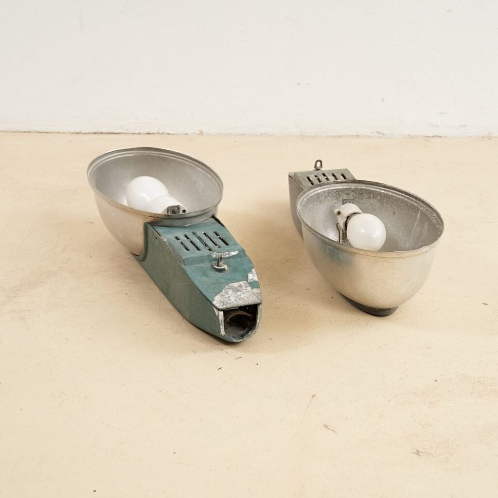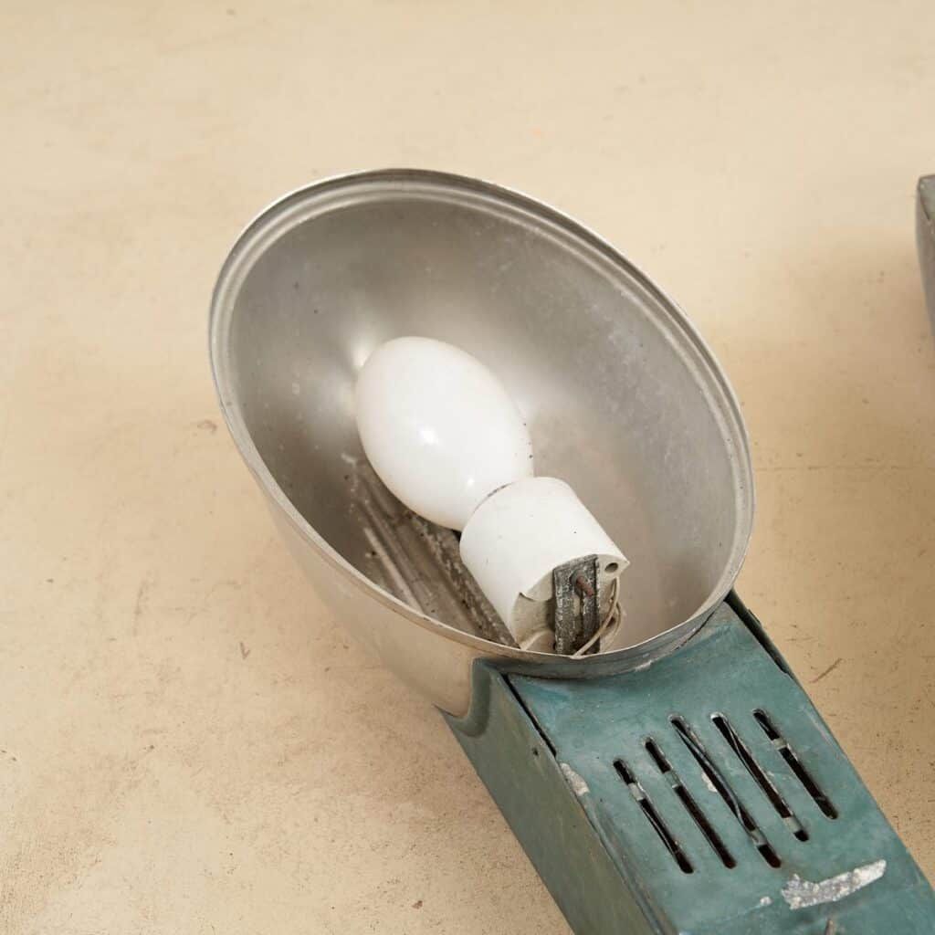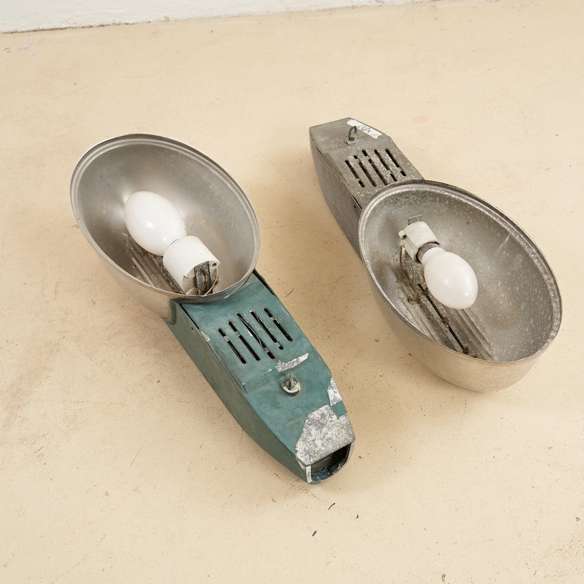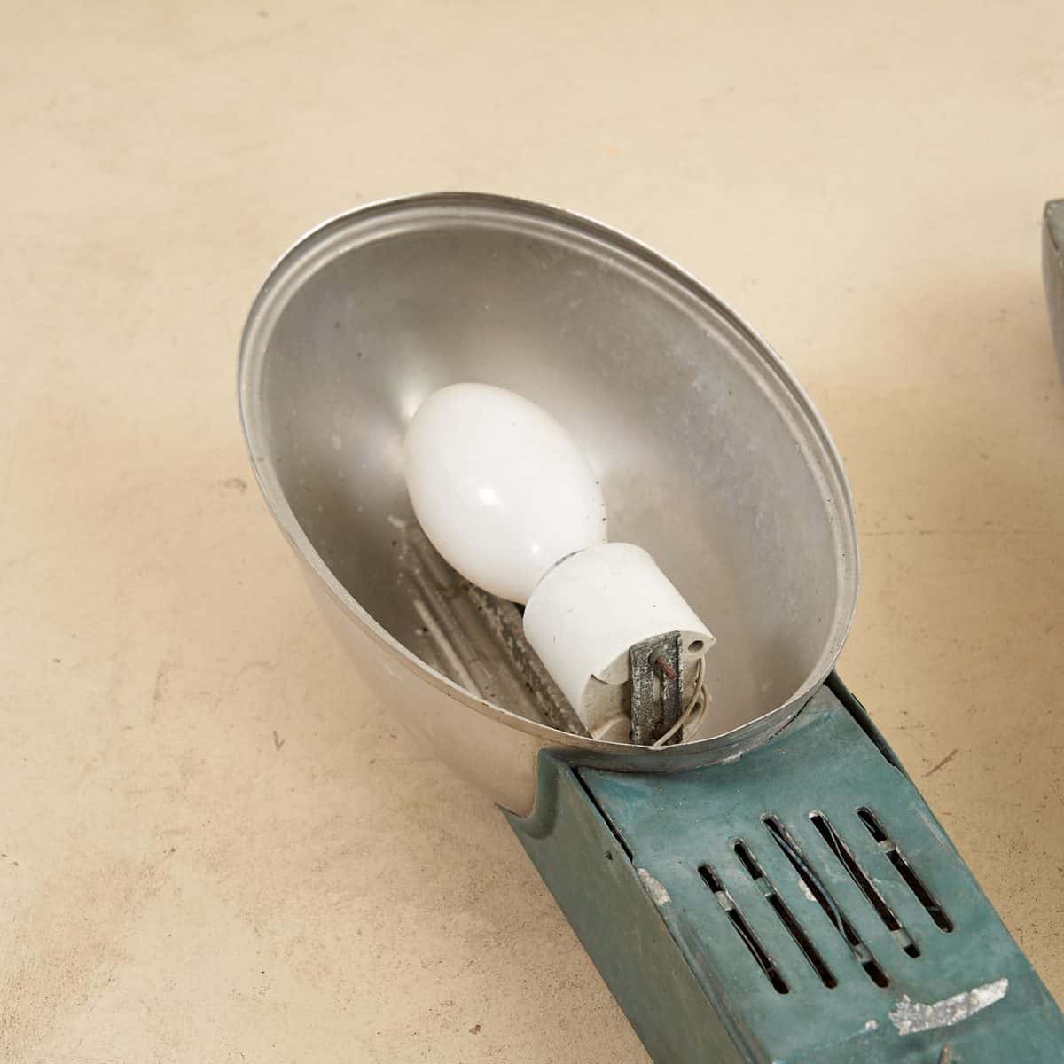 Questa affascinante coppia di lampade vintage rappresenta un perfetto esempio di design re'tro degli anni '60. Caratterizzate da una base in metallo verde e riflettori argentati, queste lamp... Questa affascinante coppia di lampade vintage rappresenta un perfetto esempio di design re'tro degli anni '60. Caratterizzate da una base in metallo verde e riflettori argentati, queste lampade uniscono funzionalita' ed estetica. I dettagli costruttivi, come le aperture per la ventilazione e il meccanismo di accensione, testimoniano un'attenzione al design industriale tipica dell'epoca. Anche se presentano segni di usura che ne accentuano il fascino vintage, sono in buone condizioni generali e pronte per illuminare il tuo spazio con stile. Ideali per un ambiente moderno o bohemien, queste lampade porteranno un tocco di originalita' in salotti, studi o camere da letto. Altro