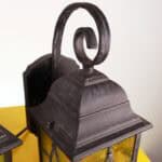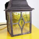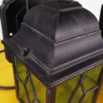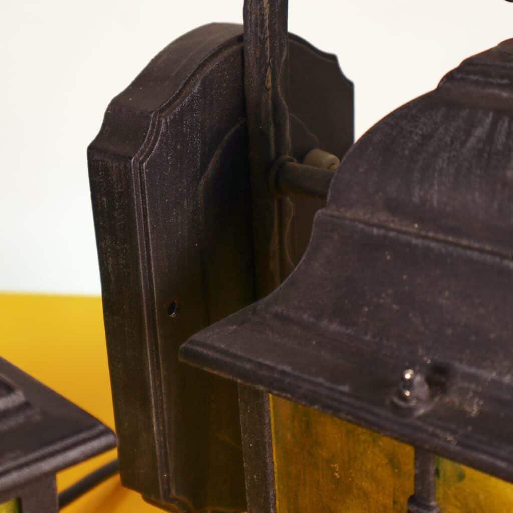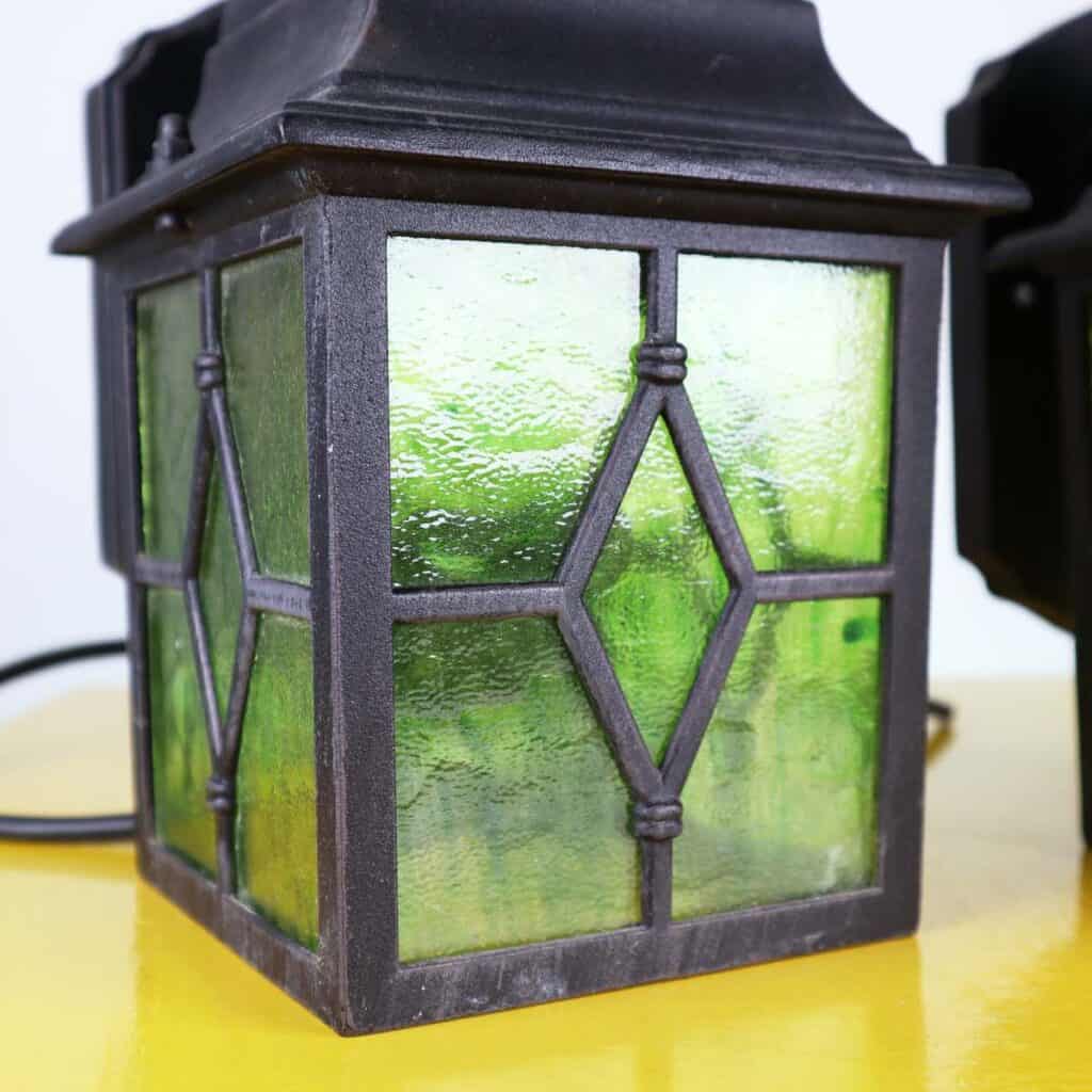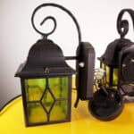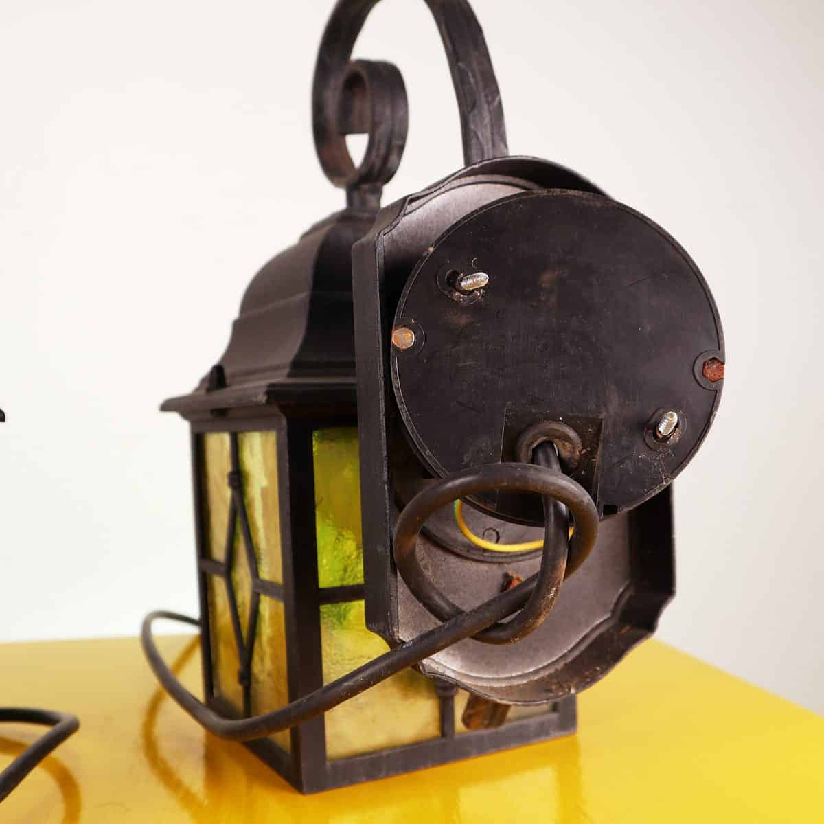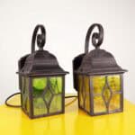 Coppia di applique in metallo con vetri colorati lavorati, dal gusto classico e decorativo. La struttura robusta e il motivo geometrico dei vetri creano una luce calda e atmosferica, ideale per ingressi, corridoi o ambienti dallo stile vintage. Oggetti decorativi funzionali, con forte carattere estetico.
