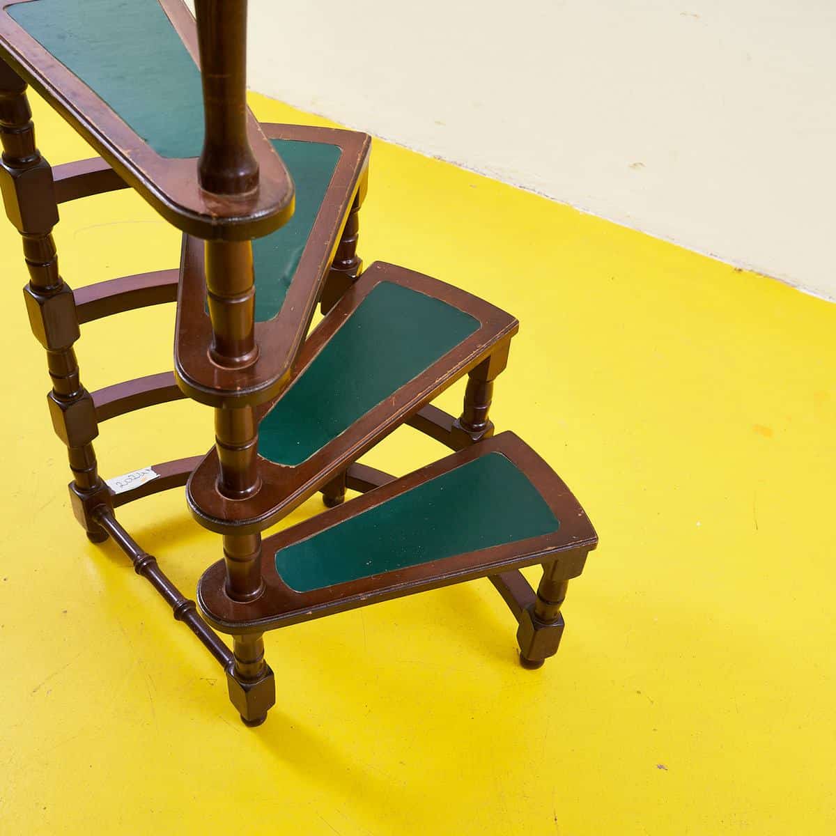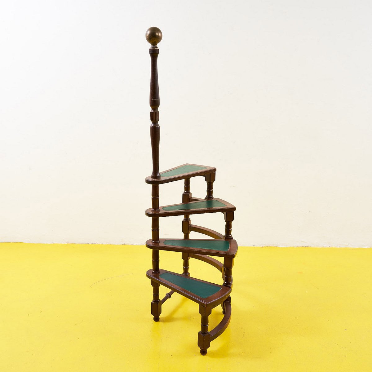 Scoprite l'eleganza senza tempo di questa scala a chiocciola in legno. Con un design raffinato e curvilineo, e' un esempio straordinario di stile vintage. I suoi gradini dai bordi verdi sfum... Scoprite l'eleganza senza tempo di questa scala a chiocciola in legno. Con un design raffinato e curvilineo, e' un esempio straordinario di stile vintage. I suoi gradini dai bordi verdi sfumano elegantemente in un legno scuro e lucido, mentre la parte superiore e' adornata da una sfera metallica che conferisce un tocco di classe. Questa scala non e' solo funzionale, ma anche un'affascinante aggiunta per decorare qualsiasi ambiente, dal soggiorno all'ufficio. Perfetta per chi ama il design storico e desidera un pezzo distintivo da esporre. Altro