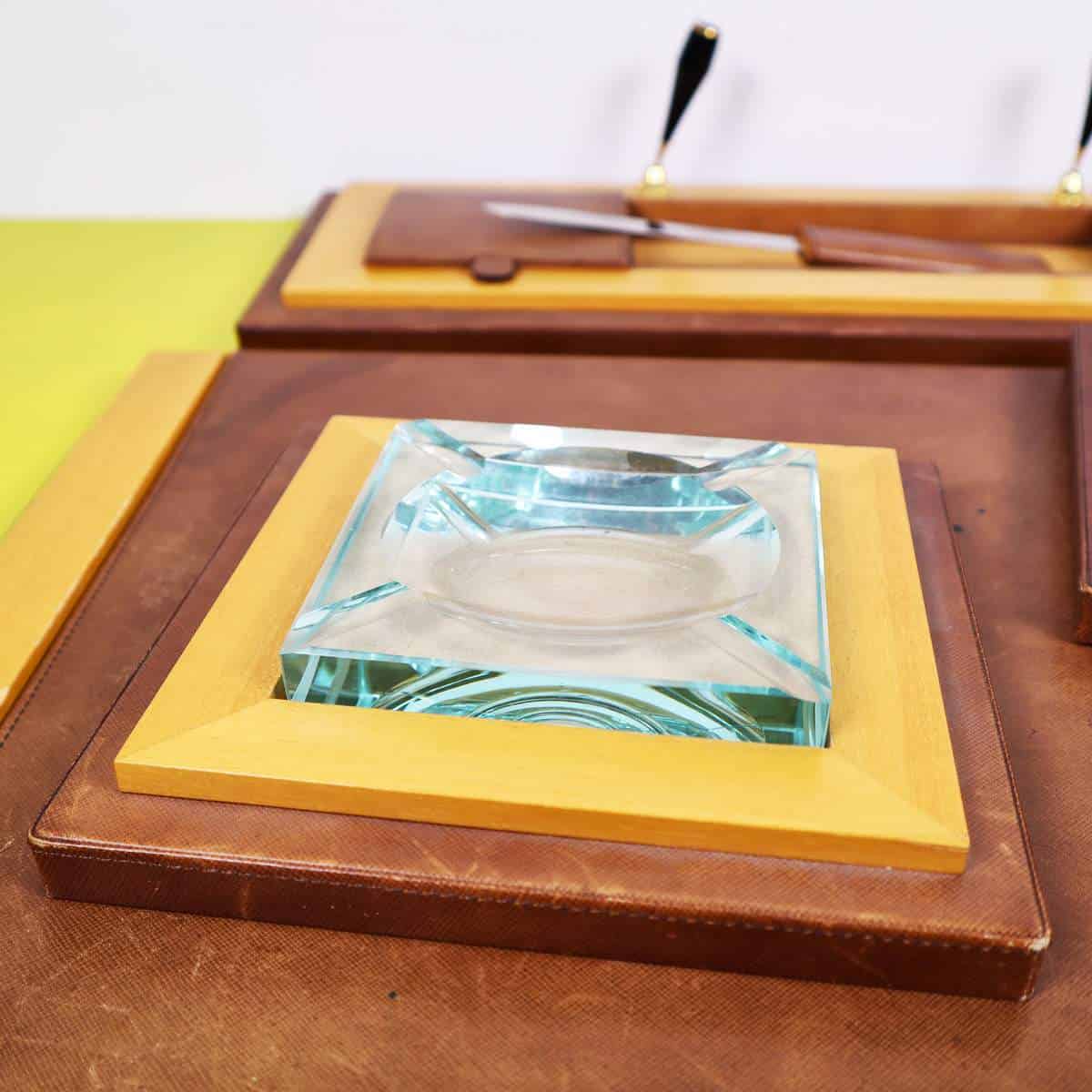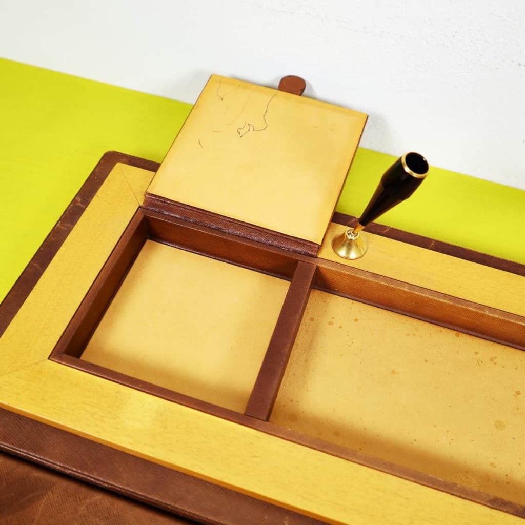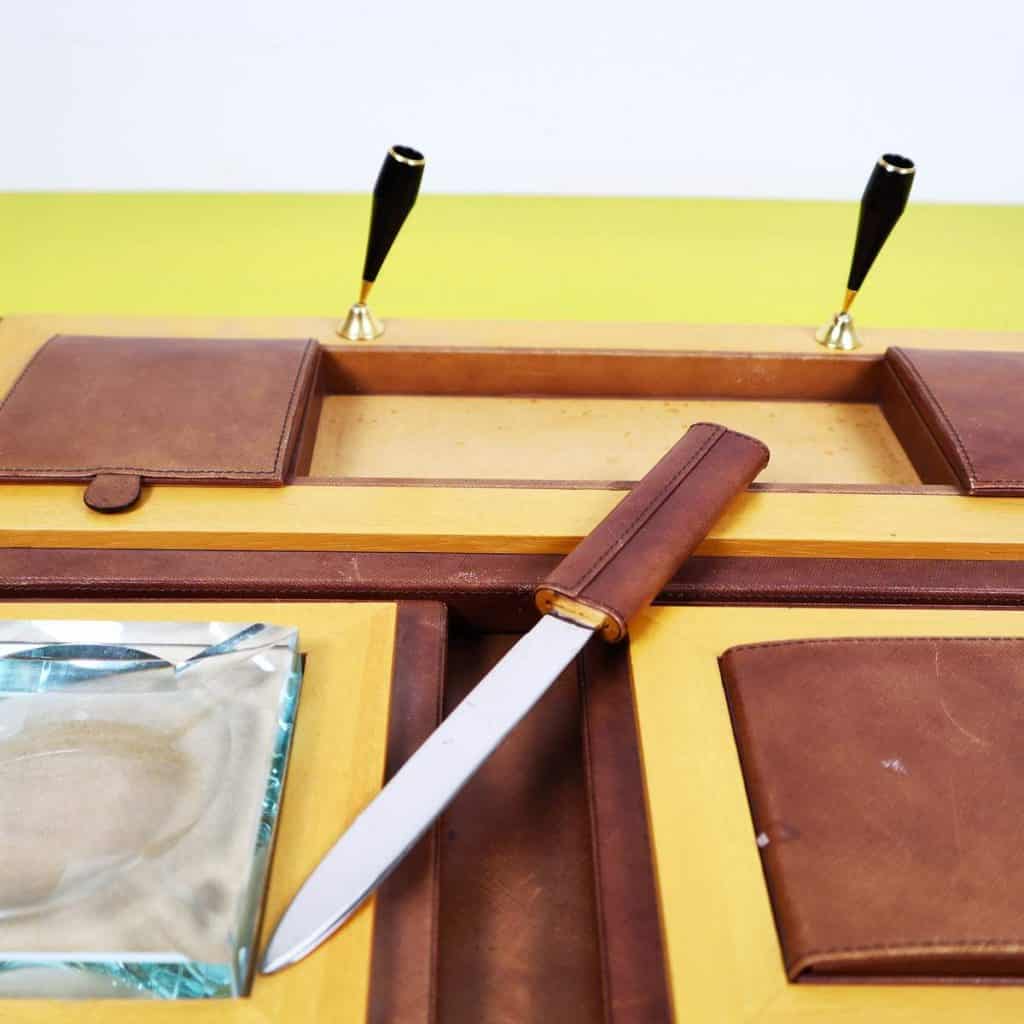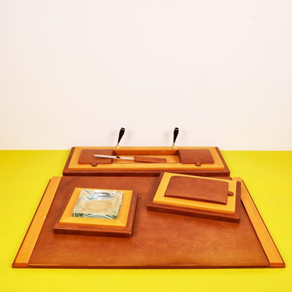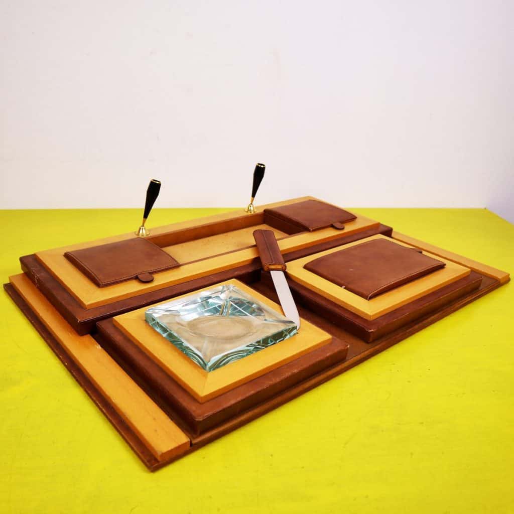 Questo raffinato set da scrivania vintage è un esempio pregiato di design elegante e funzionale. Completamente realizzato in pelle marrone di alta qualità e legno chiaro, il set include un"area per pe... Questo raffinato set da scrivania vintage è un esempio pregiato di design elegante e funzionale. Completamente realizzato in pelle marrone di alta qualità e legno chiaro, il set include un"area per penne, un posacenere di vetro e vari scomparti per la cancelleria. La lavorazione artigianale è evidente nei dettagli curati, come le finiture dorate e le maniglie eleganti. Questo oggetto non solo serve come accessorio pratico per un ufficio o uno studio, ma rappresenta anche un elemento decorativo che porta con sà© un tocco di classe vintage. Un"opzione ideale per chi cerca un equilibrio tra stile e funzionalità nella propria scrivania. Altro
