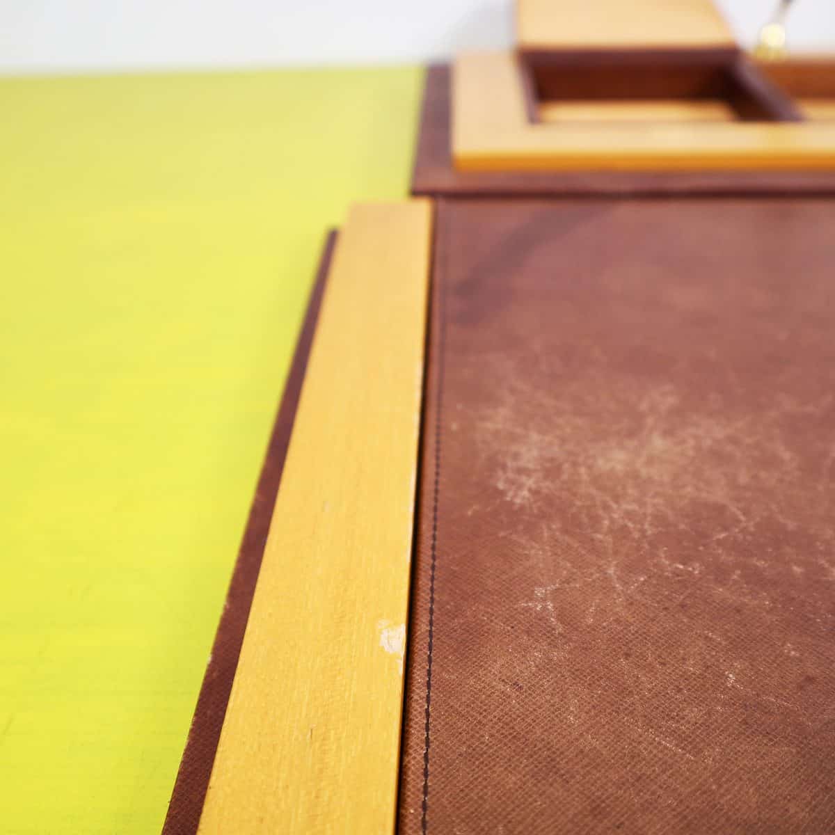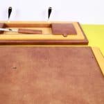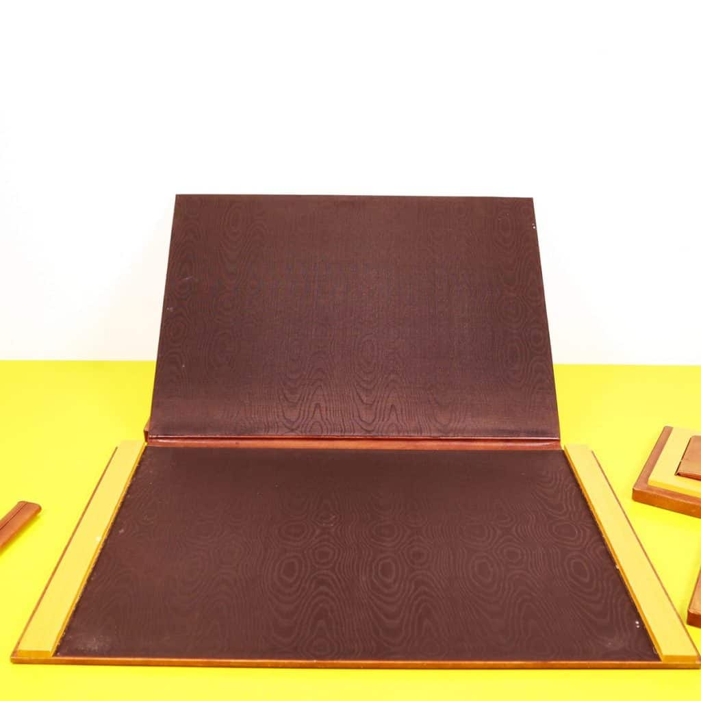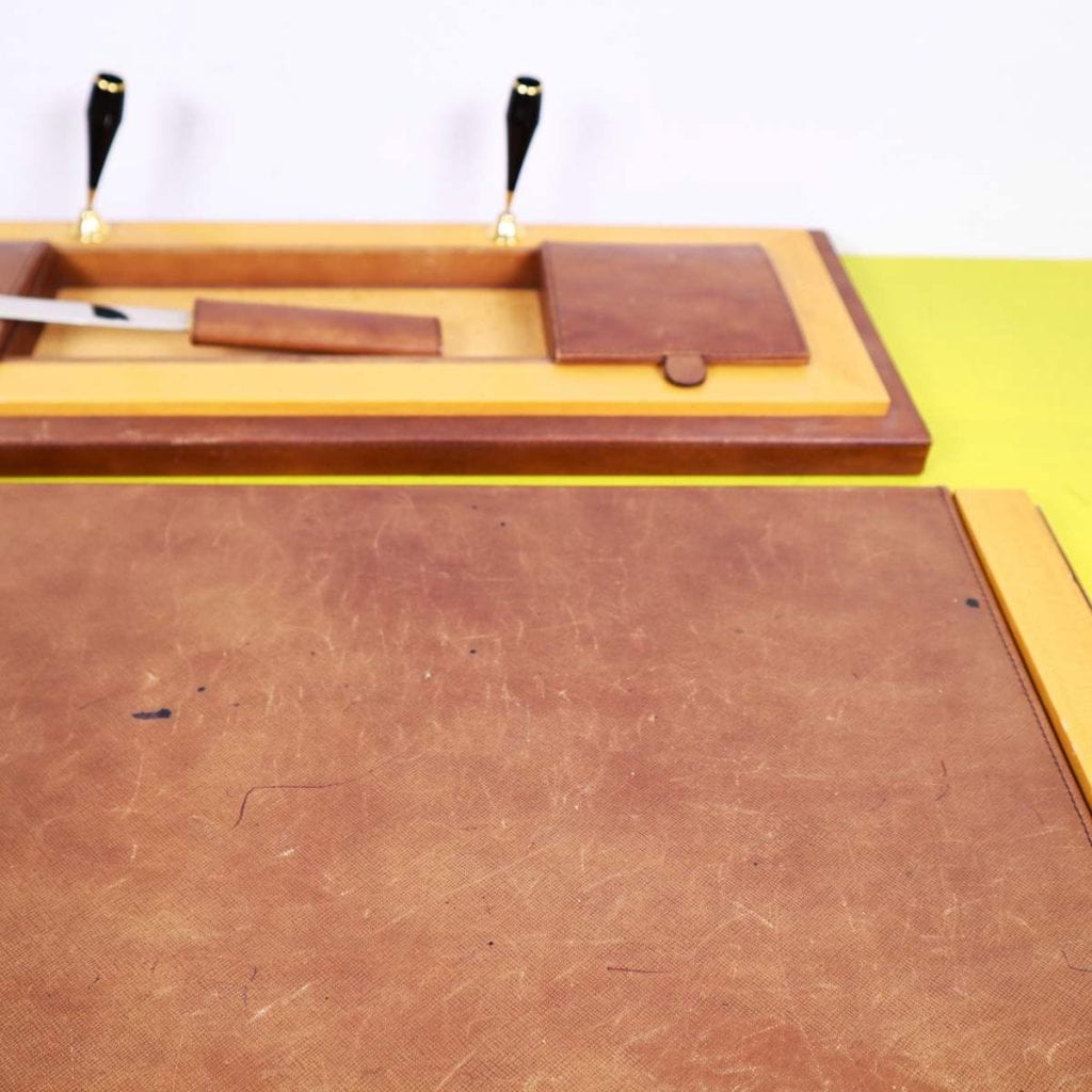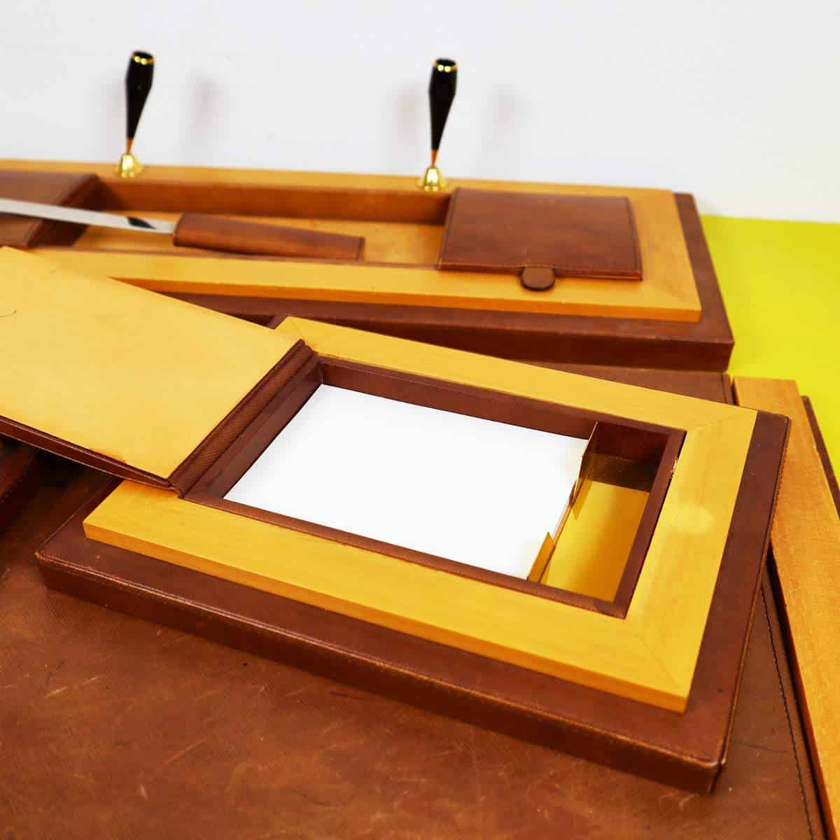Questo raffinato set da scrivania vintage è un esempio pregiato di design elegante e funzionale. Completamente realizzato in pelle marrone di alta qualità e legno chiaro, il set include un"area per pe... Questo raffinato set da scrivania vintage è un esempio pregiato di design elegante e funzionale. Completamente realizzato in pelle marrone di alta qualità e legno chiaro, il set include un"area per penne, un posacenere di vetro e vari scomparti per la cancelleria. La lavorazione artigianale è evidente nei dettagli curati, come le finiture dorate e le maniglie eleganti. Questo oggetto non solo serve come accessorio pratico per un ufficio o uno studio, ma rappresenta anche un elemento decorativo che porta con sà© un tocco di classe vintage. Un"opzione ideale per chi cerca un equilibrio tra stile e funzionalità nella propria scrivania. Altro