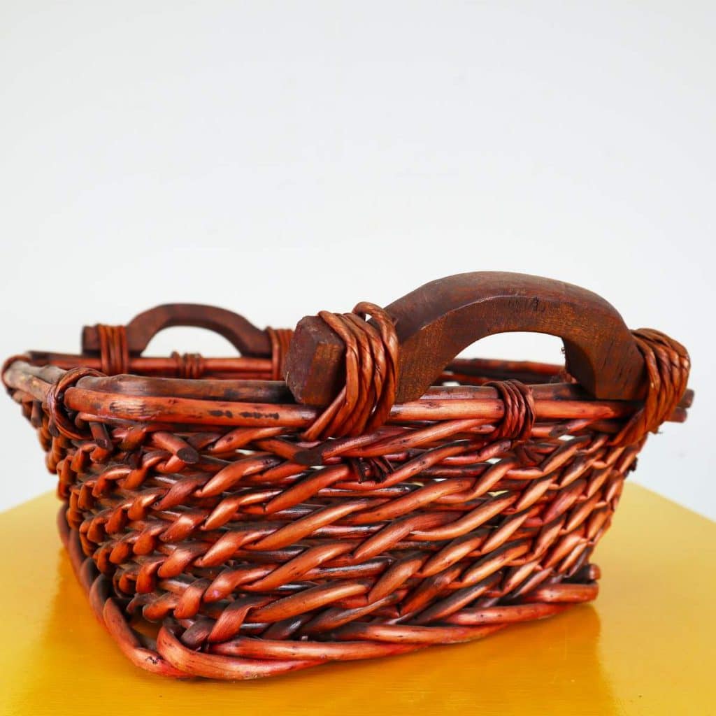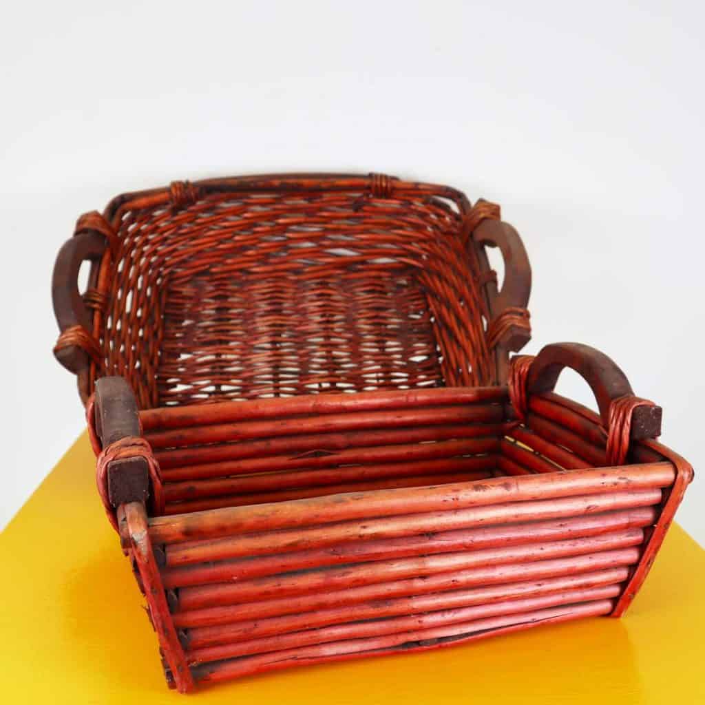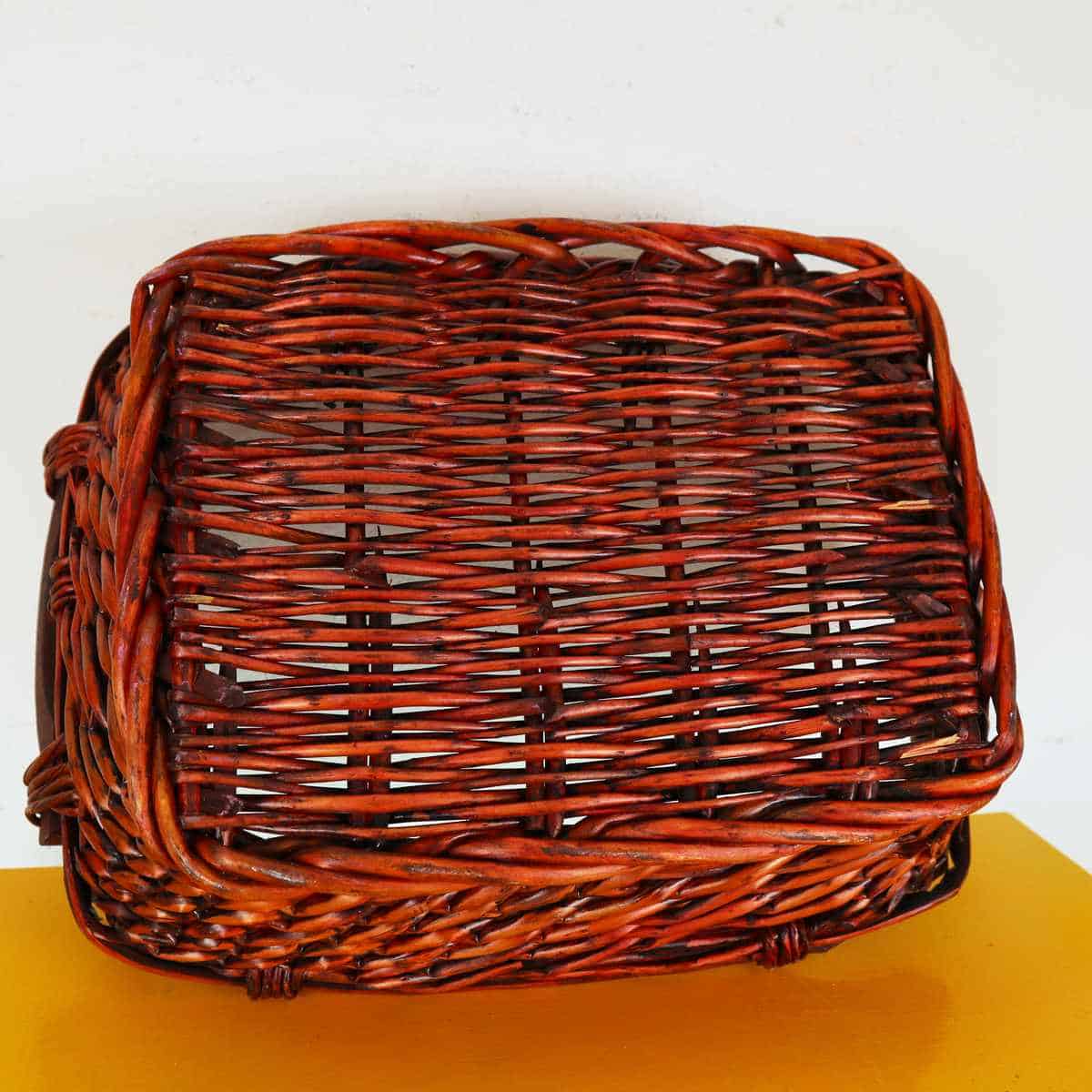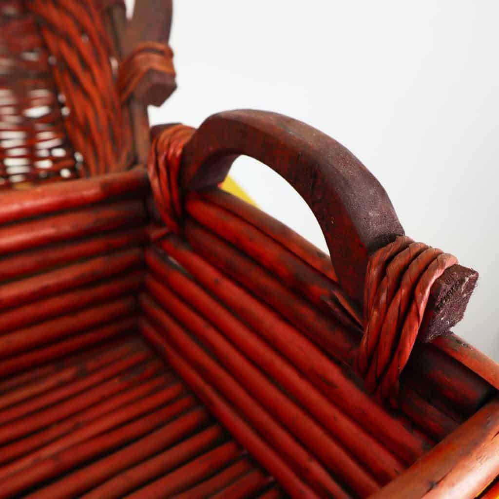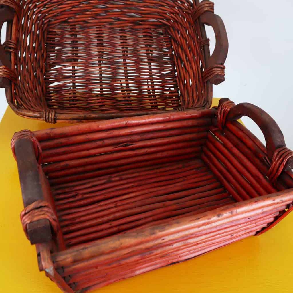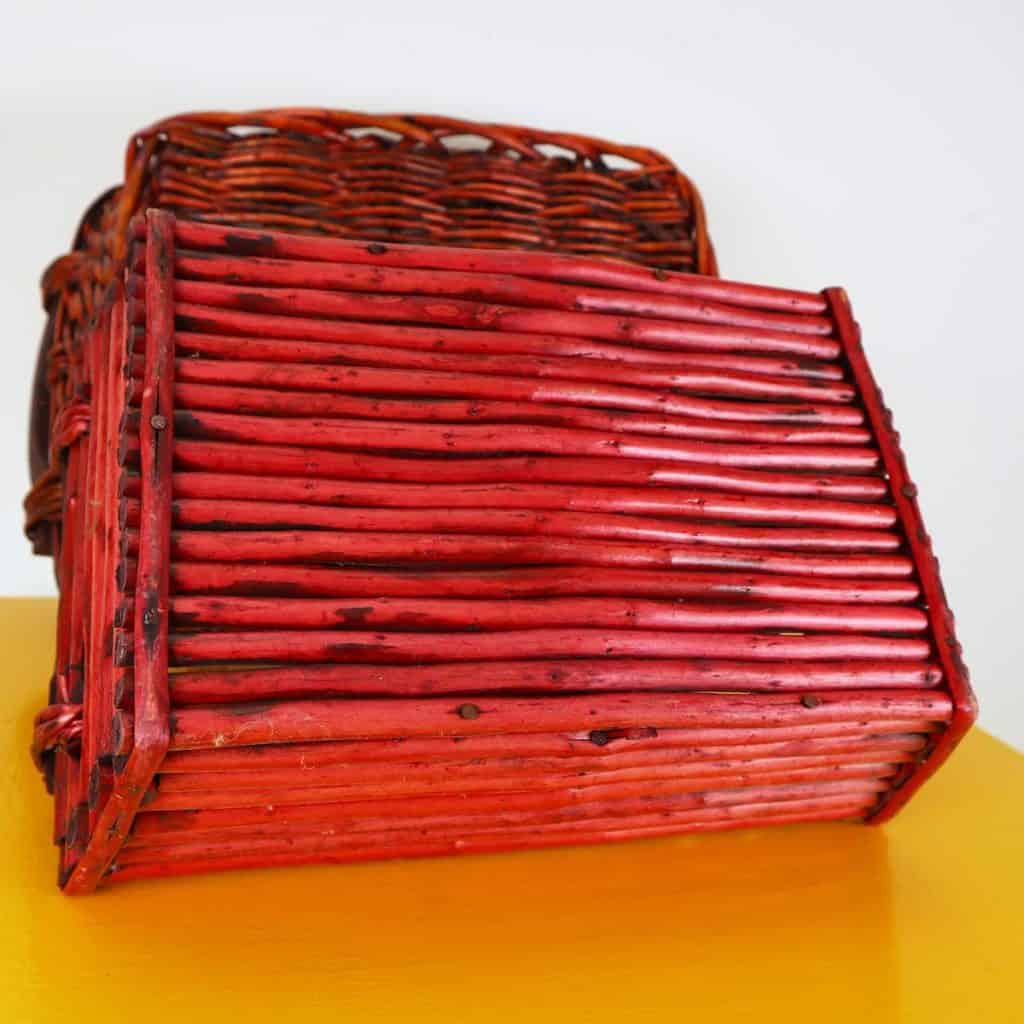 Questi affascinanti cesti in vimini, di chiara ispirazione vintage, sono perfetti complementi d'arredo per ogni ambiente. Realizzati con un'accurata lavorazione artigianale, presentano una finitura ro... Questi affascinanti cesti in vimini, di chiara ispirazione vintage, sono perfetti complementi d'arredo per ogni ambiente. Realizzati con un'accurata lavorazione artigianale, presentano una finitura rosso scuro che ne esalta il design, rendendoli ideali per la cucina o il soggiorno. Le maniglie in legno robusto non solo conferiscono praticità, ma aggiungono anche un tocco di eleganza. Utilizzabili per contenere frutta, riviste o oggetti vari, questi oggetti di design sono sia funzionali che decorativi, potendo inserirsi armoniosamente in qualsiasi stile di arredamento o come pezzi focalizzanti. In ottime condizioni, presentano segni di uso lievi, tipici di pezzi vintage. Altro