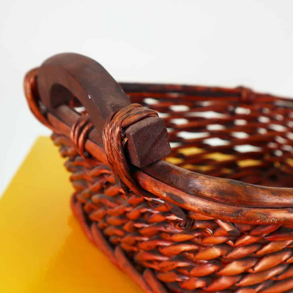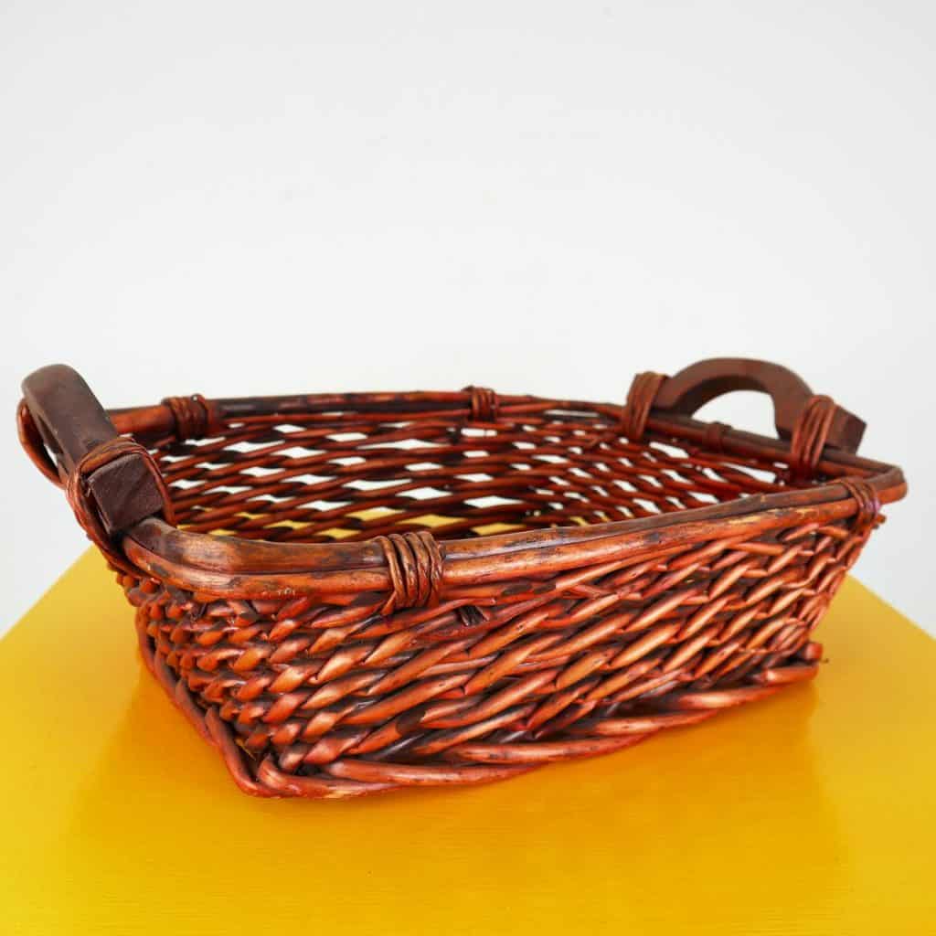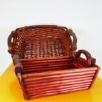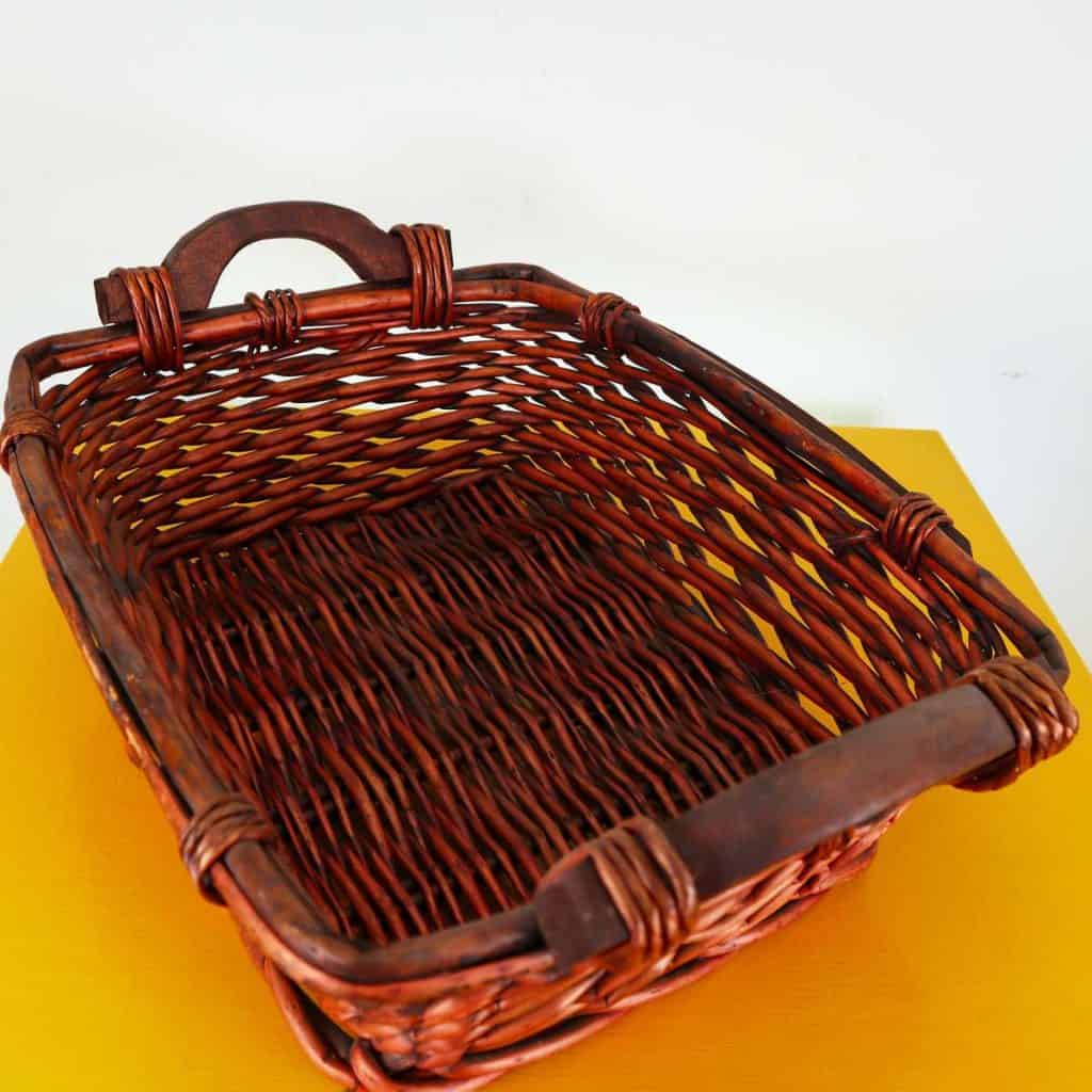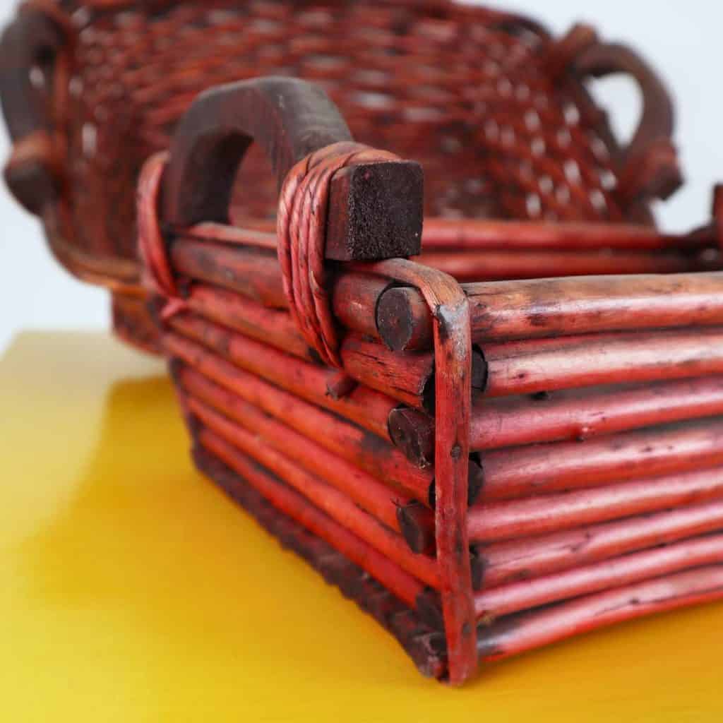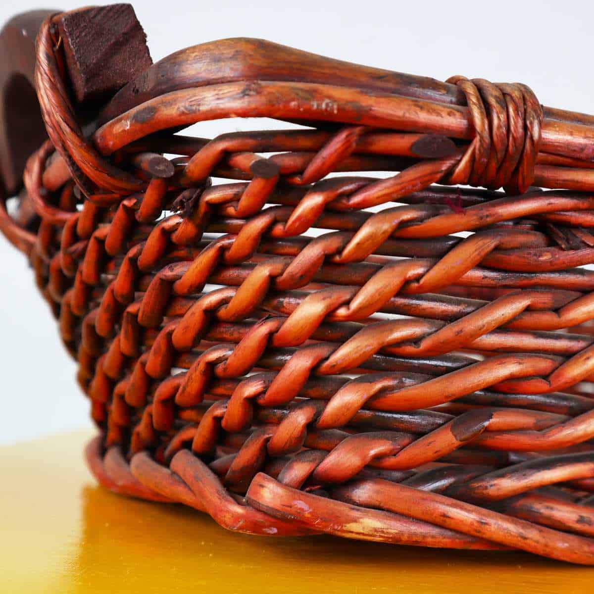 Questi affascinanti cesti in vimini, di chiara ispirazione vintage, sono perfetti complementi d'arredo per ogni ambiente. Realizzati con un'accurata lavorazione artigianale, presentano una finitura ro... Questi affascinanti cesti in vimini, di chiara ispirazione vintage, sono perfetti complementi d'arredo per ogni ambiente. Realizzati con un'accurata lavorazione artigianale, presentano una finitura rosso scuro che ne esalta il design, rendendoli ideali per la cucina o il soggiorno. Le maniglie in legno robusto non solo conferiscono praticità, ma aggiungono anche un tocco di eleganza. Utilizzabili per contenere frutta, riviste o oggetti vari, questi oggetti di design sono sia funzionali che decorativi, potendo inserirsi armoniosamente in qualsiasi stile di arredamento o come pezzi focalizzanti. In ottime condizioni, presentano segni di uso lievi, tipici di pezzi vintage. Altro