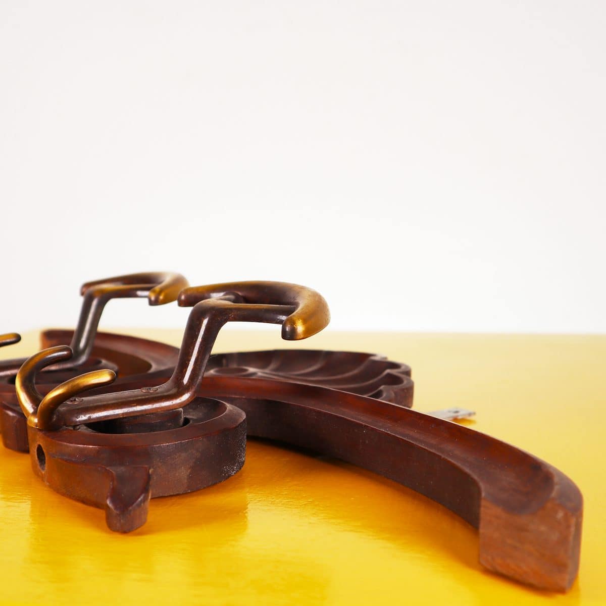 Questo attaccapanni rappresenta un perfetto esempio di design vintage, con un affascinante stile. Realizzato in legno massello con finitura marrone scuro, mostra dettagli dorati che conferiscono un to... Questo attaccapanni rappresenta un perfetto esempio di design vintage, con un affascinante stile. Realizzato in legno massello con finitura marrone scuro, mostra dettagli dorati che conferiscono un tocco di eleganza. La sua forma arcuata e le linee sinuose lo rendono un oggetto decorativo oltre che funzionale, ideale per ingressi o corridoi. Le doppie appendici offrono praticita', permettendo di appendere cappotti e borse con facilita'. In ottime condizioni, e' un pezzo che porta con se' la nostalgia degli anni passati, perfetto per chi cerca di arricchire il proprio spazio con un elemento di classe. Altro