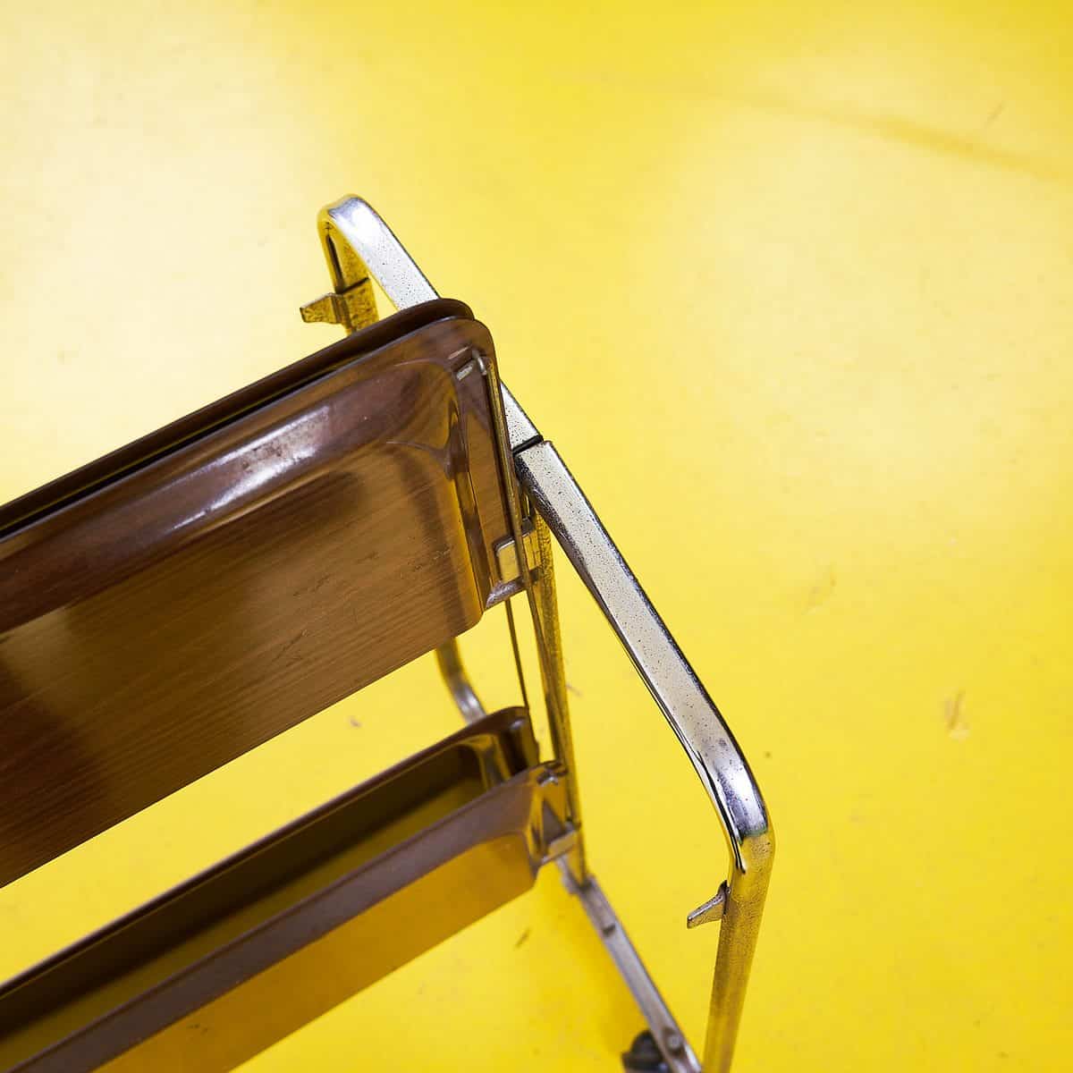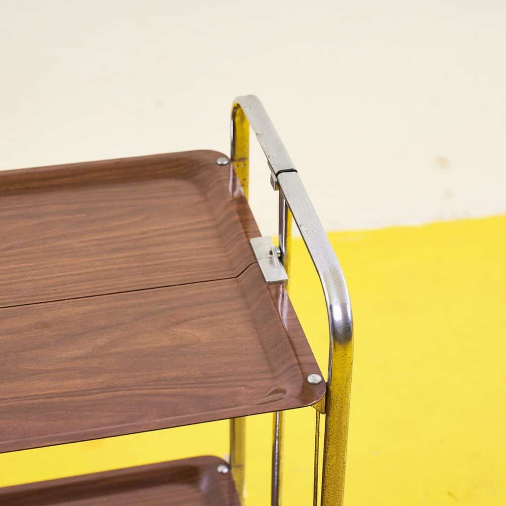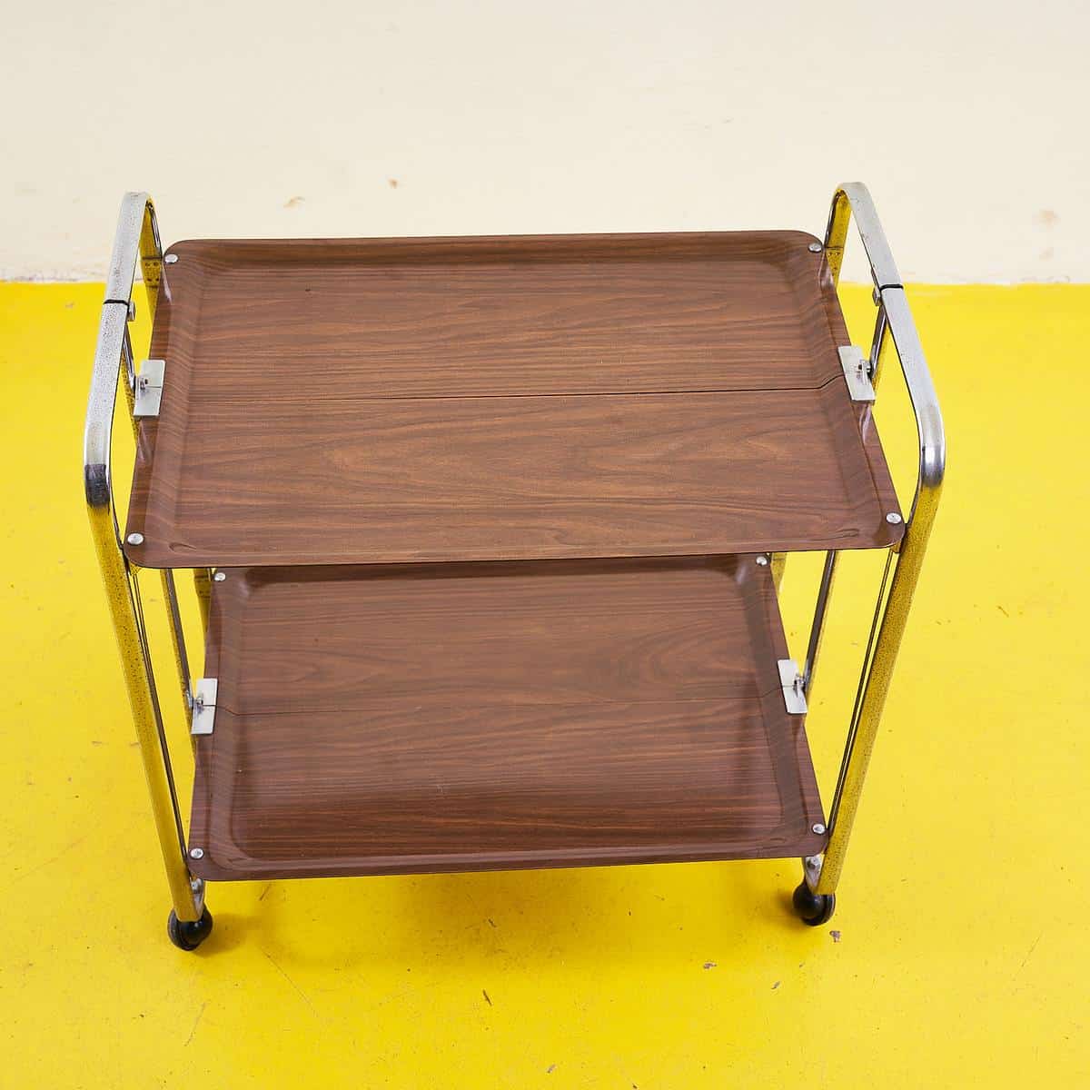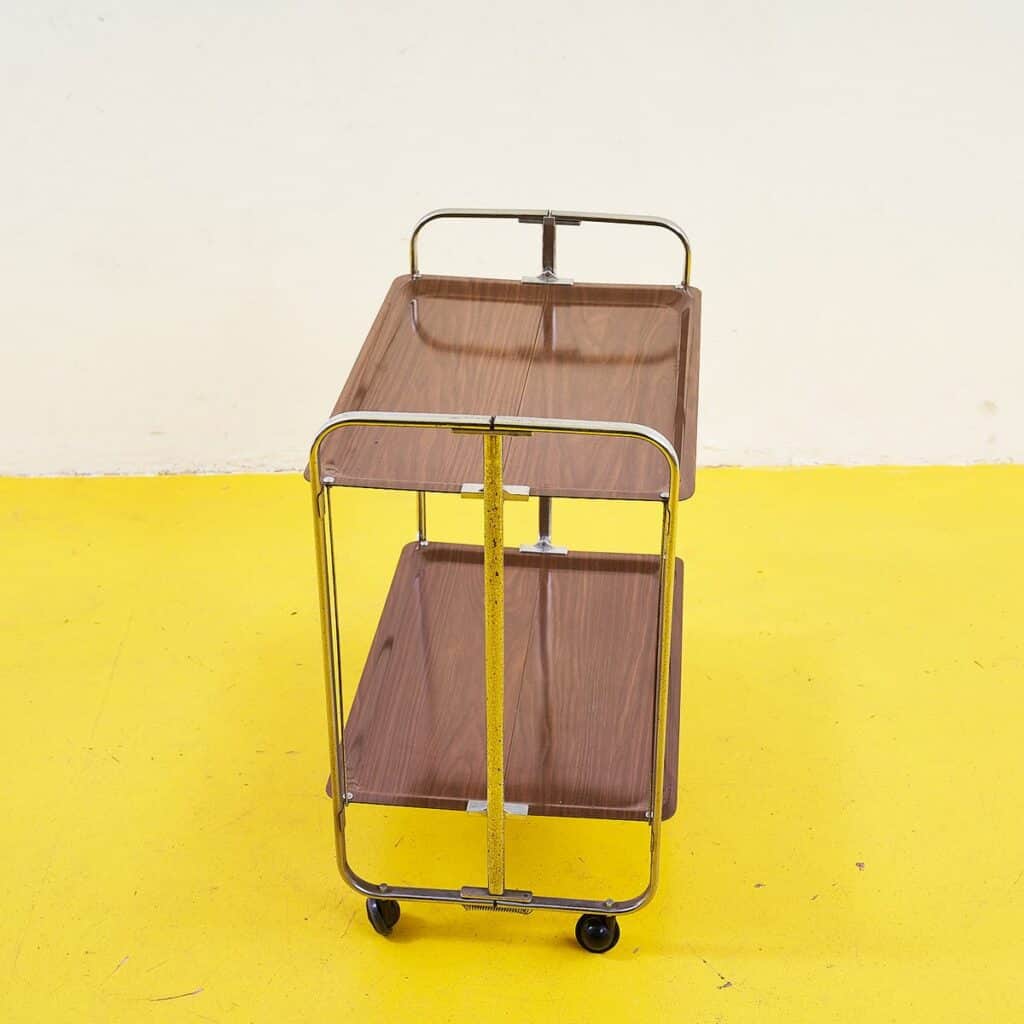 Questo raffinato carrello da servizio vintage e' caratterizzato da una struttura in metallo cromato e due ripiani in legno. Il suo design semplice ma elegante lo rende perfetto per aggiungere un ... Questo raffinato carrello da servizio vintage e' caratterizzato da una struttura in metallo cromato e due ripiani in legno. Il suo design semplice ma elegante lo rende perfetto per aggiungere un tocco di classe a qualsiasi ambiente, sia domestico che commerciale. Le ruote estraibili ne facilitano lo spostamento, offrendo praticita' e versatilita'. Ideale per servire bevande o come tavolino d'appoggio, questo carrello incarna l'estetica senza tempo di meta' secolo. Le condizioni generali sono molto buone, con solo lievi segni di utilizzo che testimoniano il suo affascinante passato. Altro