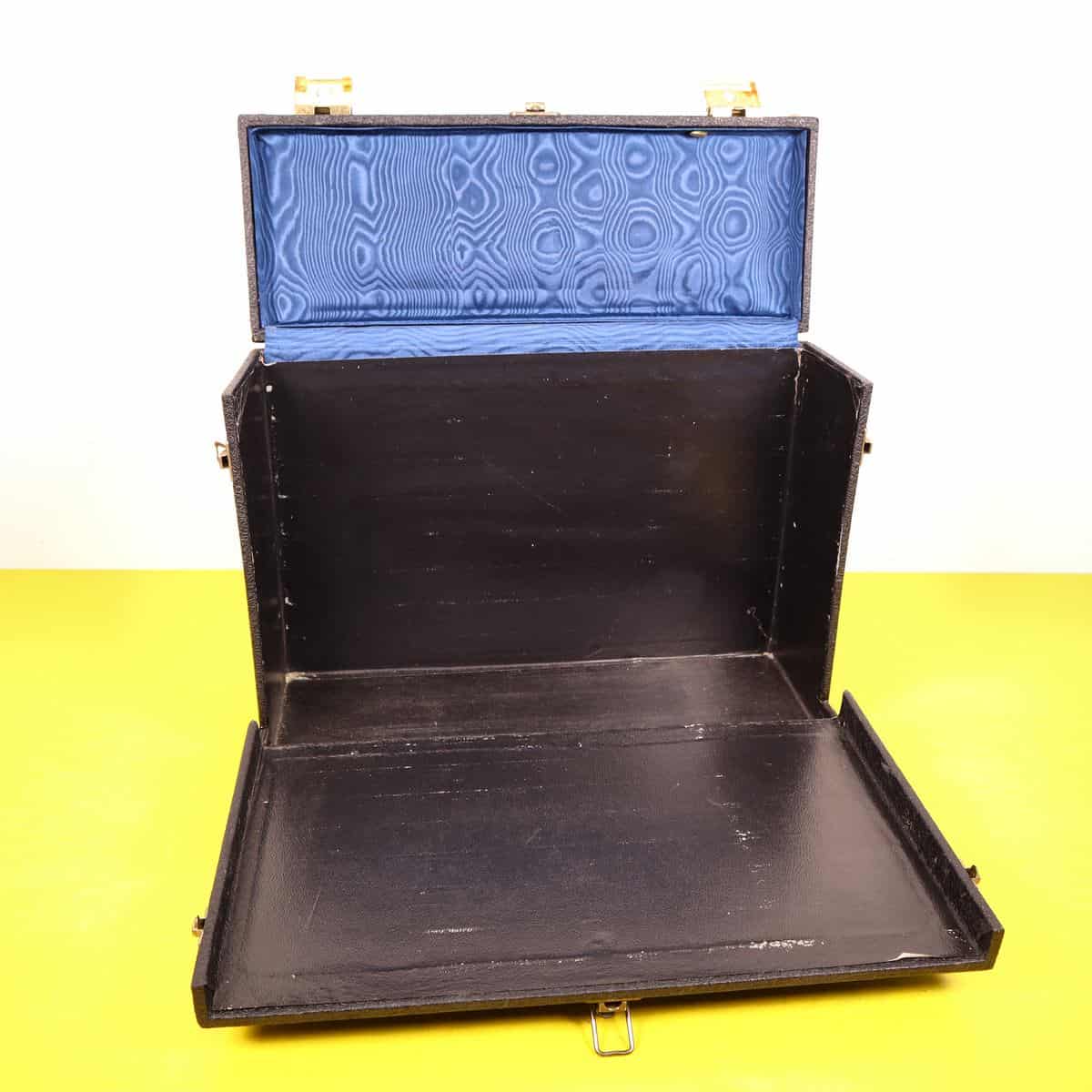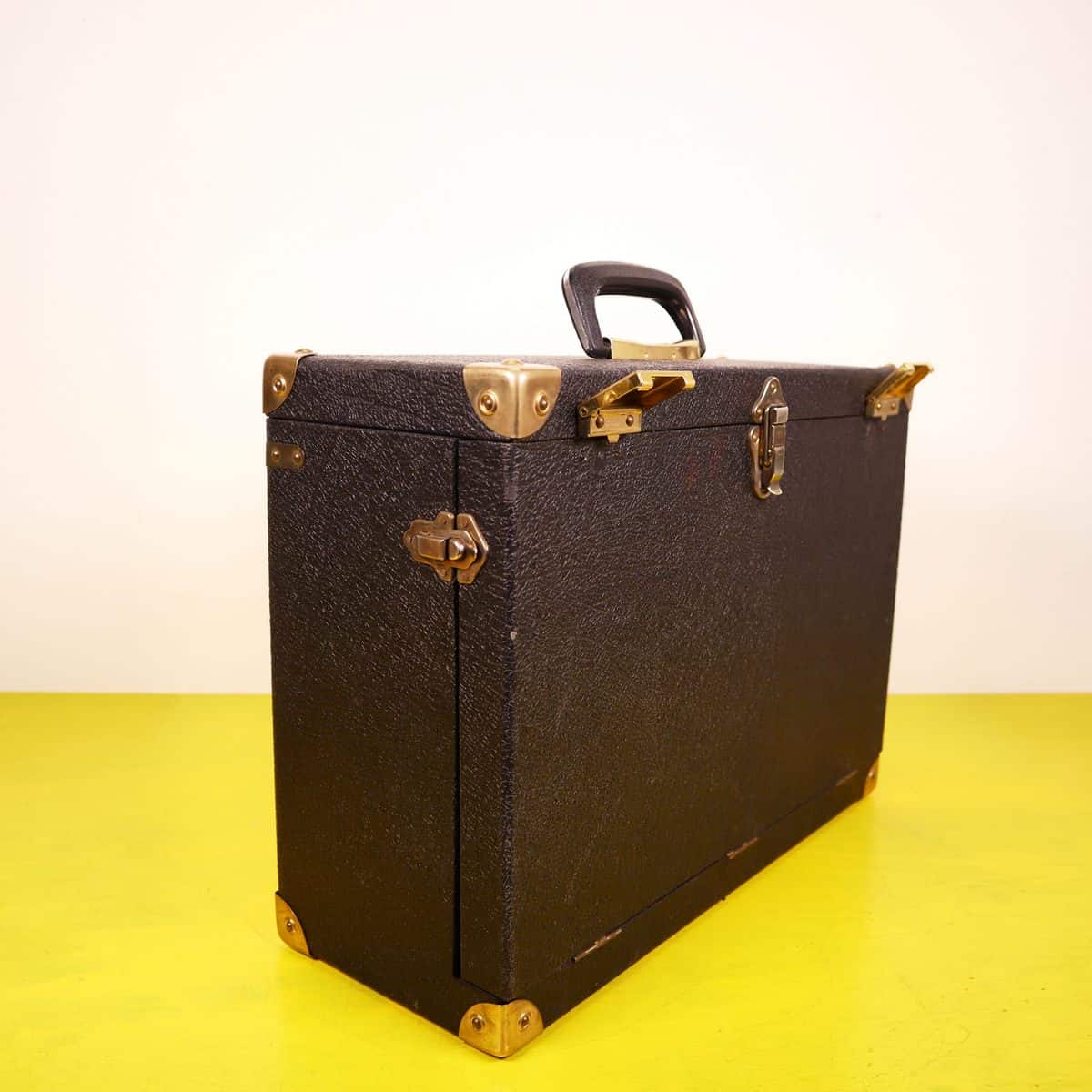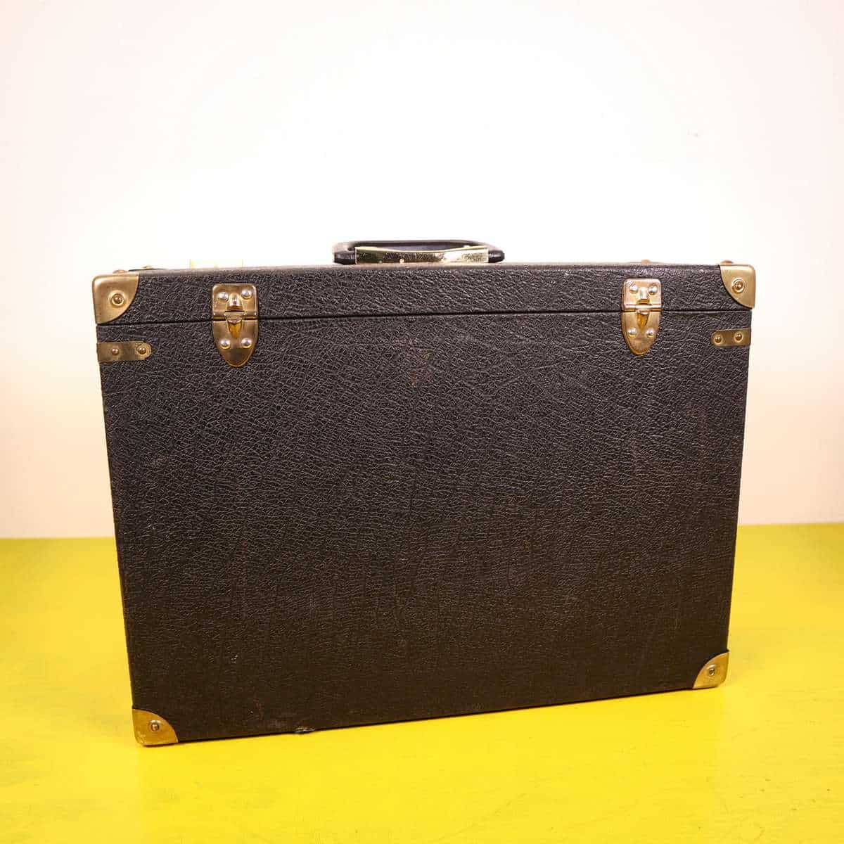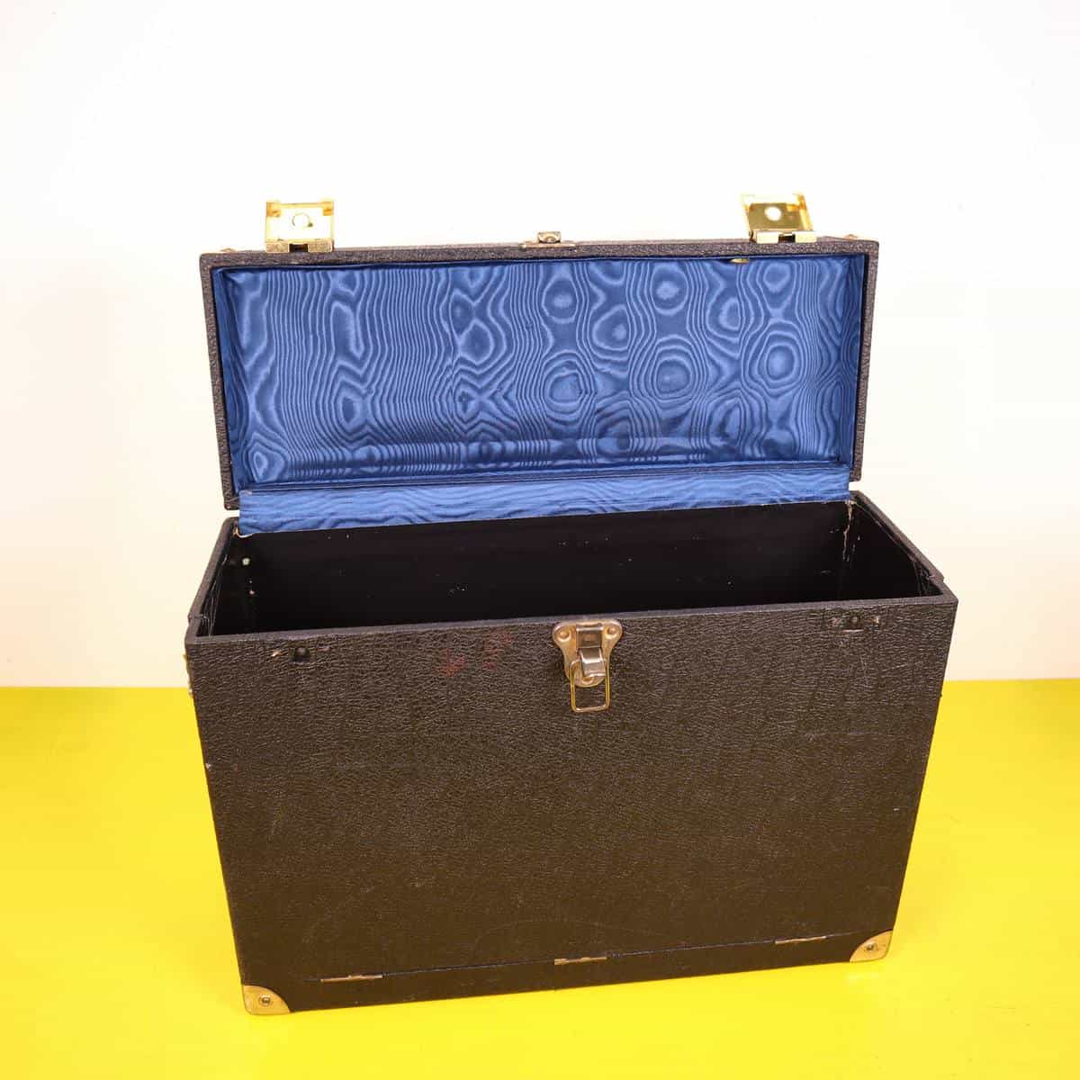 Scopri questa pregiata valigia vintage in pelle nera, un perfetto esempio di design funzionale e classico. Caratterizzata da angoli rinforzati in ottone e chiusure robuste, e' ideale per trasport... Scopri questa pregiata valigia vintage in pelle nera, un perfetto esempio di design funzionale e classico. Caratterizzata da angoli rinforzati in ottone e chiusure robuste, e' ideale per trasportare oggetti importanti in modo sicuro. L'interno e' foderato in tessuto blu, che aggiunge un tocco di eleganza all'aspetto generale. Ottima per un uso pratico o come elemento decorativo per la casa, questa valigia si adatta perfettamente a diversi stili di arredamento. Un accessorio unico per collezionisti o per coloro che amano la moda vintage. Altro