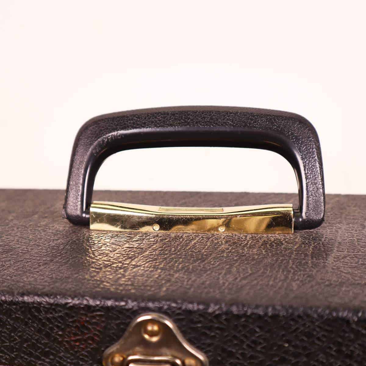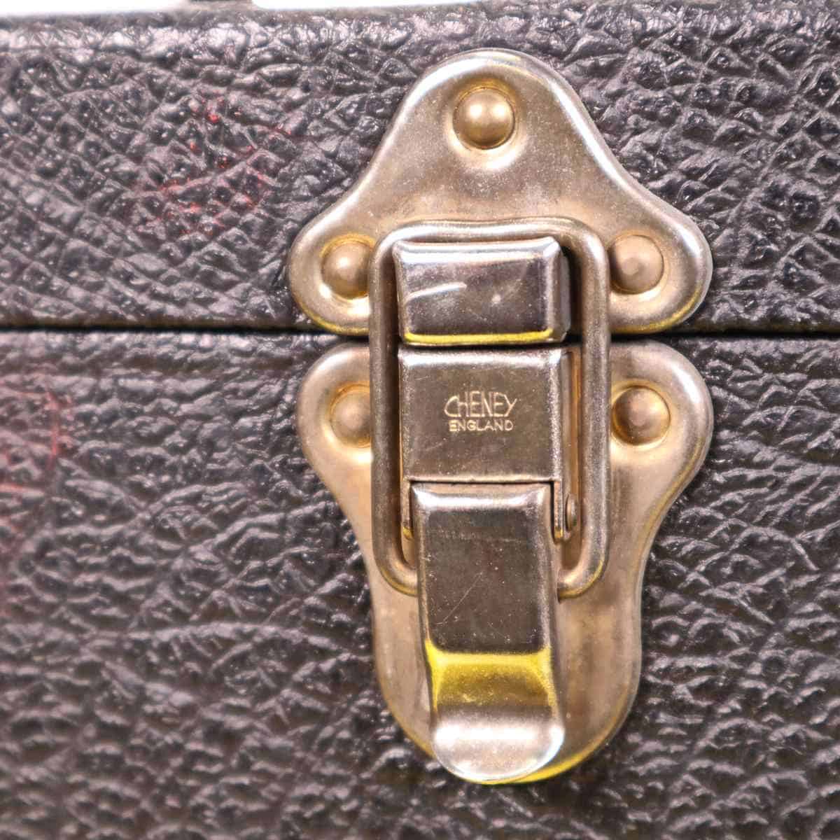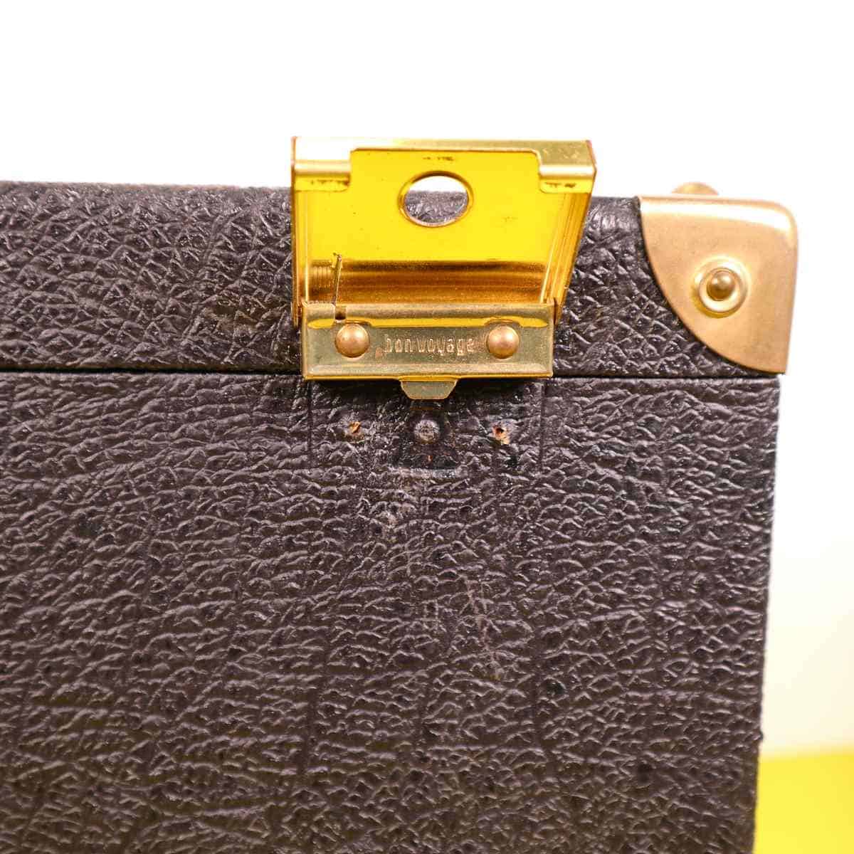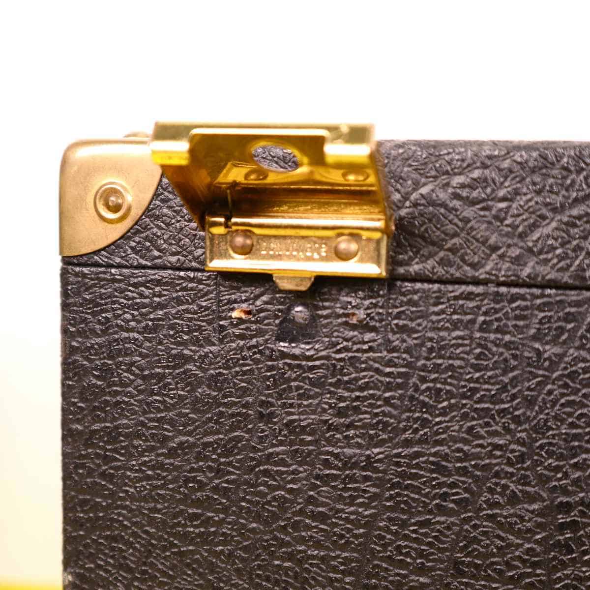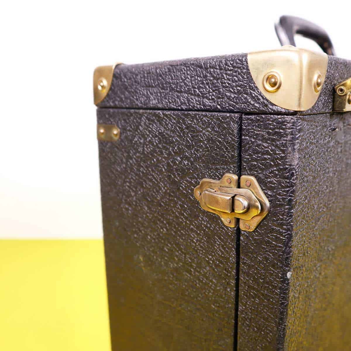 Scopri questa pregiata valigia vintage in pelle nera, un perfetto esempio di design funzionale e classico. Caratterizzata da angoli rinforzati in ottone e chiusure robuste, e' ideale per trasport... Scopri questa pregiata valigia vintage in pelle nera, un perfetto esempio di design funzionale e classico. Caratterizzata da angoli rinforzati in ottone e chiusure robuste, e' ideale per trasportare oggetti importanti in modo sicuro. L'interno e' foderato in tessuto blu, che aggiunge un tocco di eleganza all'aspetto generale. Ottima per un uso pratico o come elemento decorativo per la casa, questa valigia si adatta perfettamente a diversi stili di arredamento. Un accessorio unico per collezionisti o per coloro che amano la moda vintage. Altro