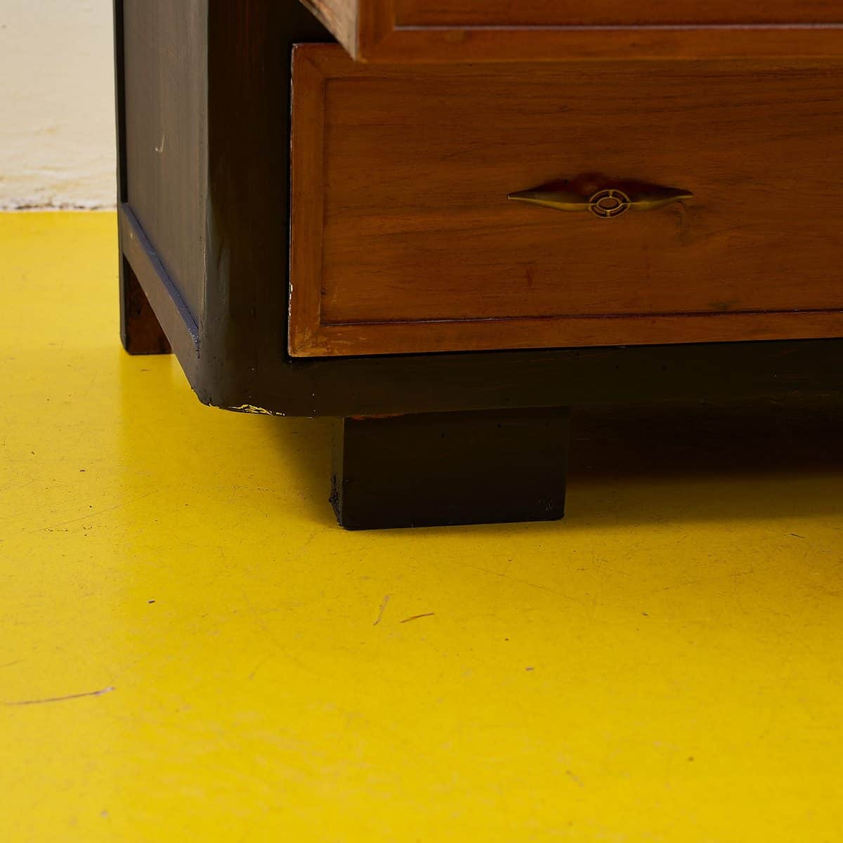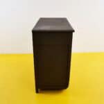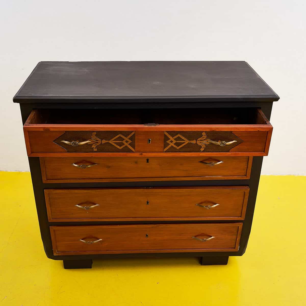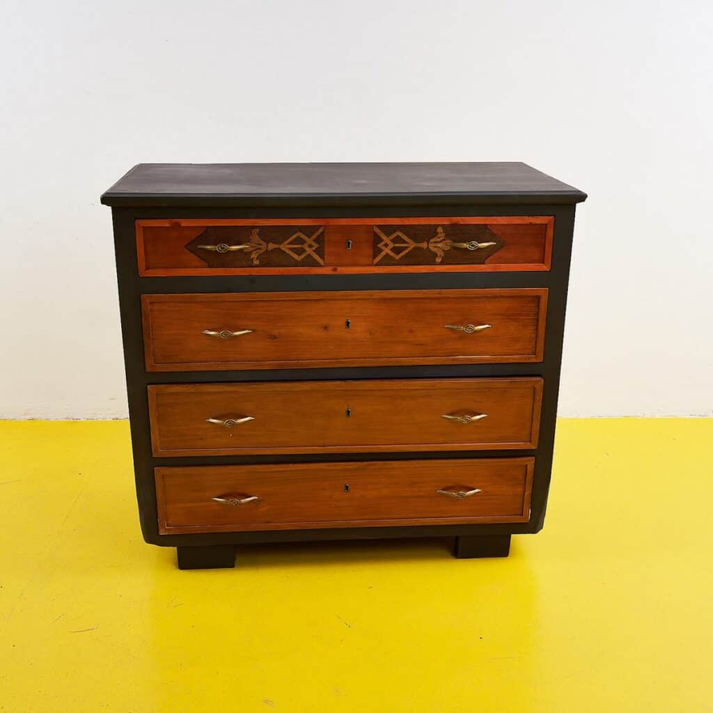 Questa splendida cassettiera vintage e' un esempio perfetto di design funzionale e raffinato. Presenta un raffinato lavoro di intarsio su pannelli di legno, che conferisce un tocco di eleganza a ... Questa splendida cassettiera vintage e' un esempio perfetto di design funzionale e raffinato. Presenta un raffinato lavoro di intarsio su pannelli di legno, che conferisce un tocco di eleganza a qualsiasi ambiente. I quattro cassetti offrono ampio spazio per riporre i tuoi oggetti, mentre la superficie superiore, verniciata con una finitura nera, e' ideale per esporre decorazioni. Realizzata con materiali di alta qualita', questa cassettiera rappresenta un notevole pezzo di antiquariato che racconta storie e memorie del passato. Perfetta per chi cerca un elemento distintivo per arricchire la propria casa. Altro