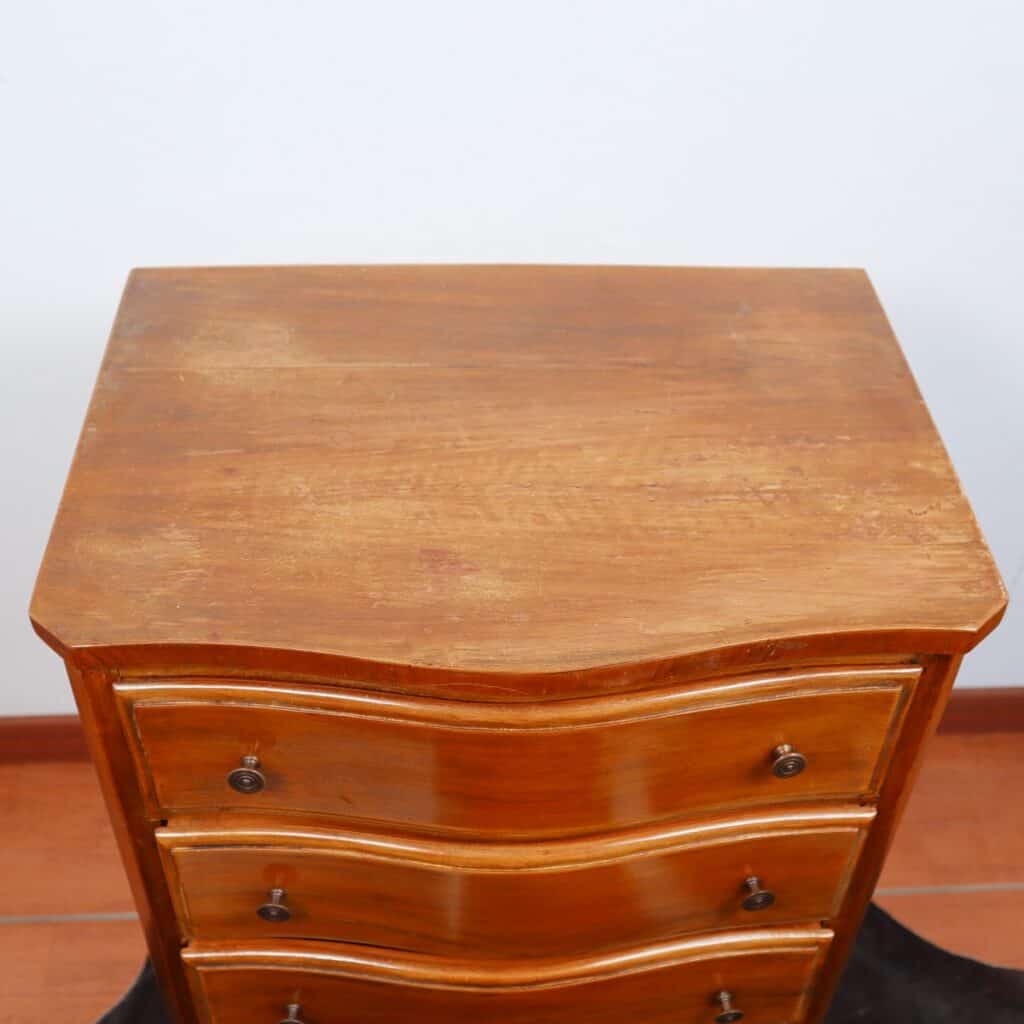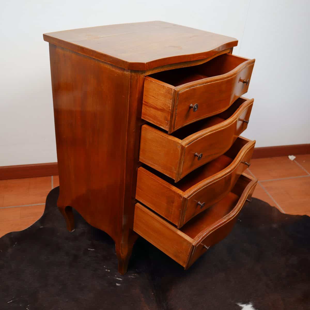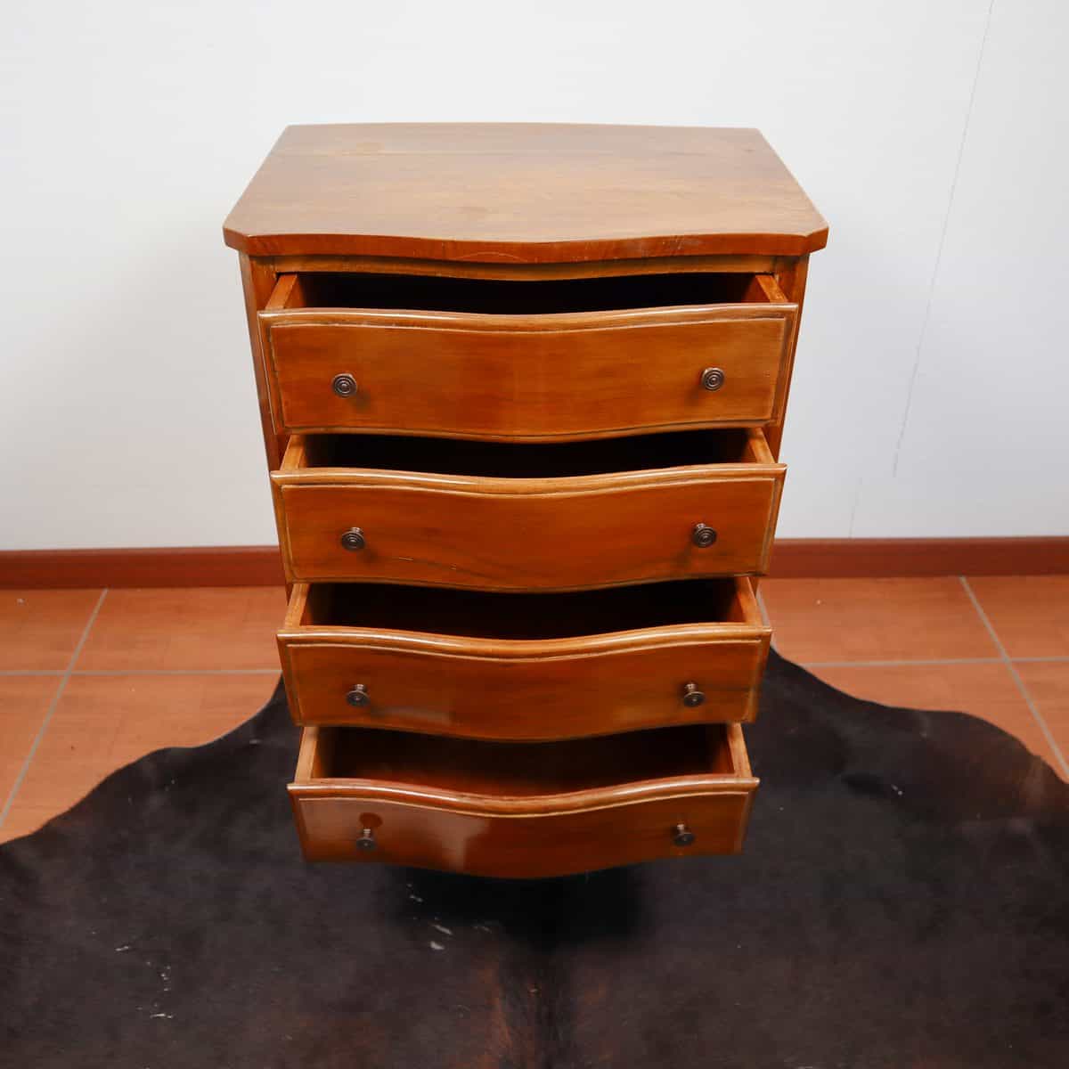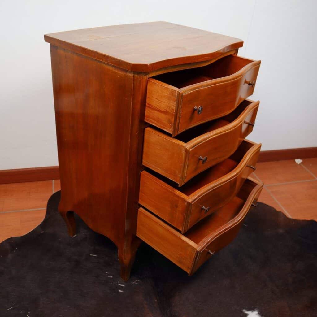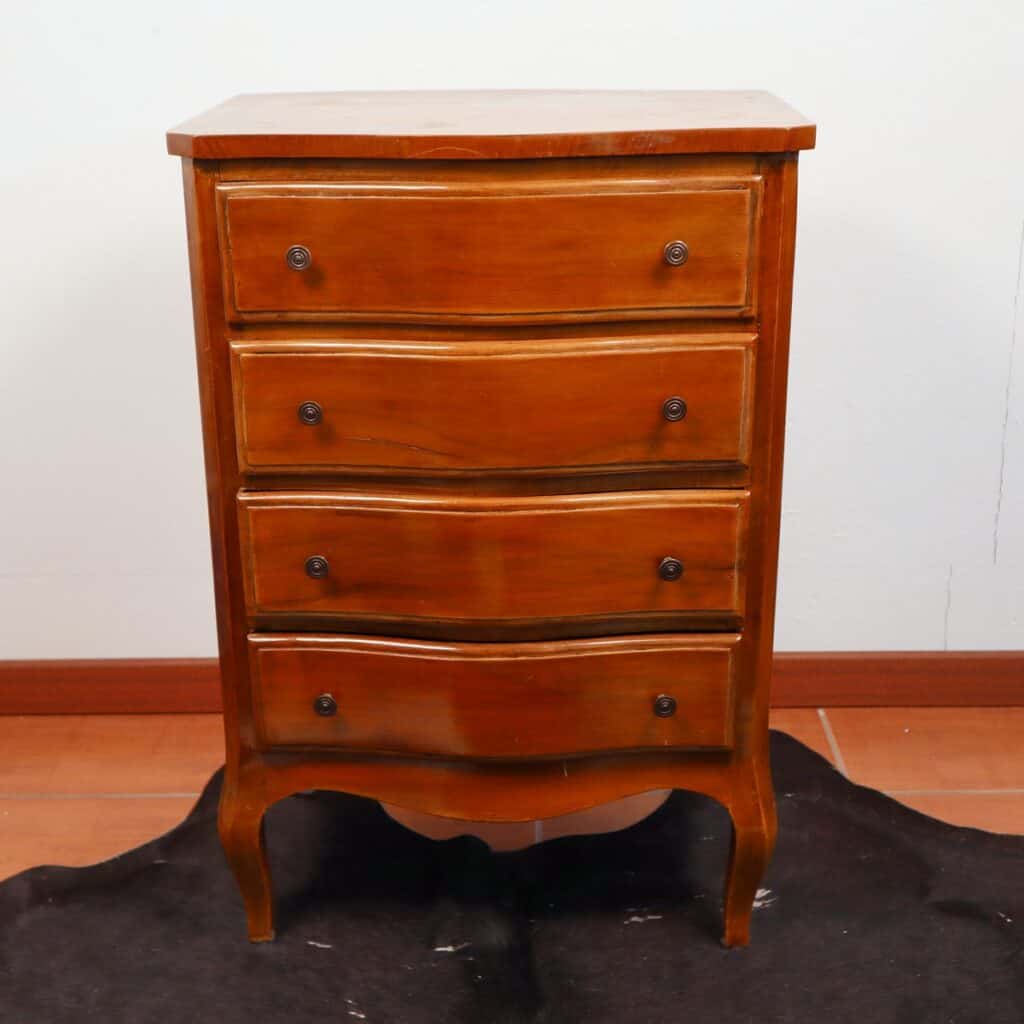 Questo splendido como' antico rappresenta un pezzo unico di design per arricchire qualsiasi ambiente. Realizzato in legno di alta qualita', offre quattro cassetti ampi e funzionali per ripor... Questo splendido como' antico rappresenta un pezzo unico di design per arricchire qualsiasi ambiente. Realizzato in legno di alta qualita', offre quattro cassetti ampi e funzionali per riporre oggetti con stile. Le curve eleganti e i dettagli rifiniti dei cassetti, arricchiti da maniglie in metallo, aggiungono un tocco di fascino senza tempo. Le gambe sottili e arcuate donano leggerezza e grazia al como', che si adatta perfettamente a soggiorni e camere da letto in cerca di un tocco classico. I segni del tempo contribuiscono al suo carattere, facendo di questo pezzo un vero gioiello per gli amanti dell'antiquariato. Altro