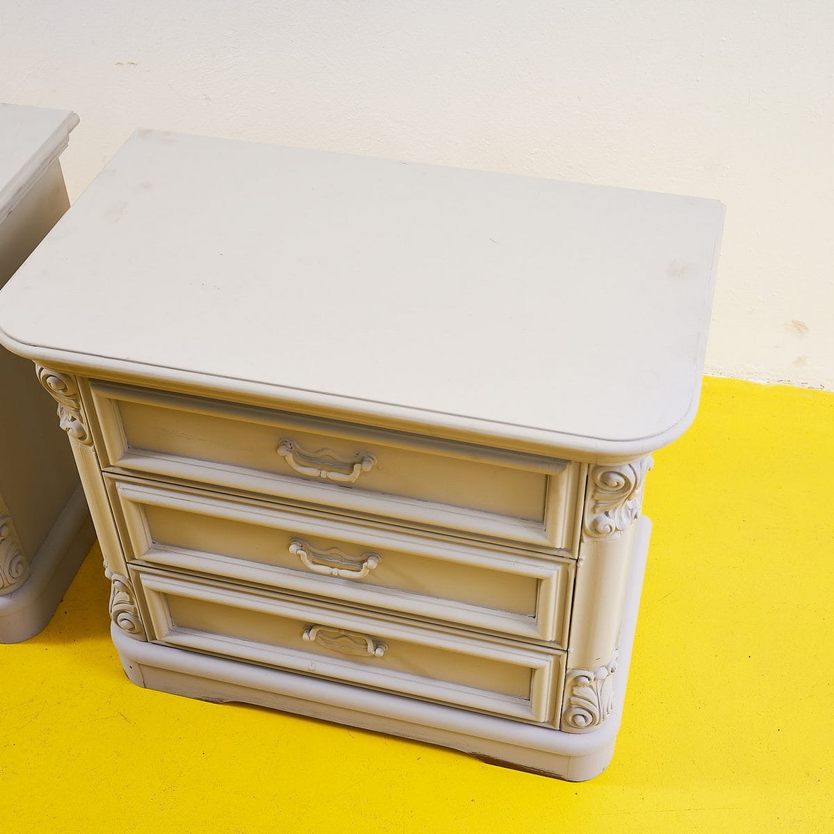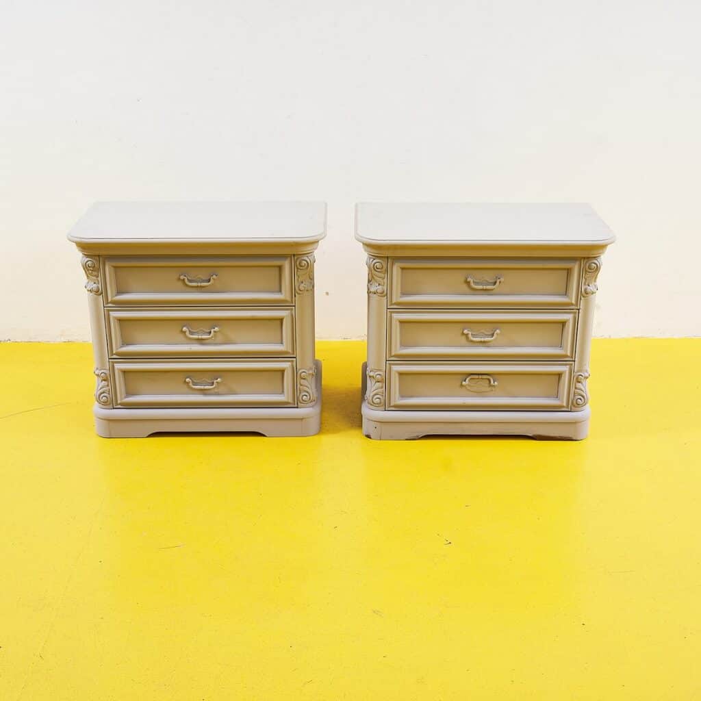 Questo affascinante coppia di comodini vintage in legno rappresenta un perfetto connubio di eleganza e funzionalita'. Caratterizzato da un design curato, presenta delicati dettagli decorativi ai ... Questo affascinante coppia di comodini vintage in legno rappresenta un perfetto connubio di eleganza e funzionalita'. Caratterizzato da un design curato, presenta delicati dettagli decorativi ai lati e tre spaziosi cassetti, ideali per riporre oggetti personali. La finitura chiara dona luminosita' all'ambiente e si integra perfettamente in qualsiasi contesto abitativo. Perfetto come comodino o come elemento decorativo in una camera da letto, questo pezzo misura un'ottima funzionalita' senza compromettere lo stile. Un'aggiunta speciale per chi ama il design d'epoca. Altro