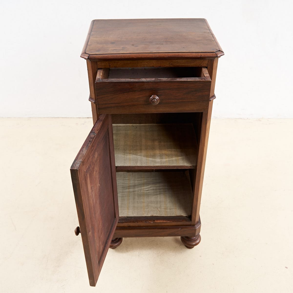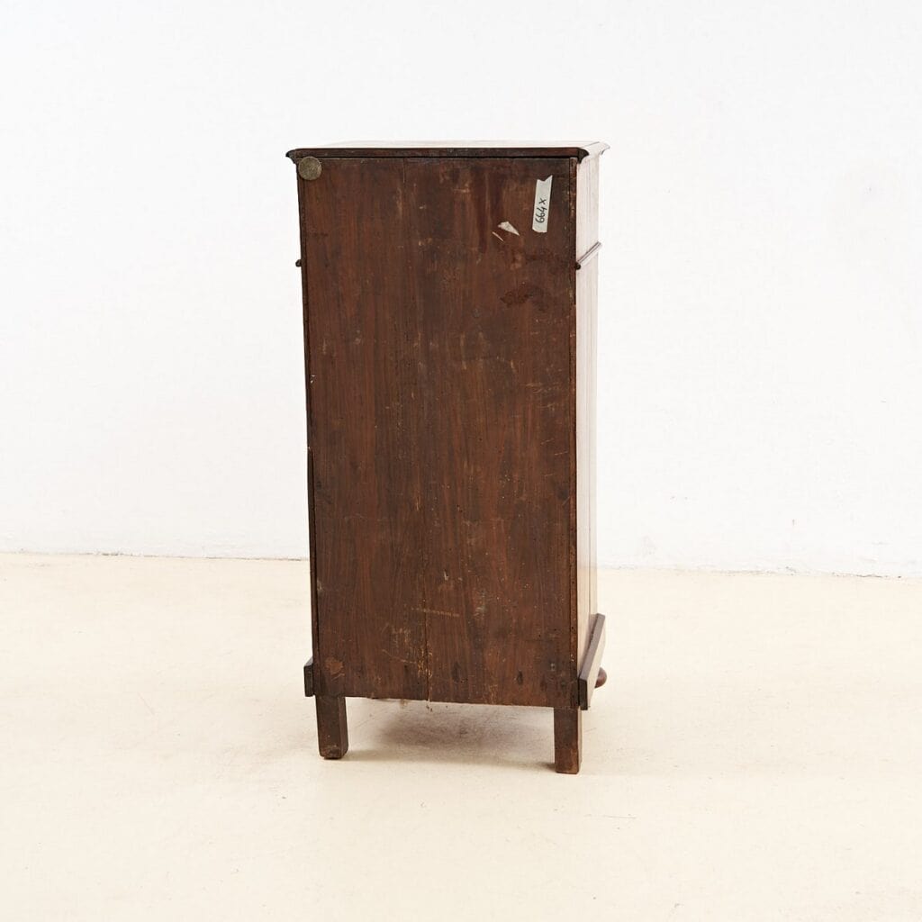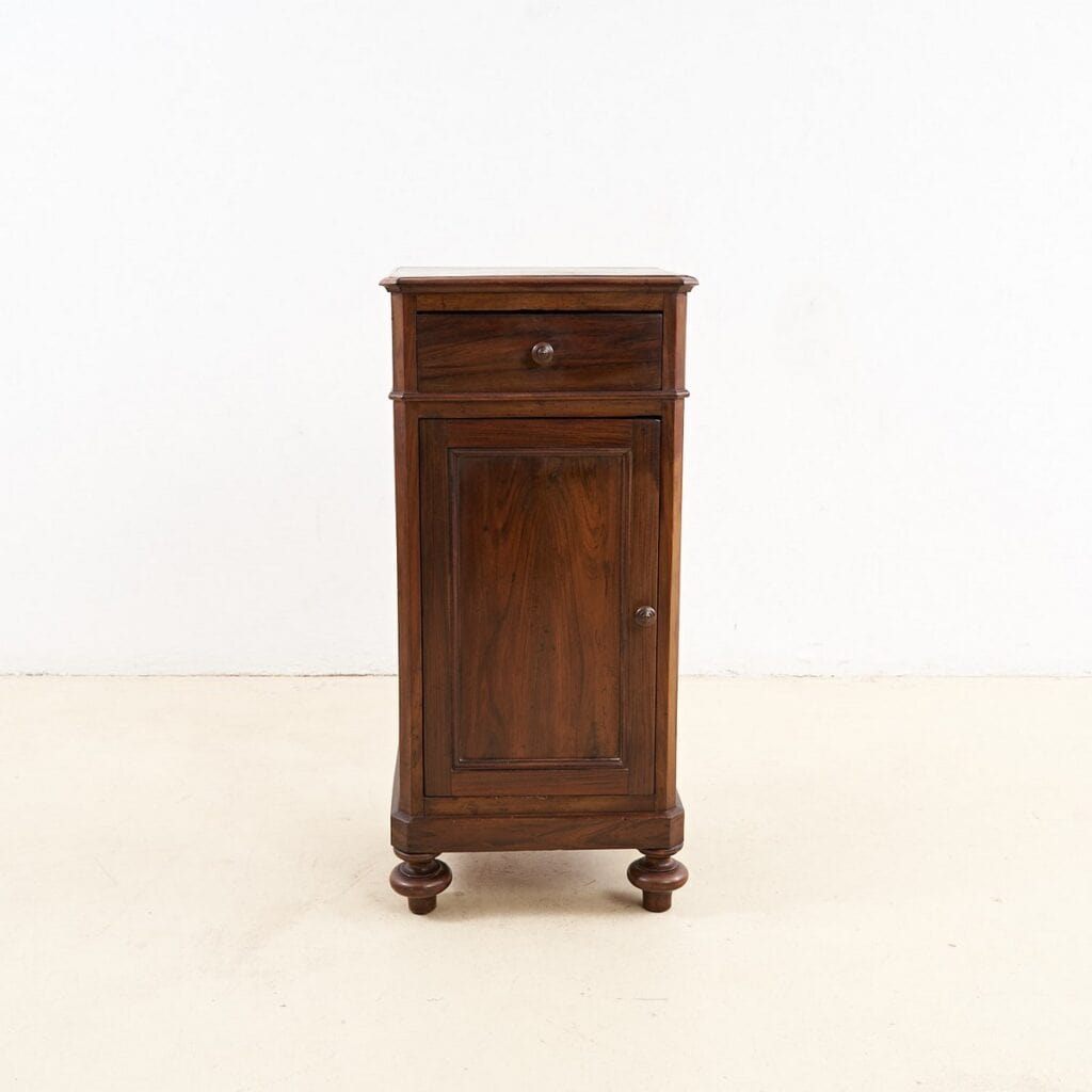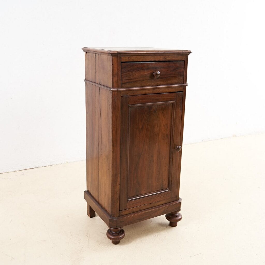 Questo raffinato mobiletto e' un esempio di artefatto di design che unisce eleganza e funzionalita'. Rivestito in legno massello con una finitura calda e avvolgente, il mobiletto si colloca ... Questo raffinato mobiletto e' un esempio di artefatto di design che unisce eleganza e funzionalita'. Rivestito in legno massello con una finitura calda e avvolgente, il mobiletto si colloca facilmente in contesti sia moderni che tradizionali. Caratterizzato da una sobria linea, presenta un cassetto superiore e una porta inferiore per offrire spazio pratico di archiviazione. Le gambe rotonde e dettagli lievi sulla superficie ne accentuano la qualita' costruttiva. Questo pezzo, risalente probabilmente agli inizi del '900, e' in condizioni eccellenti, pronto ad essere utilizzato come pratico comodino o elegante supporto decorativo in soggiorno. Perfetto per chi cerca un tocco di vintage senza tempo nella propria abitazione. Altro