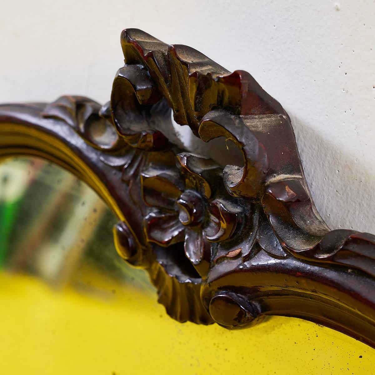Questo affascinante specchio in stile barocco e' un pezzo unico che porta un tocco di classe e opulenza a qualsiasi ambiente. La cornice splendidamente scolpita in legno scuro presenta dettagli b... Questo affascinante specchio in stile barocco e' un pezzo unico che porta un tocco di classe e opulenza a qualsiasi ambiente. La cornice splendidamente scolpita in legno scuro presenta dettagli barocchi elaborati, con fiori e linee curve che evidenziano l'artigianato di alta qualita'. Il vetro riflette con grazia la luce, rendendolo non solo un oggetto funzionale, ma anche un elemento decorativo straordinario. Ideale per arredare salotti o ingressi, questo specchio e' un perfetto connubio di funzionalita' ed eleganza, perfetto per chi ama il design classico. Altro