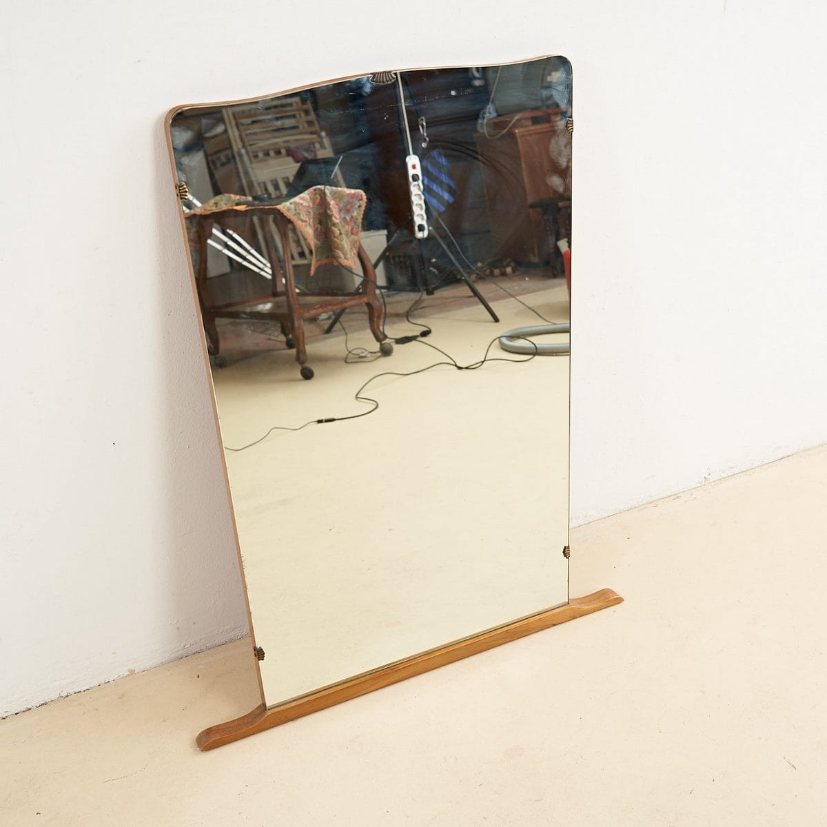 Questo elegante specchio vintage rappresenta un pezzo unico di design del XX secolo. Caratterizzato da una forma sinuosa e da una finitura lucida, il vetro e' sostenuto da una raffinata base in legno ... Questo elegante specchio vintage rappresenta un pezzo unico di design del XX secolo. Caratterizzato da una forma sinuosa e da una finitura lucida, il vetro e' sostenuto da una raffinata base in legno chiaro, che ne esalta l'aspetto sofisticato. I dettagli costruttivi includono una cornice in legno con elementi decorativi in metallo, rendendolo non solo funzionale ma anche un'opera d'arte da esposizione. Presenta segni di usura, testimoniando la sua autenticita' come oggetto d'epoca, ma e' in ottime condizioni generali. Questo specchio versatile e' perfetto per qualsiasi spazio interno, dal soggiorno alla camera da letto, donando un tocco di classe e stile retro' all'ambiente. Altro