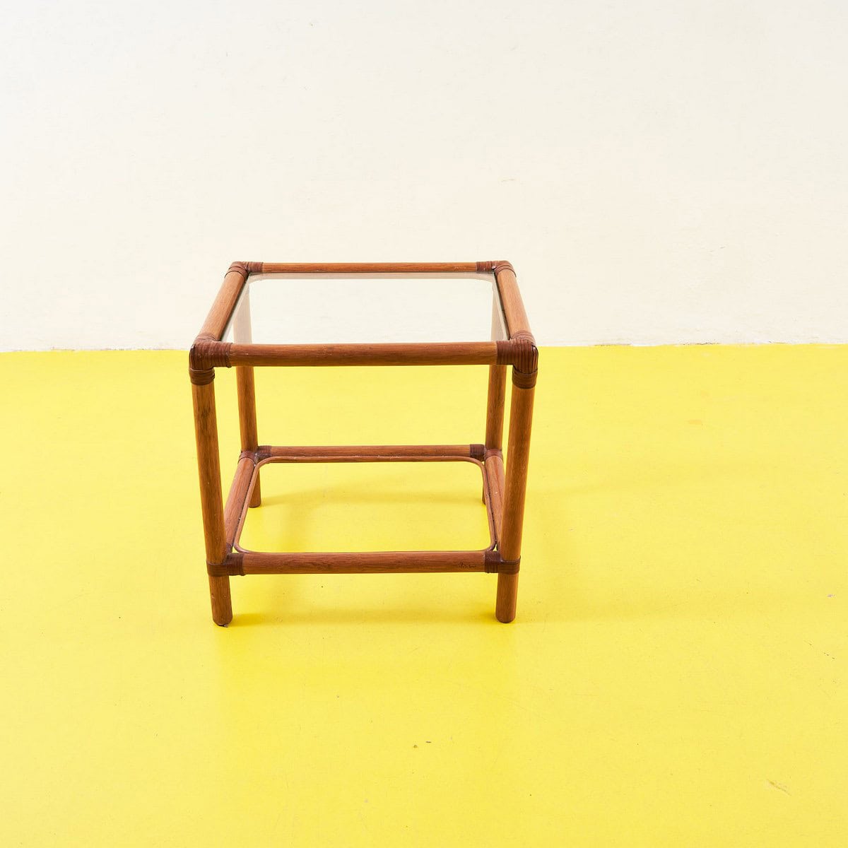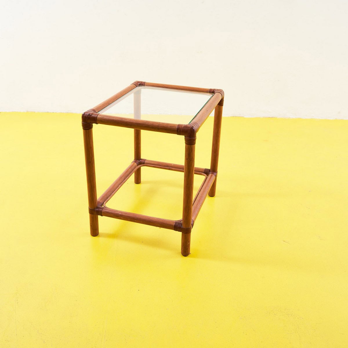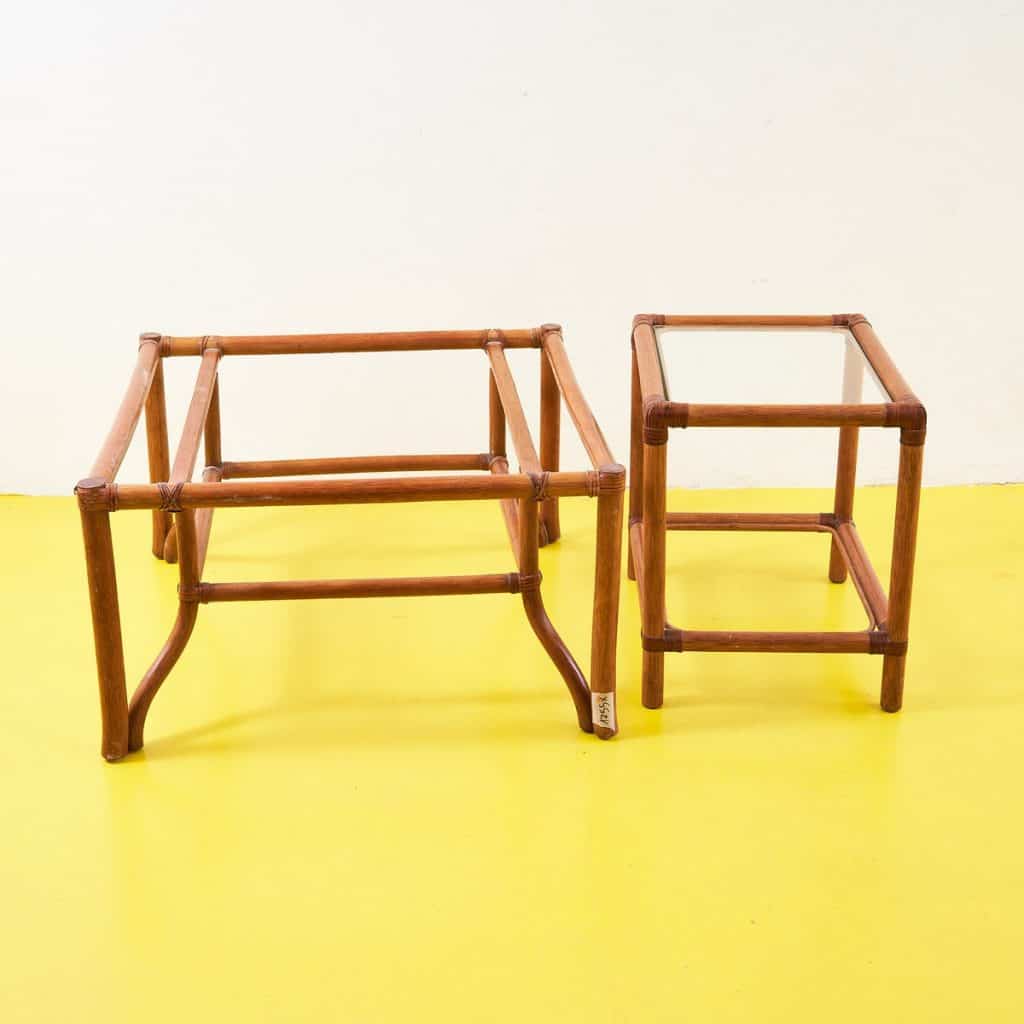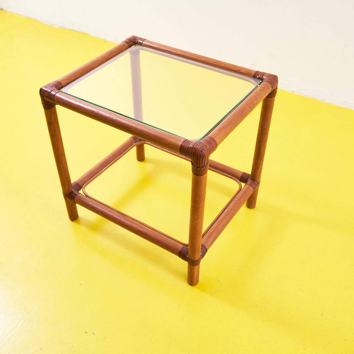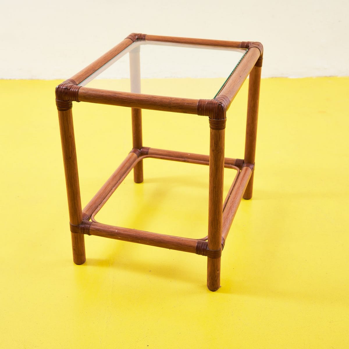 Questa raffinata coppia di tavolini, realizzati in canna di bambu', rappresenta una testimonianza del design italiano degli anni '80. Ogni tavolino presenta una struttura leggera ma robusta,... Questa raffinata coppia di tavolini, realizzati in canna di bambu', rappresenta una testimonianza del design italiano degli anni '80. Ogni tavolino presenta una struttura leggera ma robusta, caratterizzata da dettagli artigianali e un'attrattiva estetica che fonde funzionalita' e stile. I piani in vetro conferiscono un tocco di eleganza moderna, rendendo questi tavolini adatti a qualsiasi ambiente, sia contemporaneo che vintage. Ideali per il soggiorno o come pezzo centrale in una sala da pranzo, questi tavolini non sono solo funzionali, ma anche opere d'arte da ammirare. Altro