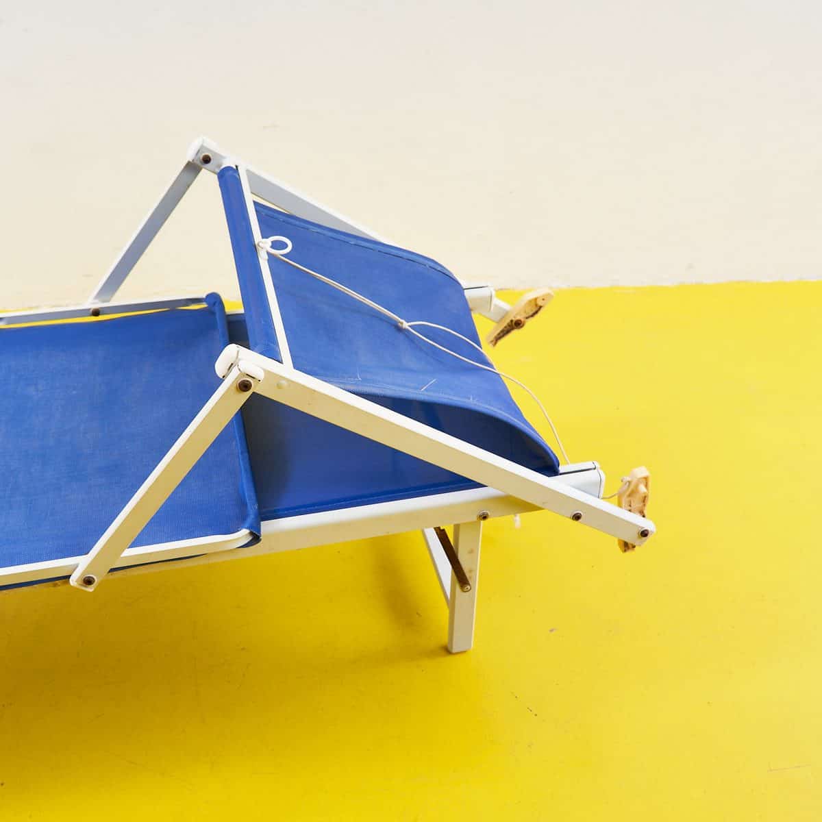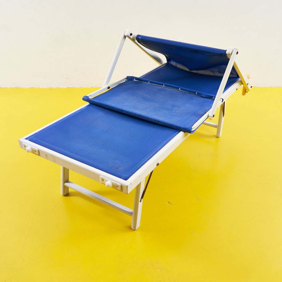 Scopri il fascino di questo lettino reclinabile vintage, un perfetto esempio di design della meta' del XX secolo. Realizzato in robusto metallo verniciato bianco, presenta un'ampia superfici... Scopri il fascino di questo lettino reclinabile vintage, un perfetto esempio di design della meta' del XX secolo. Realizzato in robusto metallo verniciato bianco, presenta un'ampia superficie di appoggio in tessuto blu, ideale per momenti di relax all'aperto o in giardino. La struttura e' pieghevole e facilmente trasportabile, rendendolo un'ottima scelta per chi ama godere del sole durante l'estate. Il meccanismo di reclinazione consente di adattare l'inclinazione della schiena per un comfort personalizzato. Questo pezzo non solo e' funzionale, ma aggiungera' anche un tocco retro al tuo spazio. Le condizioni sono buone, con lievi segni di usura che testimoniano la sua storia. Altro