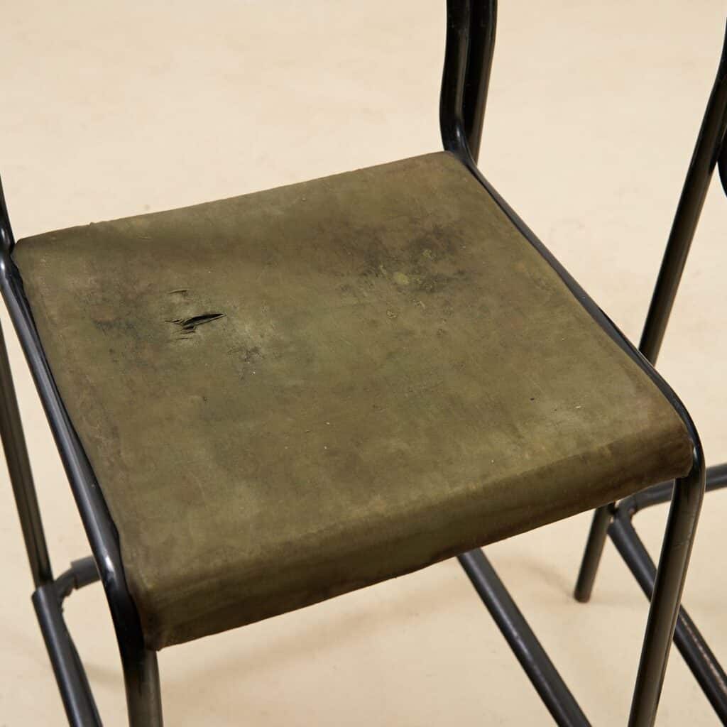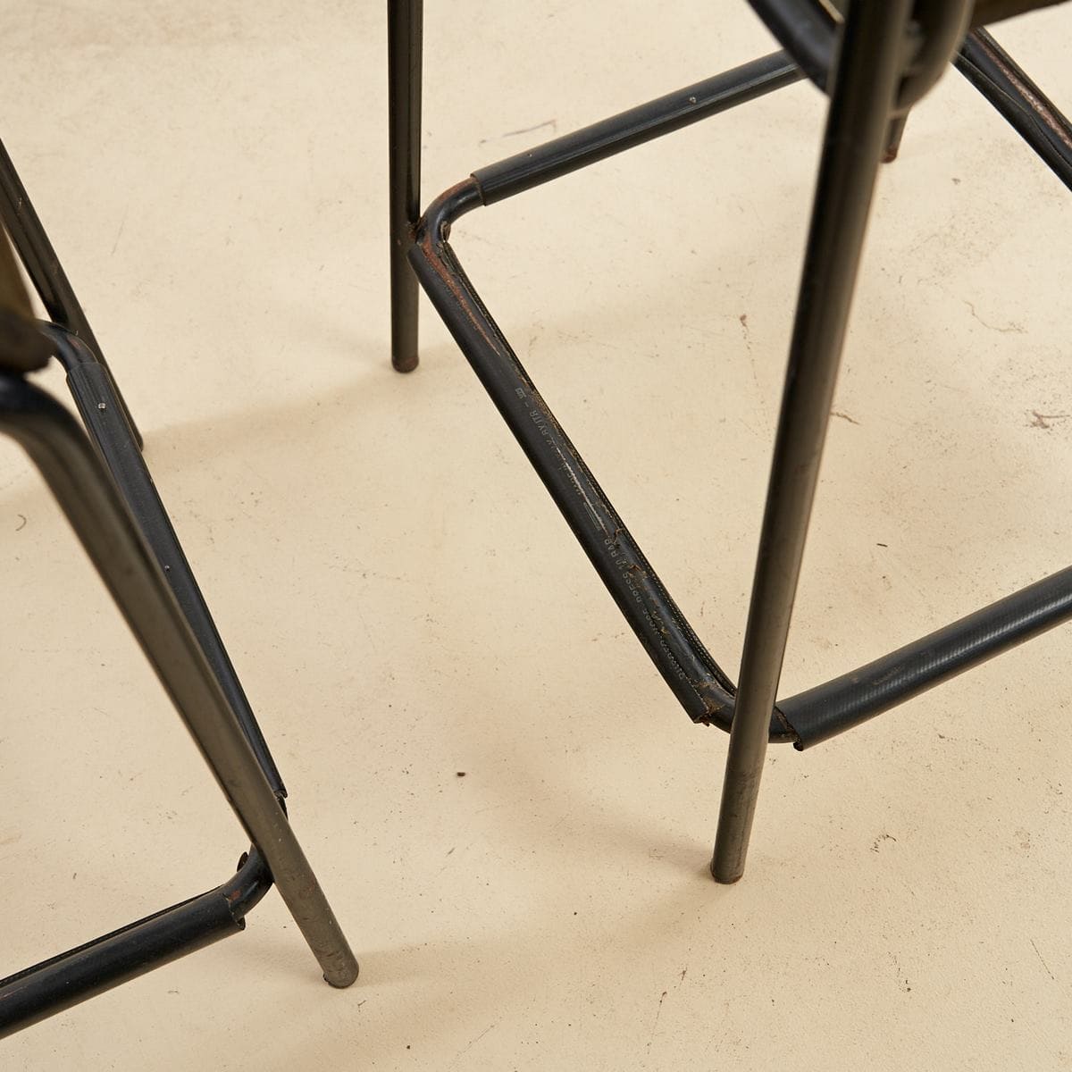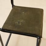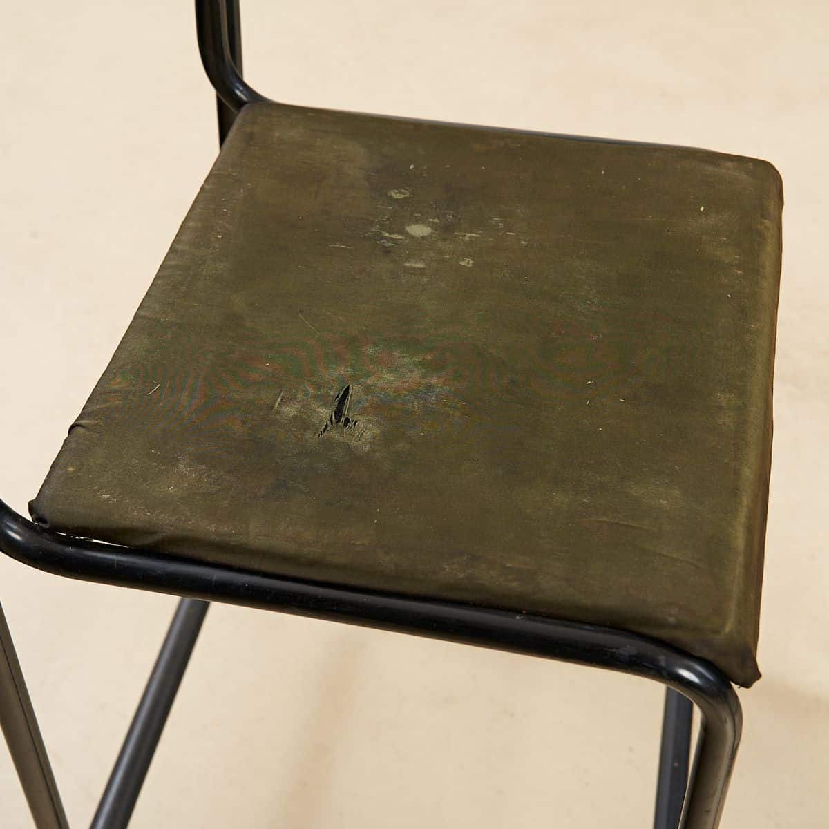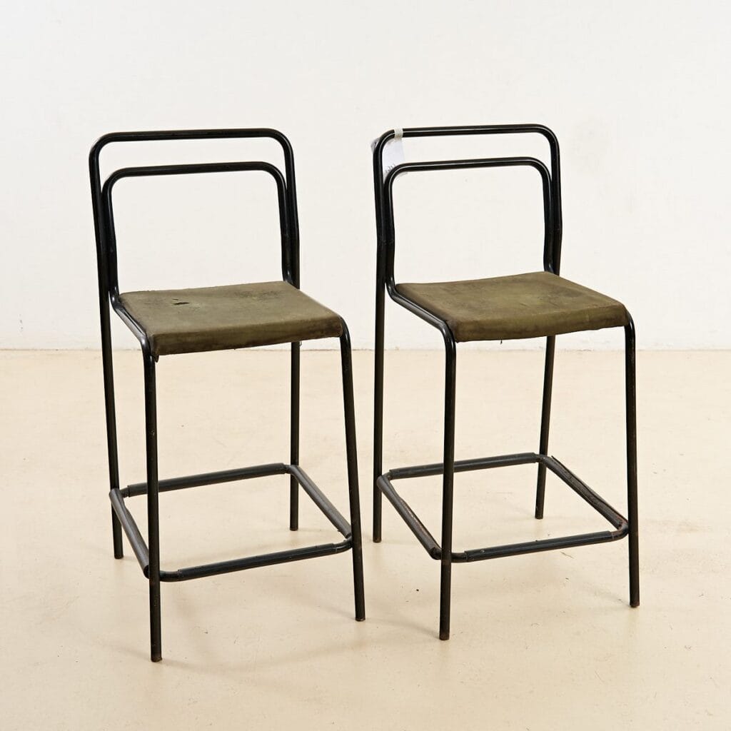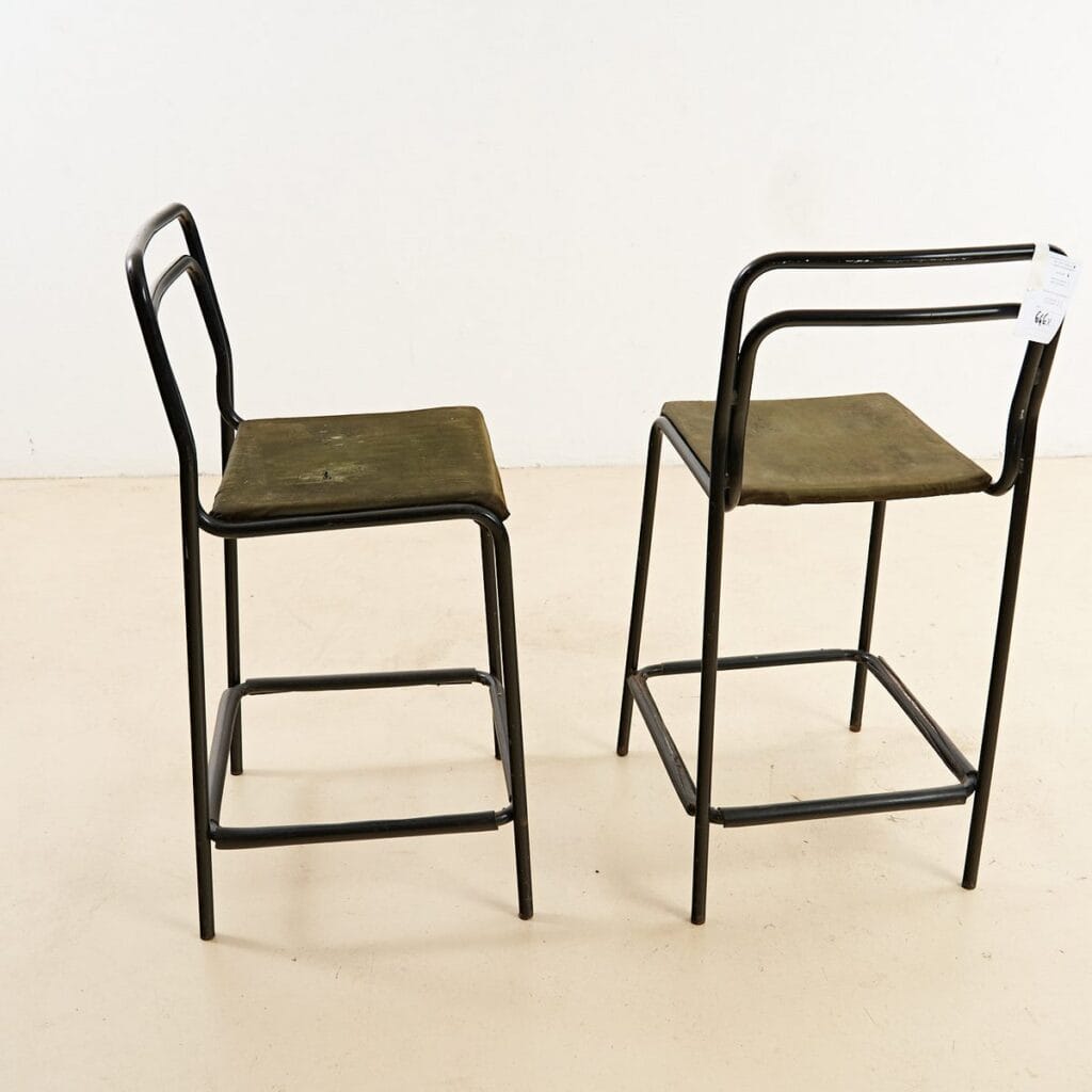 Questo affascinante set di due sgabelli in metallo, perfetto per gli amanti del design minimalista, risale agli anni '60. Ogni sgabello presenta una struttura robusta in metallo nero, con linee s... Questo affascinante set di due sgabelli in metallo, perfetto per gli amanti del design minimalista, risale agli anni '60. Ogni sgabello presenta una struttura robusta in metallo nero, con linee semplici e geometriche. I sedili sono rivestiti in un tessuto verde oliva, portatore di una patina d'epoca che ne esalta il carattere vintage. Mentre i seggi sono in buone condizioni, mostrano segni di usura che raccontano storie del passato, rendendoli unici. Ideali per un bar, una cucina moderna o anche come accent pieces in uno spazio urbano, questi sgabelli offrono non solo funzionalita', ma anche un tocco di stile retro' che non passera' inosservato. Altro