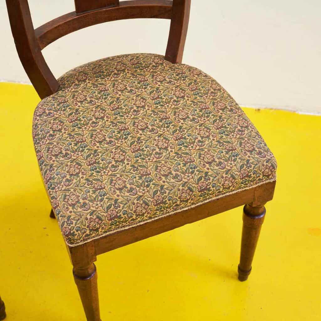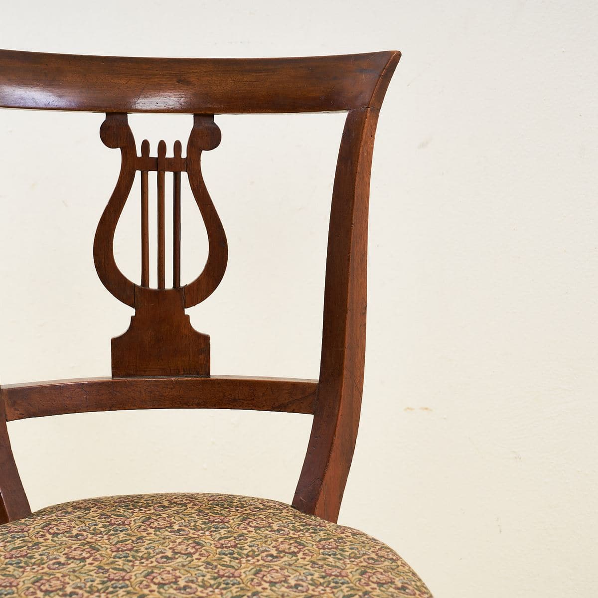 Questa coppia di sedie rappresenta un perfetto esempio di design classico, unendo funzionalita' ed estetica. Realizzate in legno massello, presentano un design raffinato e dettagli decorativi a f... Questa coppia di sedie rappresenta un perfetto esempio di design classico, unendo funzionalita' ed estetica. Realizzate in legno massello, presentano un design raffinato e dettagli decorativi a forma di lira sulla spalliera, che aggiungono un tocco di eleganza. I cuscini imbottiti, caratterizzati da un tessuto floreale dai toni caldi, garantiscono comfort senza compromettere lo stile. Questo set e' ideale per completare un soggiorno o una sala da pranzo, regalando un'atmosfera di charme e nostalgia. Anche se possono presentare lievi segni d'usura, le sedie sono in buone condizioni e pronte per essere utilizzate in ogni ambiente. Altro