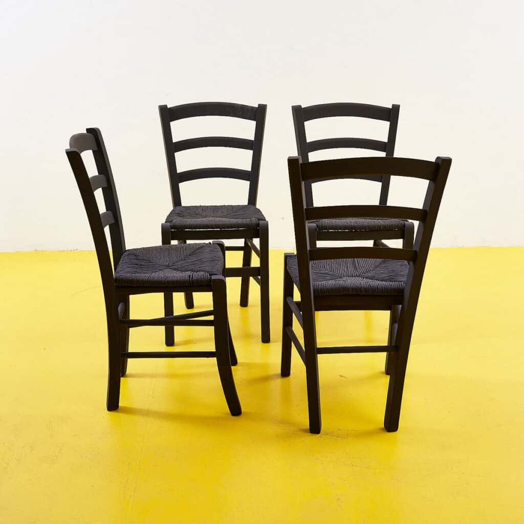 Queste sedie in stile rustico rappresentano un perfetto connubio di funzionalita' e design. Realizzate con una robusta struttura in legno nero e seduta intrecciata in corda, offrono comfort e ver... Queste sedie in stile rustico rappresentano un perfetto connubio di funzionalita' e design. Realizzate con una robusta struttura in legno nero e seduta intrecciata in corda, offrono comfort e versatilita' per ogni ambiente, dalla cucina alla sala da pranzo. Il design semplice ma affascinante rende queste sedie un'ottima scelta per chi cerca un tocco di eleganza classica. La loro finitura nera conferisce un aspetto moderno, mentre il materiale naturale addolcisce il look complessivo. Con il loro fascino vintage, sono ideali per chi desidera arricchire la propria casa con pezzi unici. Perfette da abbinare a tavoli in legno o metallo, queste sedie sono una scelta senza tempo. Altro