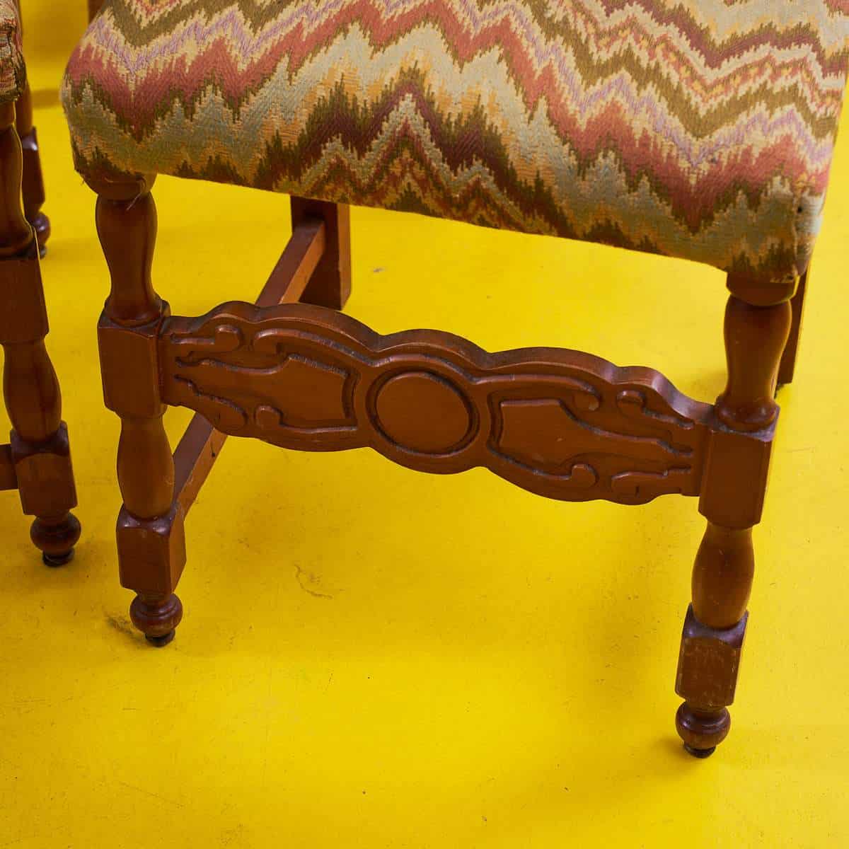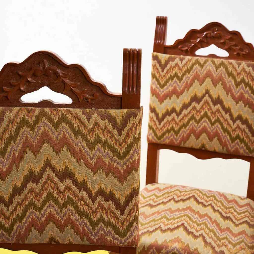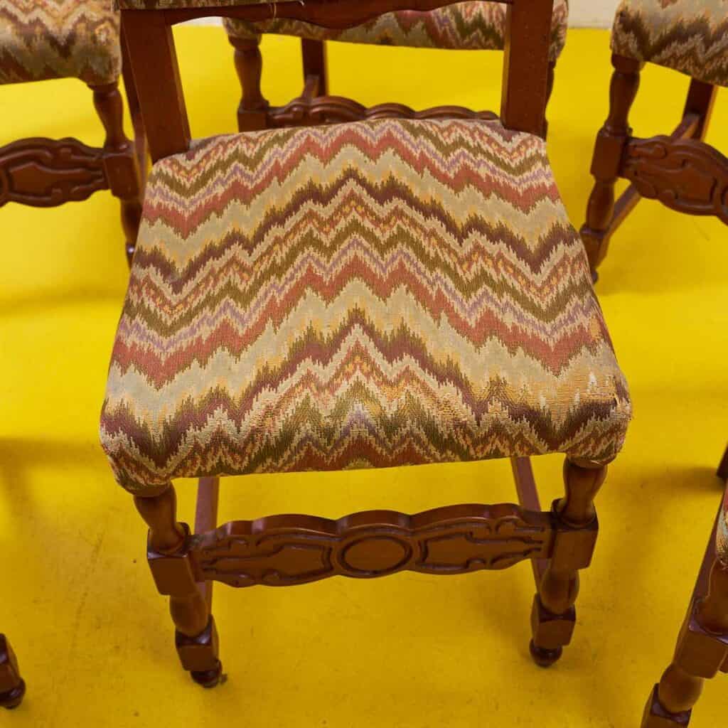 Questo affascinante set di sedie vintage e' un vero gioiello per gli amanti dell'arredo d'epoca. Caratterizzate da un design raffinato, ogni sedia presenta una struttura in legno pregia... Questo affascinante set di sedie vintage e' un vero gioiello per gli amanti dell'arredo d'epoca. Caratterizzate da un design raffinato, ogni sedia presenta una struttura in legno pregiato, con dettagli intagliati che ne esaltano la bellezza. Il rivestimento in tessuto zigzagato offre un tocco di colore e originalita', rendendo queste sedie perfette per ogni spazio. Ideali per una sala da pranzo o come pezzi di design in un soggiorno, queste sedie non sono solo funzionali ma anche un'ottima scelta per chi cerca di aggiungere un elemento di storia e stile al proprio ambiente. Altro