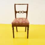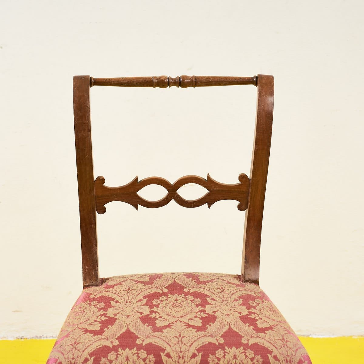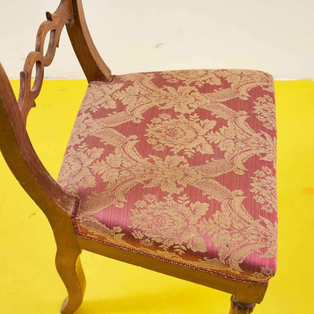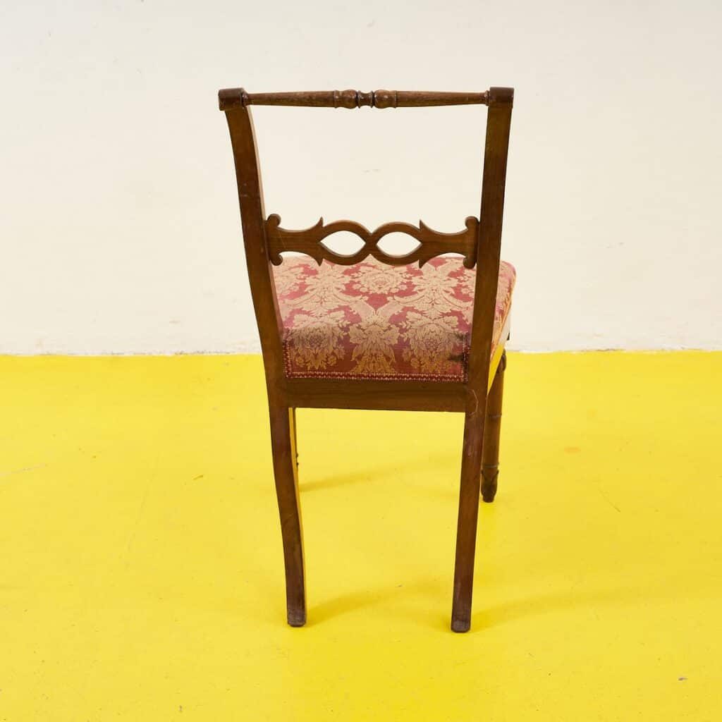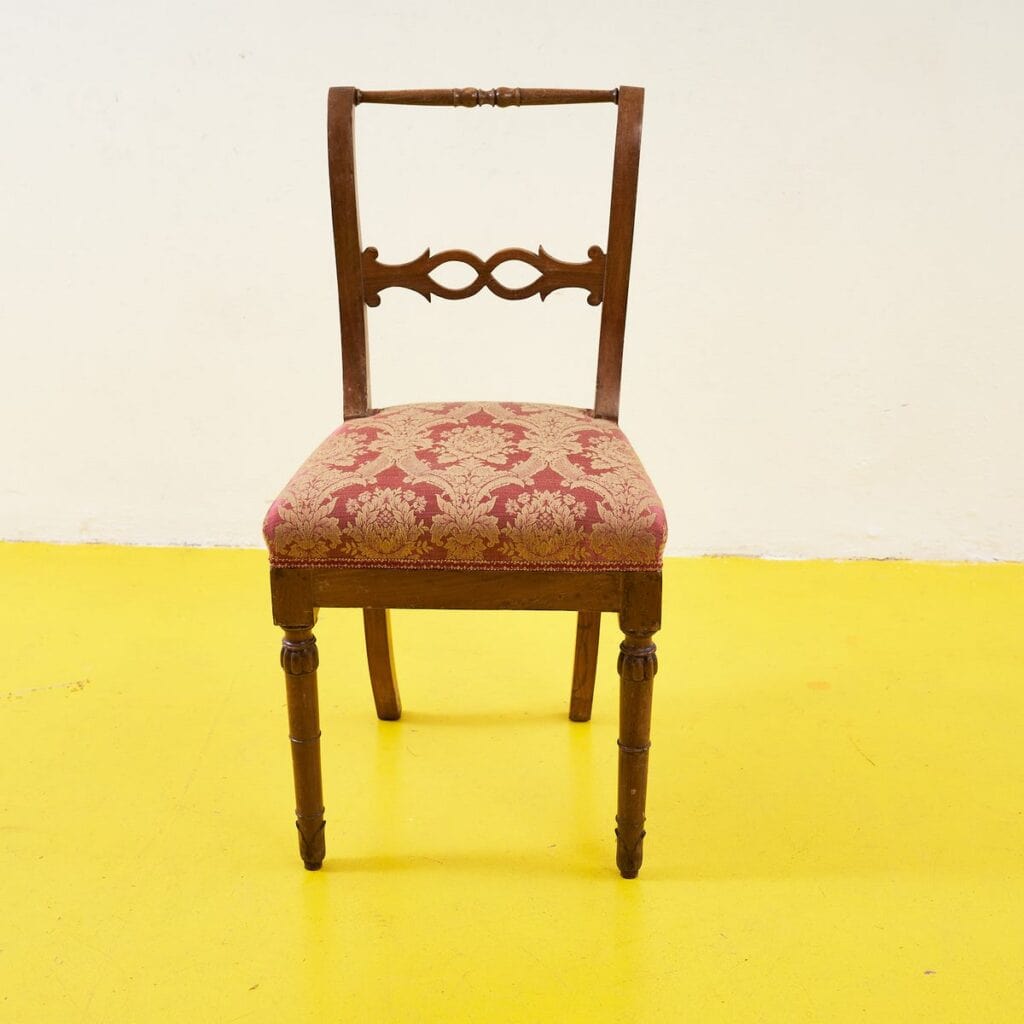 Questa affascinante sedia vintage e' un perfetto esempio di artigianato del passato. Caratterizzata da una struttura in legno robusta e un sedile imbottito con un tessuto floreale rosso e dorato,... Questa affascinante sedia vintage e' un perfetto esempio di artigianato del passato. Caratterizzata da una struttura in legno robusta e un sedile imbottito con un tessuto floreale rosso e dorato, aggiunge un tocco di eleganza a qualsiasi ambiente. Le gambe slanciate e il design raffinato la rendono ideale sia per arredare un soggiorno che una sala da pranzo. La sedia e' in ottime condizioni generali, con lievi segni d'usura che ne testimoniano la storia. Perfetta per chi cerca un pezzo unico e speciale per il proprio arredamento. Altro