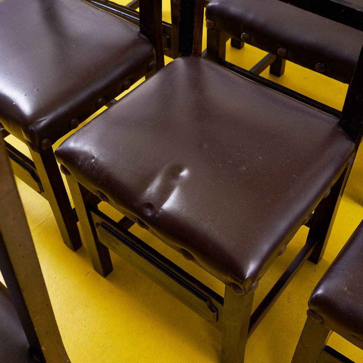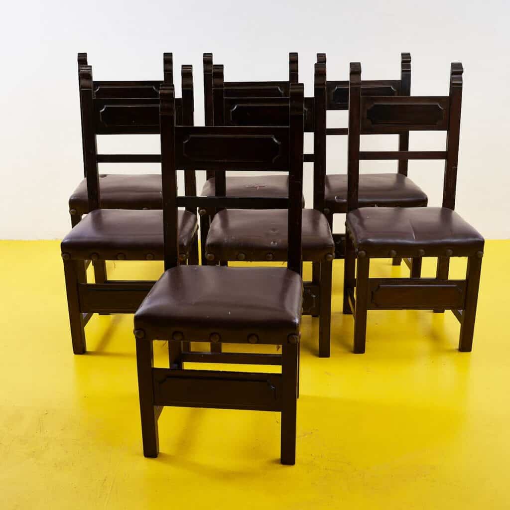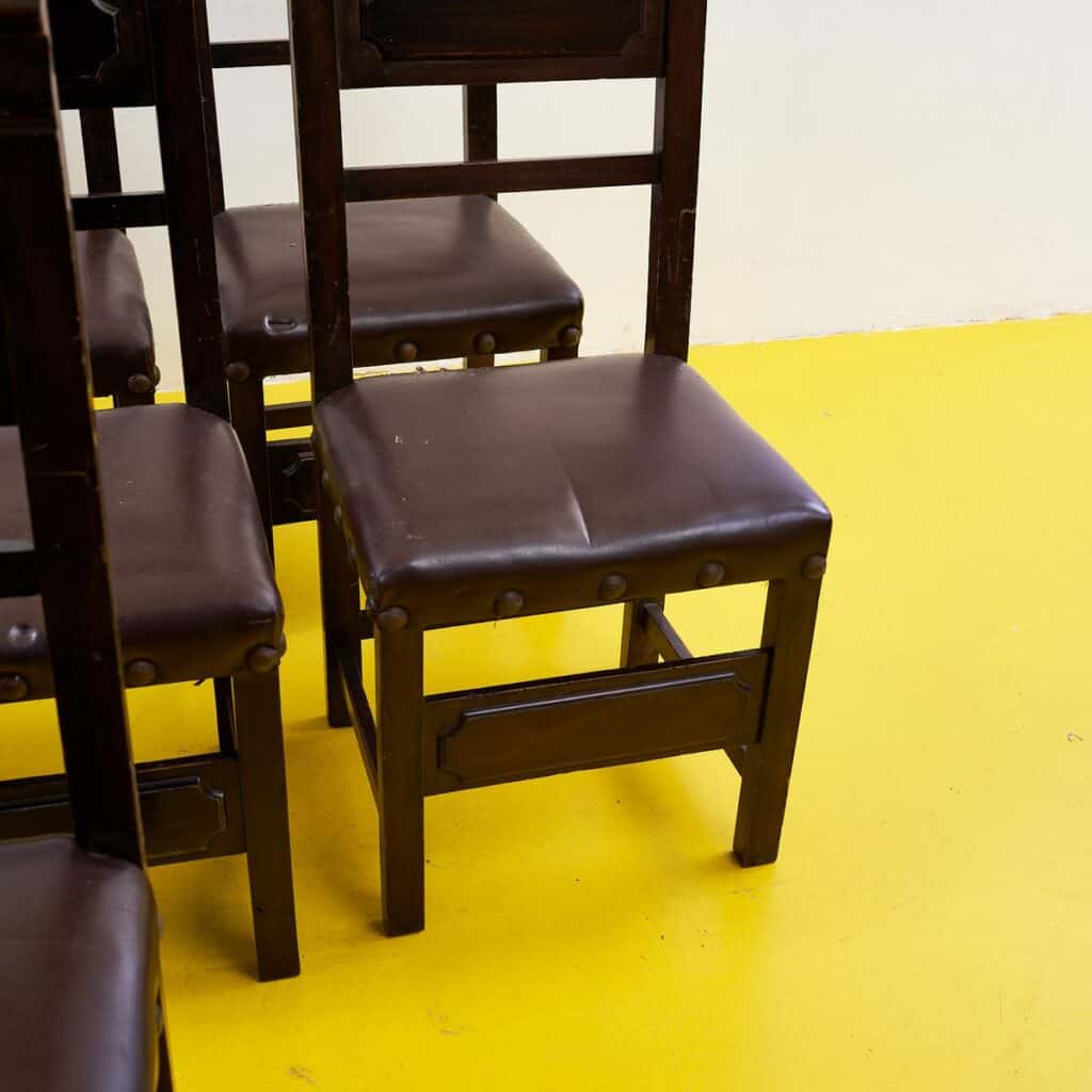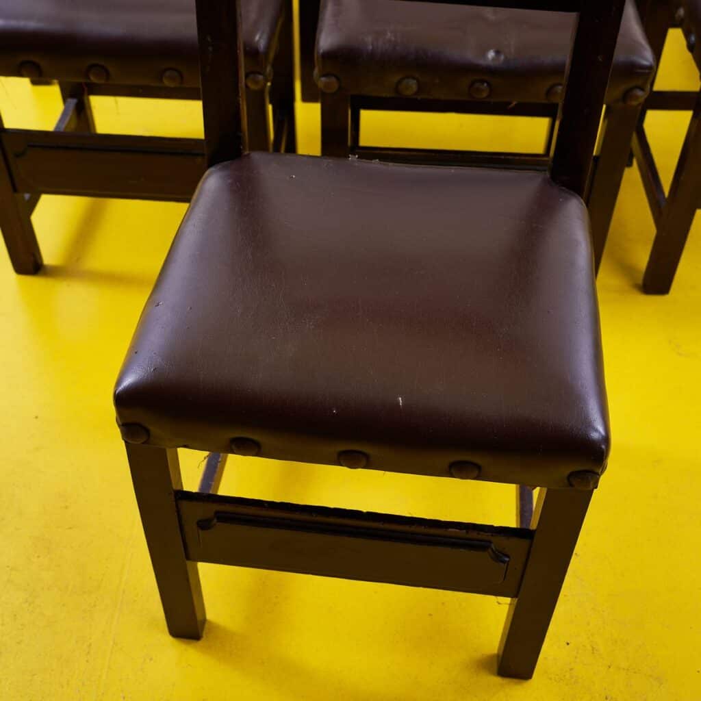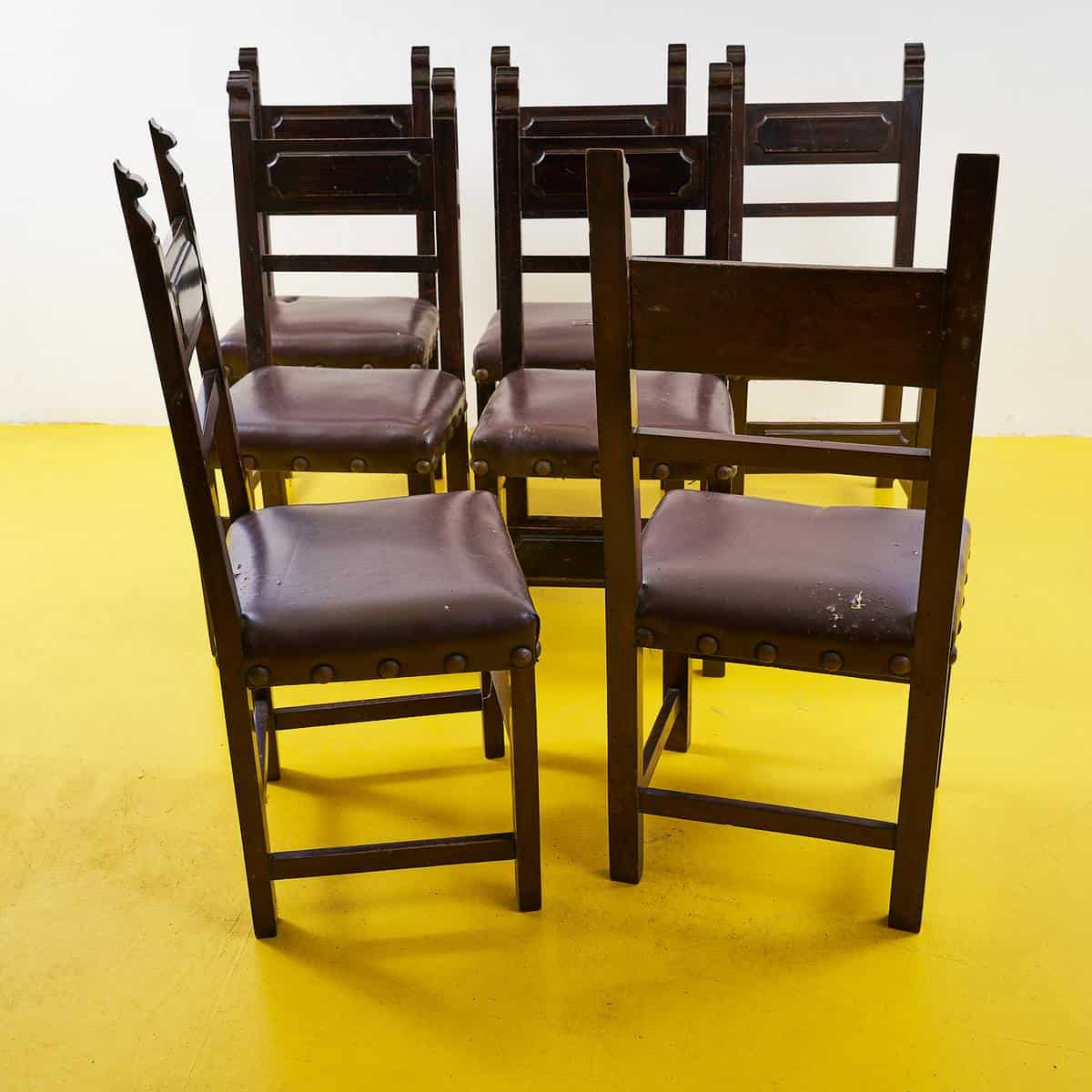 Questo affascinante set di sedie vintage e' perfetto per chi ama lo stile classico con un tocco di nostalgia. Realizzate in legno massello, presentano sedute rivestite in un materiale marrone scu... Questo affascinante set di sedie vintage e' perfetto per chi ama lo stile classico con un tocco di nostalgia. Realizzate in legno massello, presentano sedute rivestite in un materiale marrone scuro, con dettagli artigianali come chiodi decorativi. Sebbene mostrino segni di usura, queste sedie raccontano una storia, rendendole ideali per una cucina rustica o un soggiorno chic. Ogni sedia e' un pezzo unico che puo' aggiungere carattere a qualsiasi ambiente. Con il loro design senza tempo, possono anche essere adattate a spazi moderni, portando un po' di storia e calore in casa tua. Altro