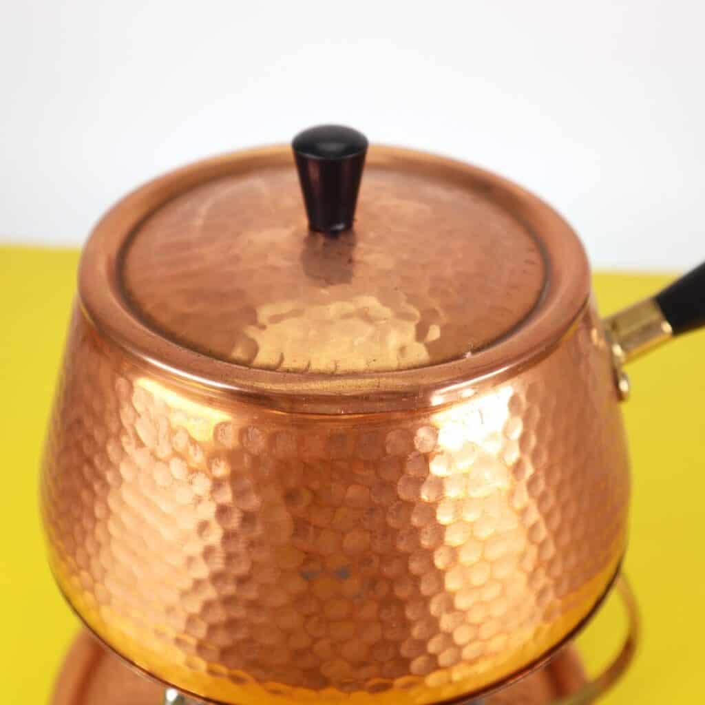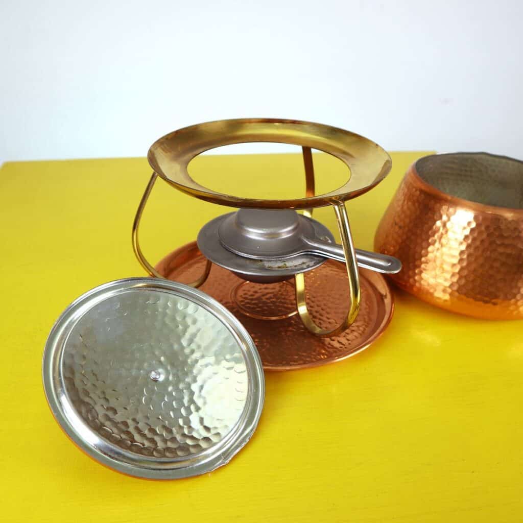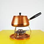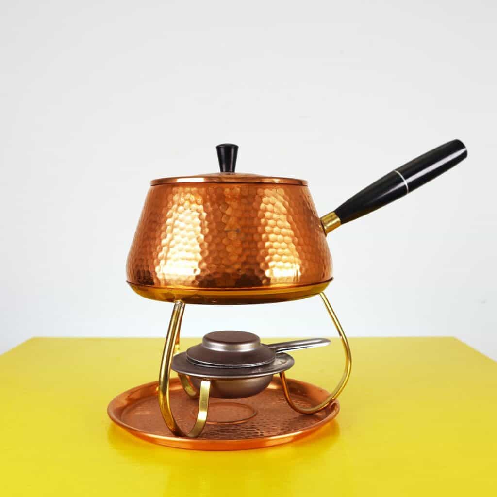 Scopri il fascino intramontabile di questo set per fonduta in rame martellato, un meraviglioso esempio di artigianato del XX secolo. Realizzato con materiali di alta qualità, il set comprende un pento... Scopri il fascino intramontabile di questo set per fonduta in rame martellato, un meraviglioso esempio di artigianato del XX secolo. Realizzato con materiali di alta qualità, il set comprende un pentolino in rame, un supporto in ottone e un bruciatore centrale per mantenere il calore uniforme. Il design martellato dona un tocco distintivo, richiamando lo stile vintage e creando un"atmosfera accogliente per cene o occasioni speciali. Perfettamente conservato, questo set è ideale non solo per gli appassionati di fonduta, ma anche come elemento decorativo che arricchirà qualsiasi cucina o sala da pranzo. Rendi i tuoi momenti conviviali indimenticabili con questo elegante set dal design raffinato e dalla funzionalità impeccabile. Altro