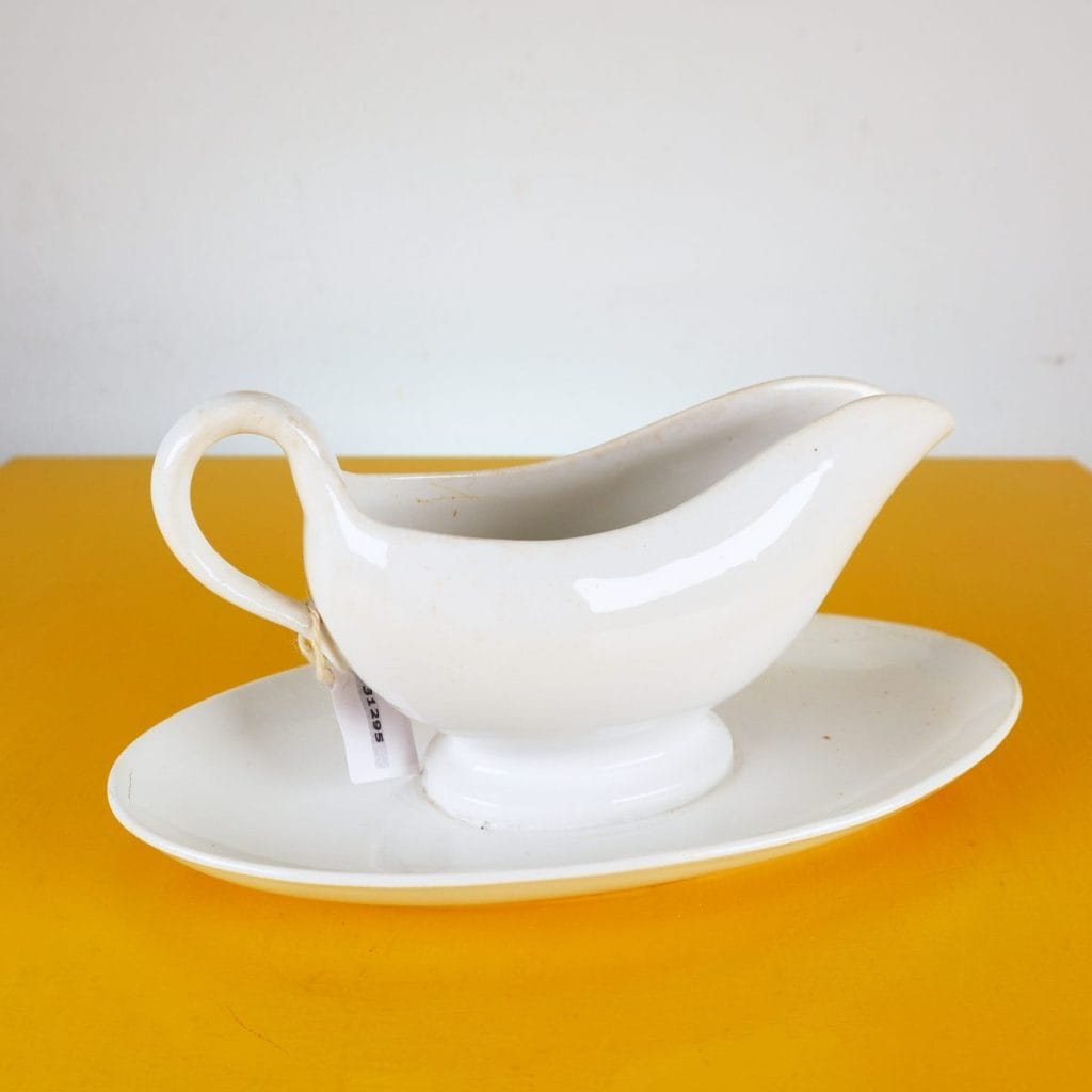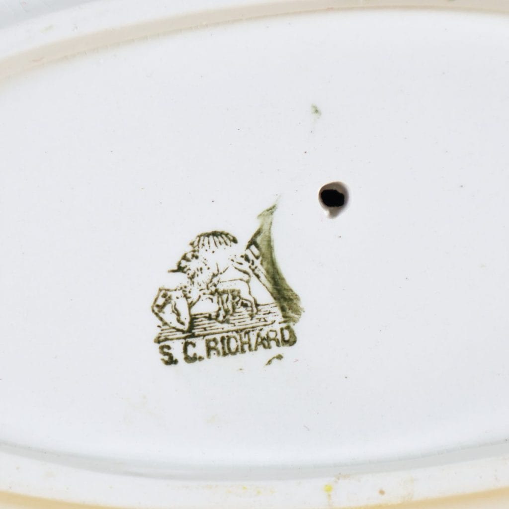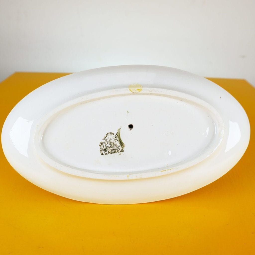 Questa elegante salsiera in porcellana, marchiata S.C. Richard, rappresenta un classico esempio di design raffinato per la tavola. La forma sinuosa e il beccuccio stilizzato ne fanno un pezzo distinti... Questa elegante salsiera in porcellana, marchiata S.C. Richard, rappresenta un classico esempio di design raffinato per la tavola. La forma sinuosa e il beccuccio stilizzato ne fanno un pezzo distintivo, ideale per servire salse e condimenti durante pranzi e cene. Datata presumibilmente a meta' del XX secolo, la salsiera e' realizzata in porcellana bianca, un materiale che conferisce un senso di leggerezza e purezza estetica. Presenta delle lievi imperfezioni dovute all'uso, che ne testimoniano la storia e il fascino vintage. Questa salsiera e' perfetta per completare un servizio da tavola elegante o per essere esposta in una vetrina, conferendo un tocco di classe e tradizione all'ambiente domestico. Altro