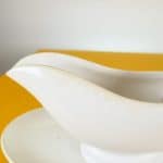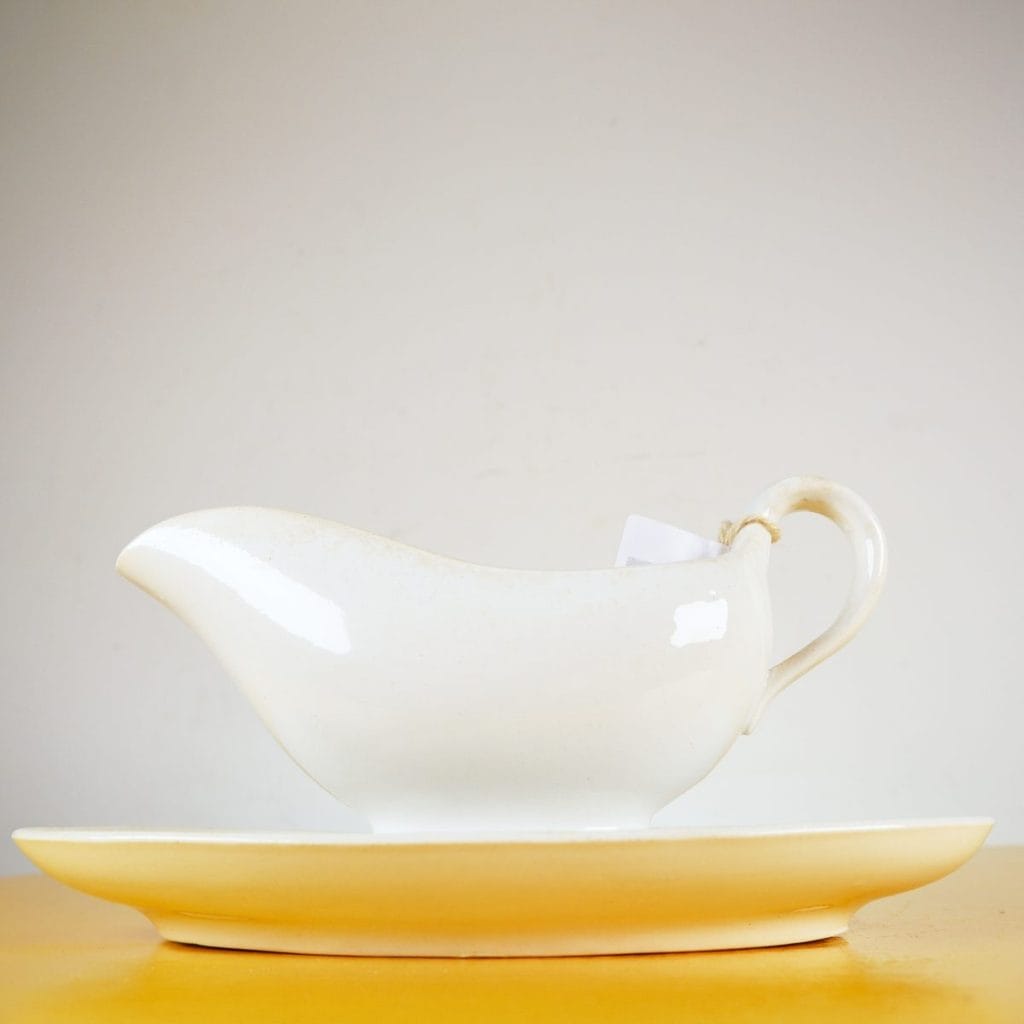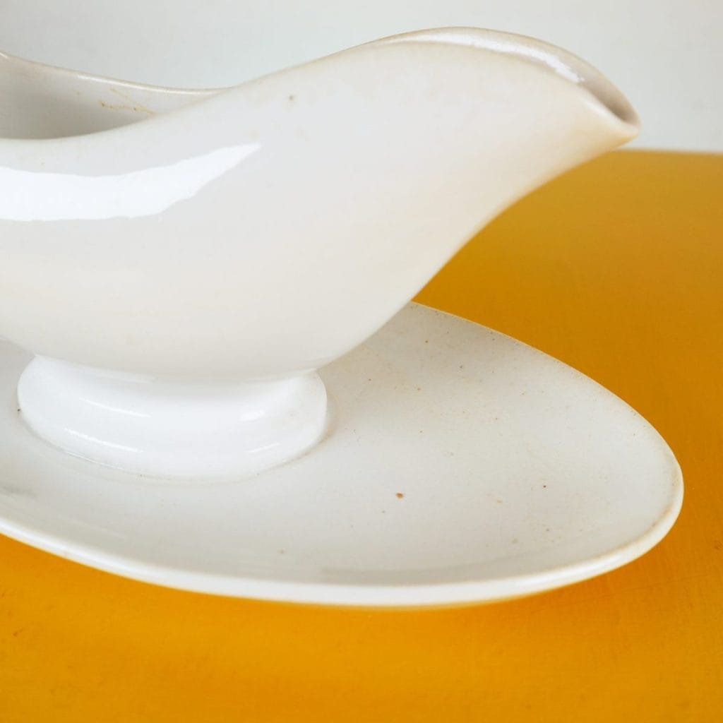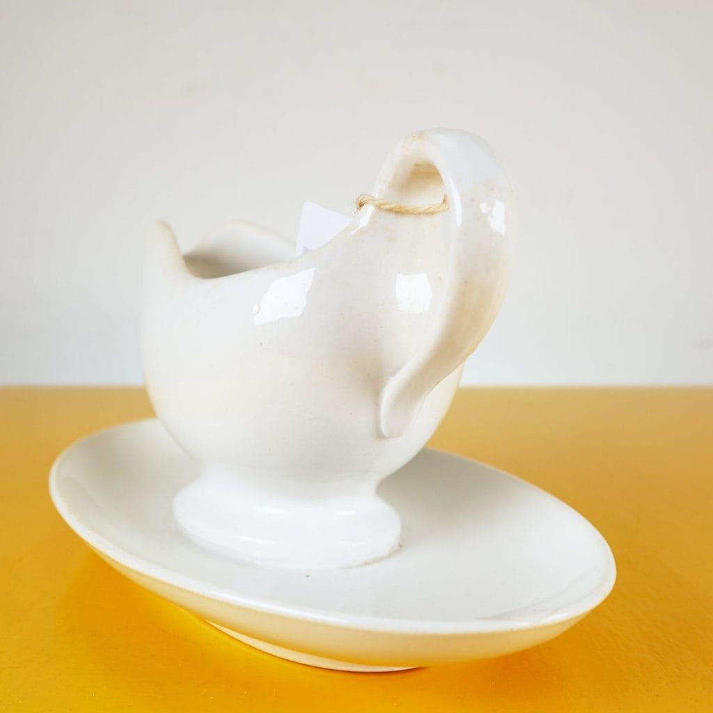 Questa elegante salsiera in porcellana, marchiata S.C. Richard, rappresenta un classico esempio di design raffinato per la tavola. La forma sinuosa e il beccuccio stilizzato ne fanno un pezzo distinti... Questa elegante salsiera in porcellana, marchiata S.C. Richard, rappresenta un classico esempio di design raffinato per la tavola. La forma sinuosa e il beccuccio stilizzato ne fanno un pezzo distintivo, ideale per servire salse e condimenti durante pranzi e cene. Datata presumibilmente a meta' del XX secolo, la salsiera e' realizzata in porcellana bianca, un materiale che conferisce un senso di leggerezza e purezza estetica. Presenta delle lievi imperfezioni dovute all'uso, che ne testimoniano la storia e il fascino vintage. Questa salsiera e' perfetta per completare un servizio da tavola elegante o per essere esposta in una vetrina, conferendo un tocco di classe e tradizione all'ambiente domestico. Altro
