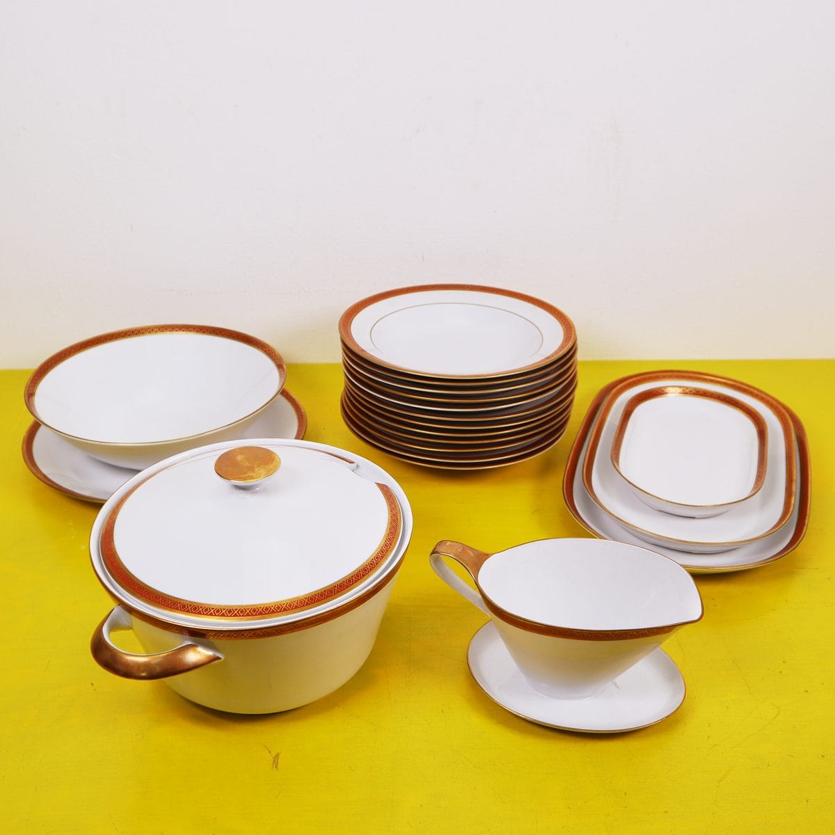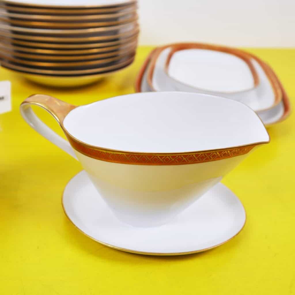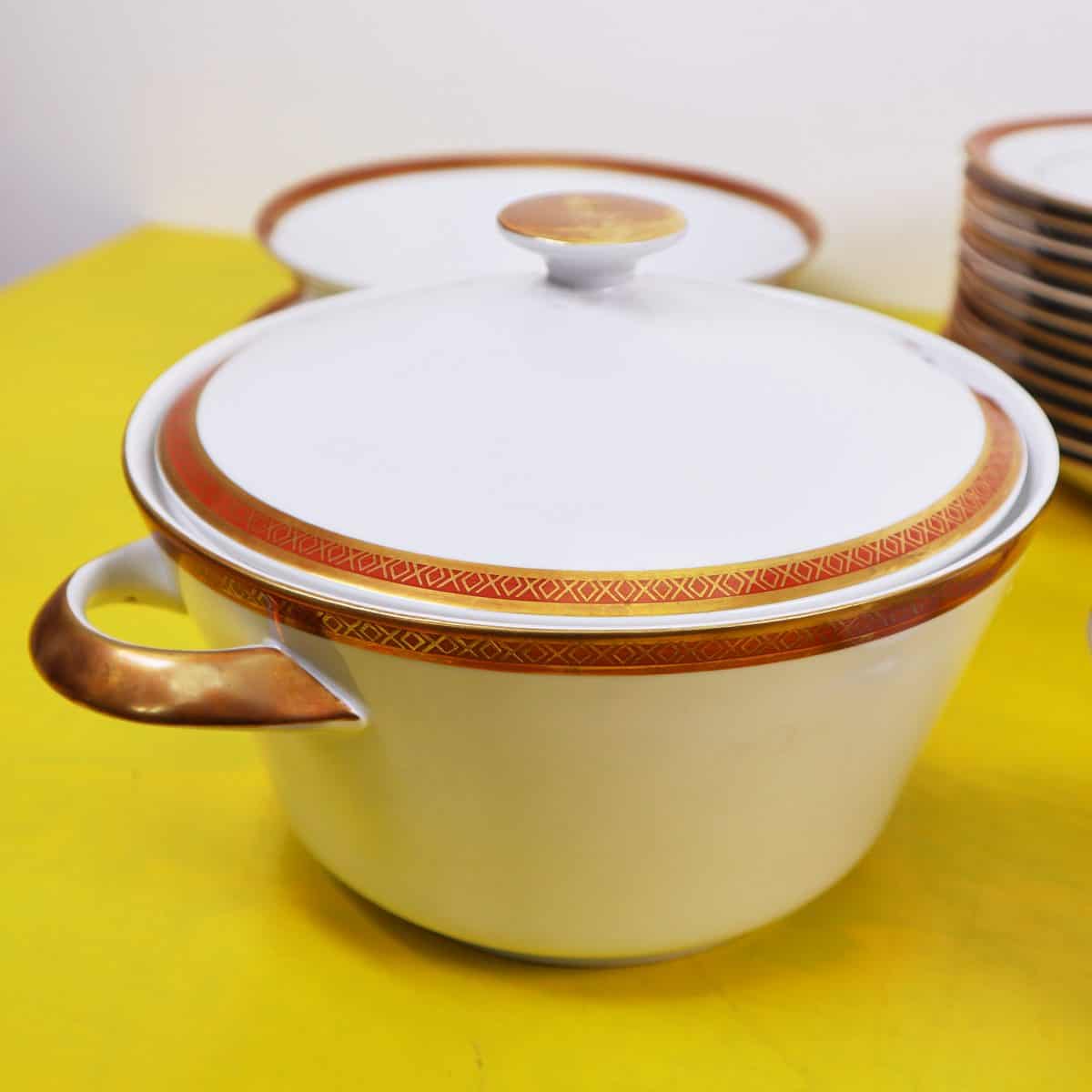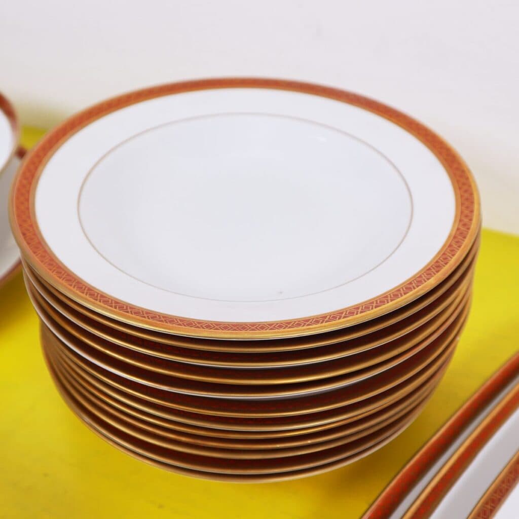 - il servizio comprende 1 zuppiera, 1 terrina, 1 salsiera, 1 piatto da portata, 3 piatti ovali da portata, 12 piatti fondi
