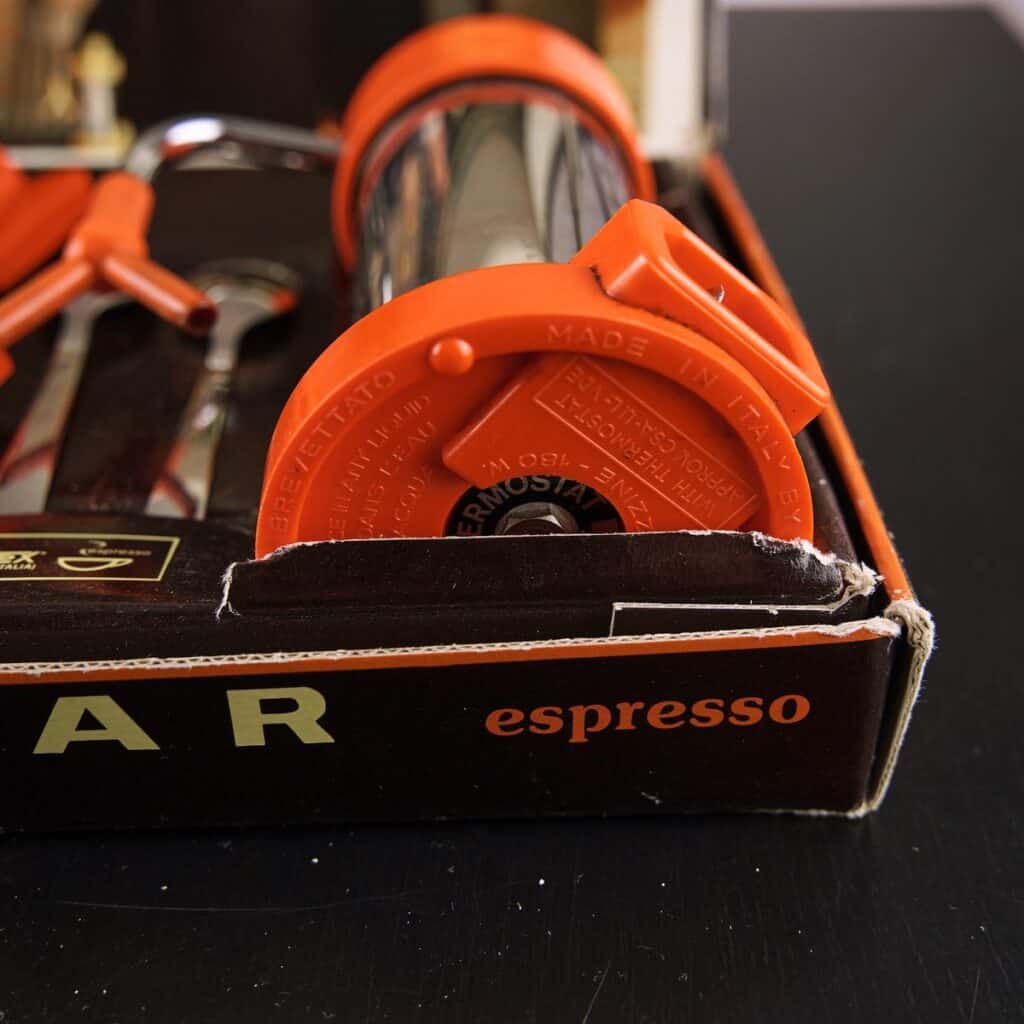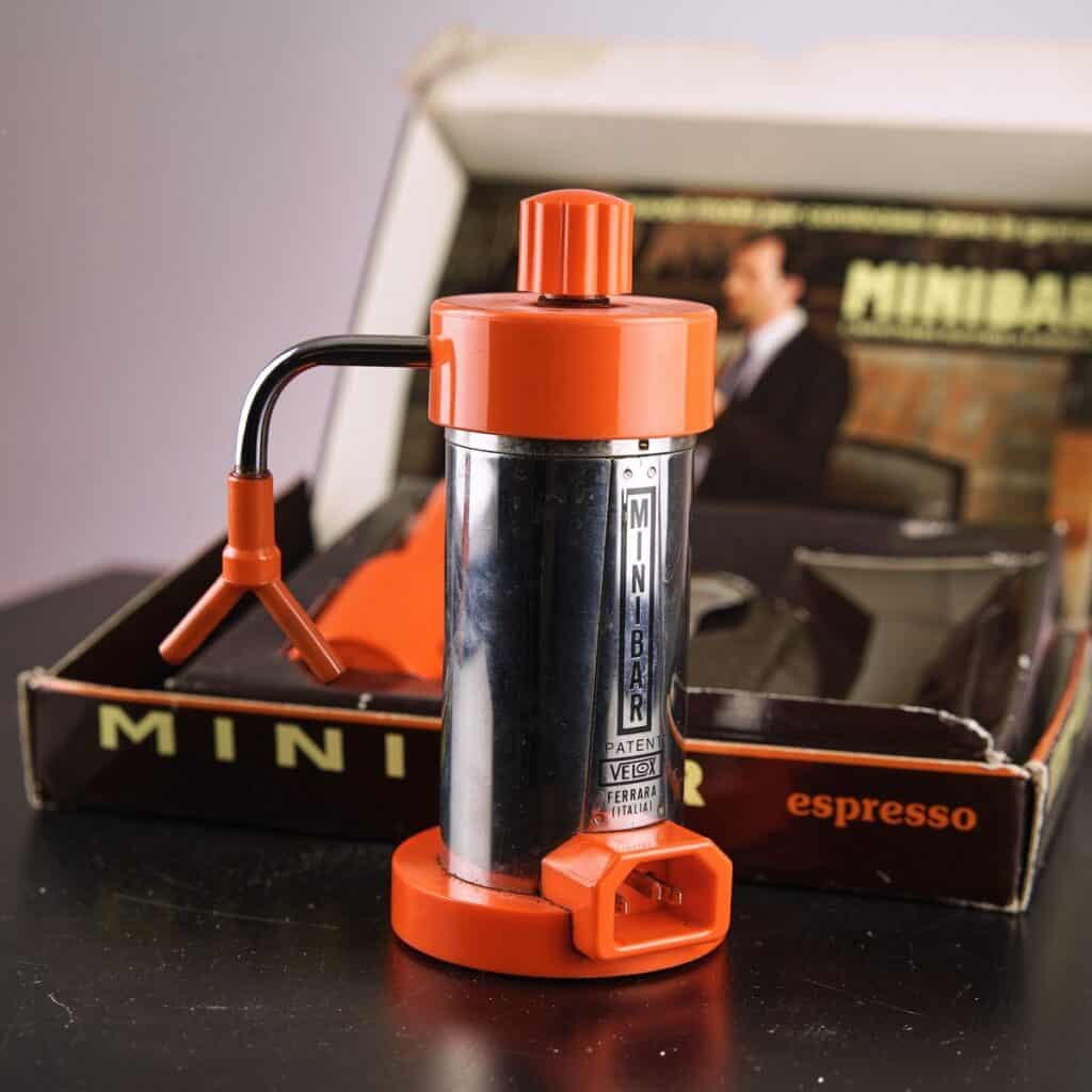 Caffettiera elettrica da viaggio anni ’70 prodotta da Velox e realizzata in acciaio inossidabile cromato e plastica di colore arancione.