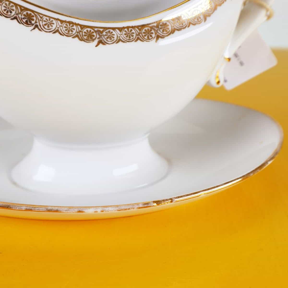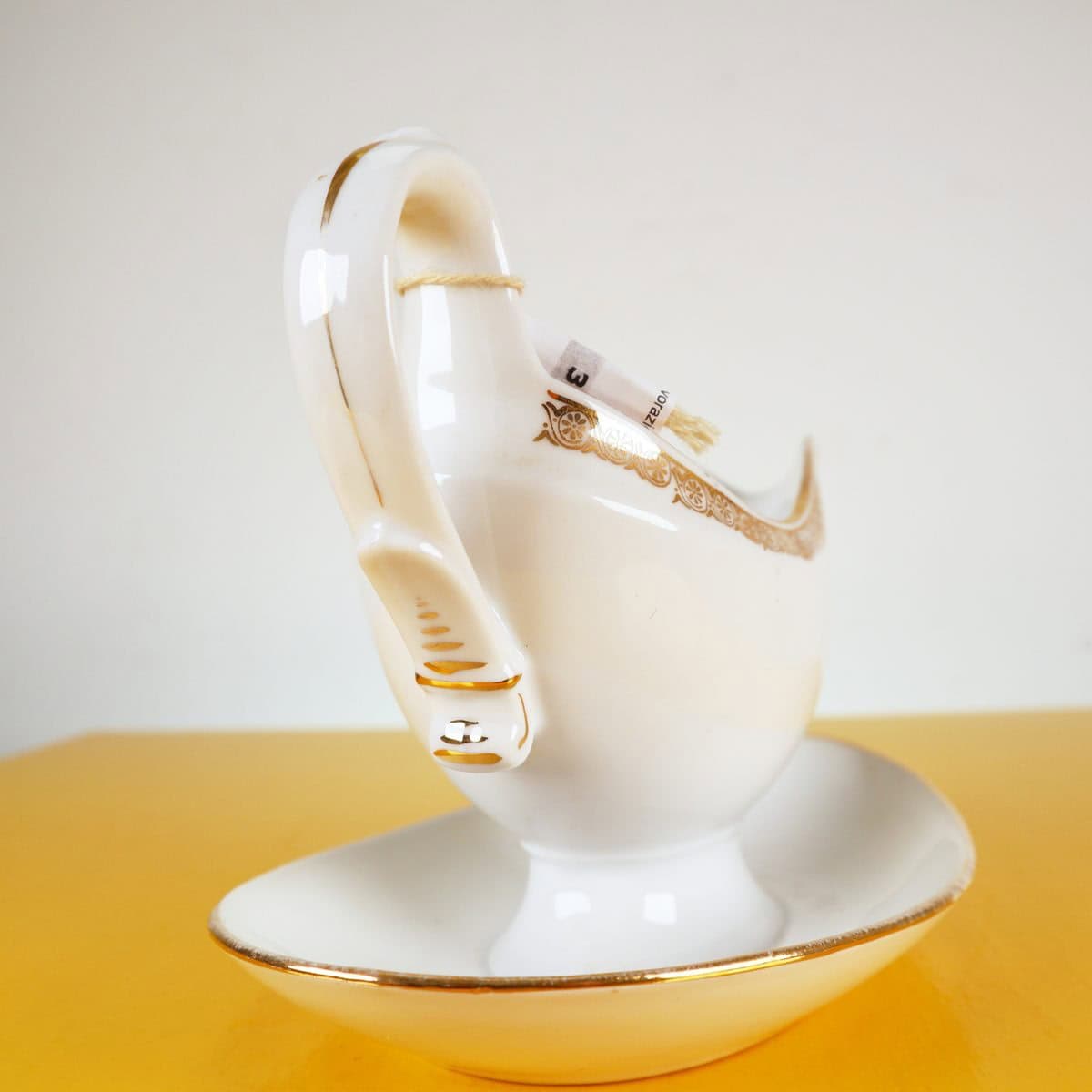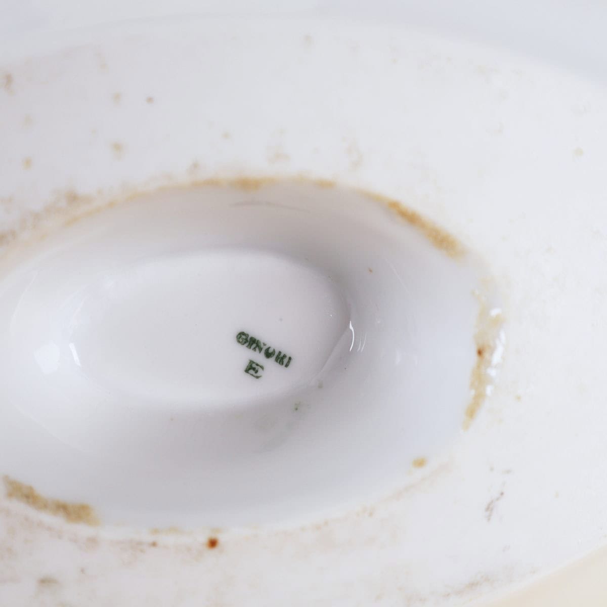 Scopri l'incanto di questa salsiera Ginori, realizzata in pregiata porcellana perfetta per arricchire la tua tavola. Caratterizzata da un design elegante e sinuoso, questa salsiera presenta una d... Scopri l'incanto di questa salsiera Ginori, realizzata in pregiata porcellana perfetta per arricchire la tua tavola. Caratterizzata da un design elegante e sinuoso, questa salsiera presenta una decorazione dorata che si estende lungo il bordo, conferendo un tocco di lusso e raffinatezza. Di epoca vintage, e' ideale per servire salse e condimenti durante pranzi e cene in occasioni speciali. La sua base robusta e il delicato manico garantiscono praticita' e comfort nell'uso. Anche se puo' presentare lievi segni d'uso, la sua bellezza rimane intatta, rendendola un pezzo distintivo per gli amanti del design e dell'arte della tavola. Altro
