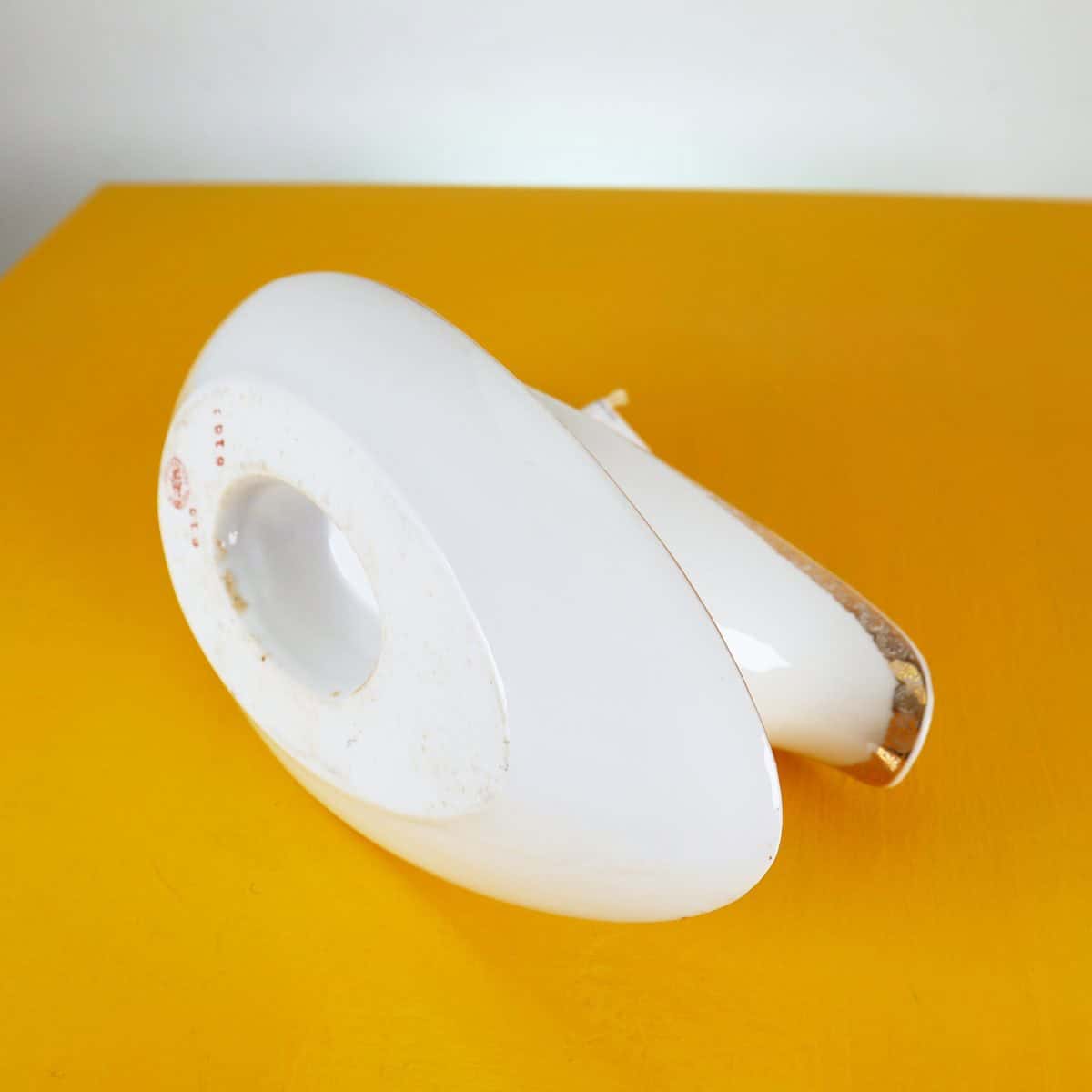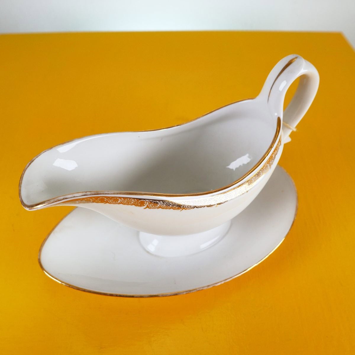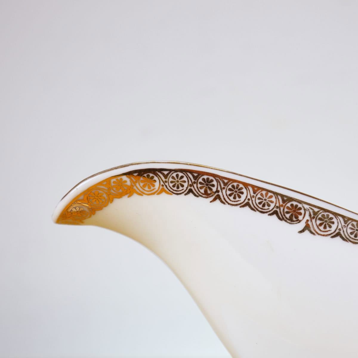 Scopri l'incanto di questa salsiera Ginori, realizzata in pregiata porcellana perfetta per arricchire la tua tavola. Caratterizzata da un design elegante e sinuoso, questa salsiera presenta una d... Scopri l'incanto di questa salsiera Ginori, realizzata in pregiata porcellana perfetta per arricchire la tua tavola. Caratterizzata da un design elegante e sinuoso, questa salsiera presenta una decorazione dorata che si estende lungo il bordo, conferendo un tocco di lusso e raffinatezza. Di epoca vintage, e' ideale per servire salse e condimenti durante pranzi e cene in occasioni speciali. La sua base robusta e il delicato manico garantiscono praticita' e comfort nell'uso. Anche se puo' presentare lievi segni d'uso, la sua bellezza rimane intatta, rendendola un pezzo distintivo per gli amanti del design e dell'arte della tavola. Altro