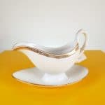 Scopri l'incanto di questa salsiera Ginori, realizzata in pregiata porcellana perfetta per arricchire la tua tavola. Caratterizzata da un design elegante e sinuoso, questa salsiera presenta una d... Scopri l'incanto di questa salsiera Ginori, realizzata in pregiata porcellana perfetta per arricchire la tua tavola. Caratterizzata da un design elegante e sinuoso, questa salsiera presenta una decorazione dorata che si estende lungo il bordo, conferendo un tocco di lusso e raffinatezza. Di epoca vintage, e' ideale per servire salse e condimenti durante pranzi e cene in occasioni speciali. La sua base robusta e il delicato manico garantiscono praticita' e comfort nell'uso. Anche se puo' presentare lievi segni d'uso, la sua bellezza rimane intatta, rendendola un pezzo distintivo per gli amanti del design e dell'arte della tavola. Altro