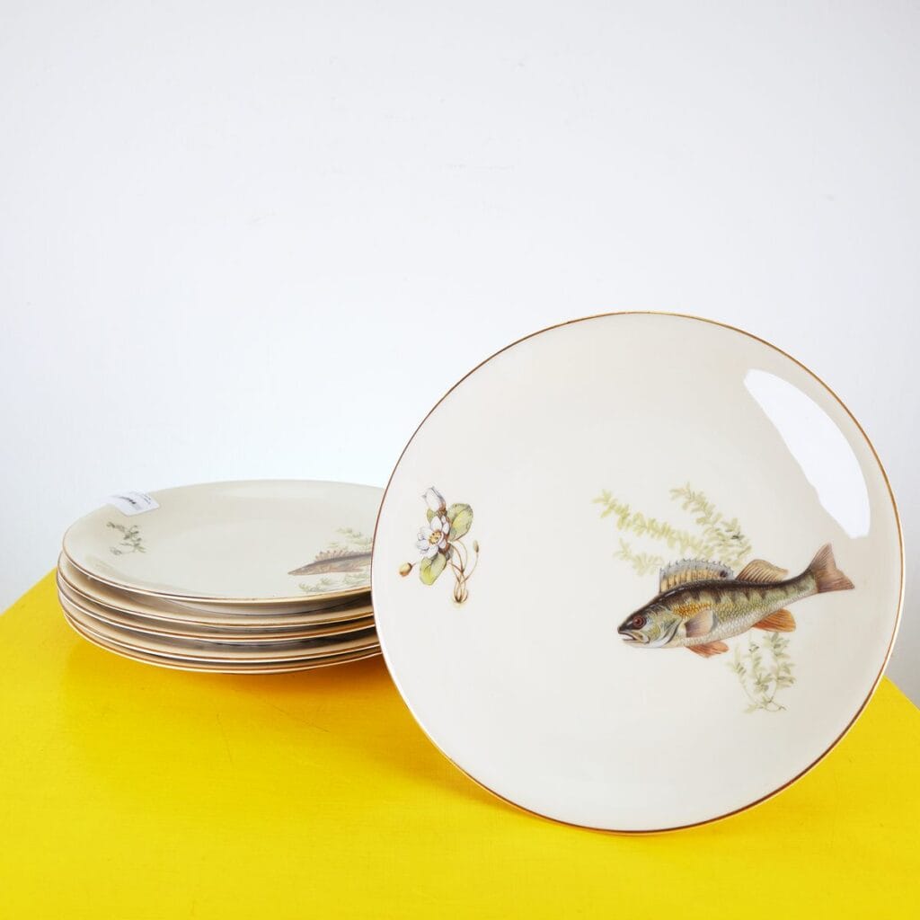 piatti piani in porcellana zeh scherzer bavaria germany 6 pezzi, decoro pesce