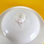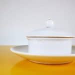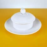 Questo elegante piatto da portata con coperchio e' un esempio raffinato della porcellana Ginori, perfetto per aggiungere un tocco di classe alla tua tavola. Caratterizzata da una finitura bianca ... Questo elegante piatto da portata con coperchio e' un esempio raffinato della porcellana Ginori, perfetto per aggiungere un tocco di classe alla tua tavola. Caratterizzata da una finitura bianca lucida, la sua semplicita' e' accentuata da un delicato bordo dorato. Il coperchio, decorato con un dettaglio floreale in rilievo, offre una funzionalita' con stile, rendendo questo pezzo ideale per servire antipasti o dessert. Nonostante la sua bellezza, il piatto presenta alcune lievi imperfezioni dovute all'uso, conferendogli un fascino vintage distintivo. Un accessorio perfetto per cene eleganti o decorazioni domestiche. Altro